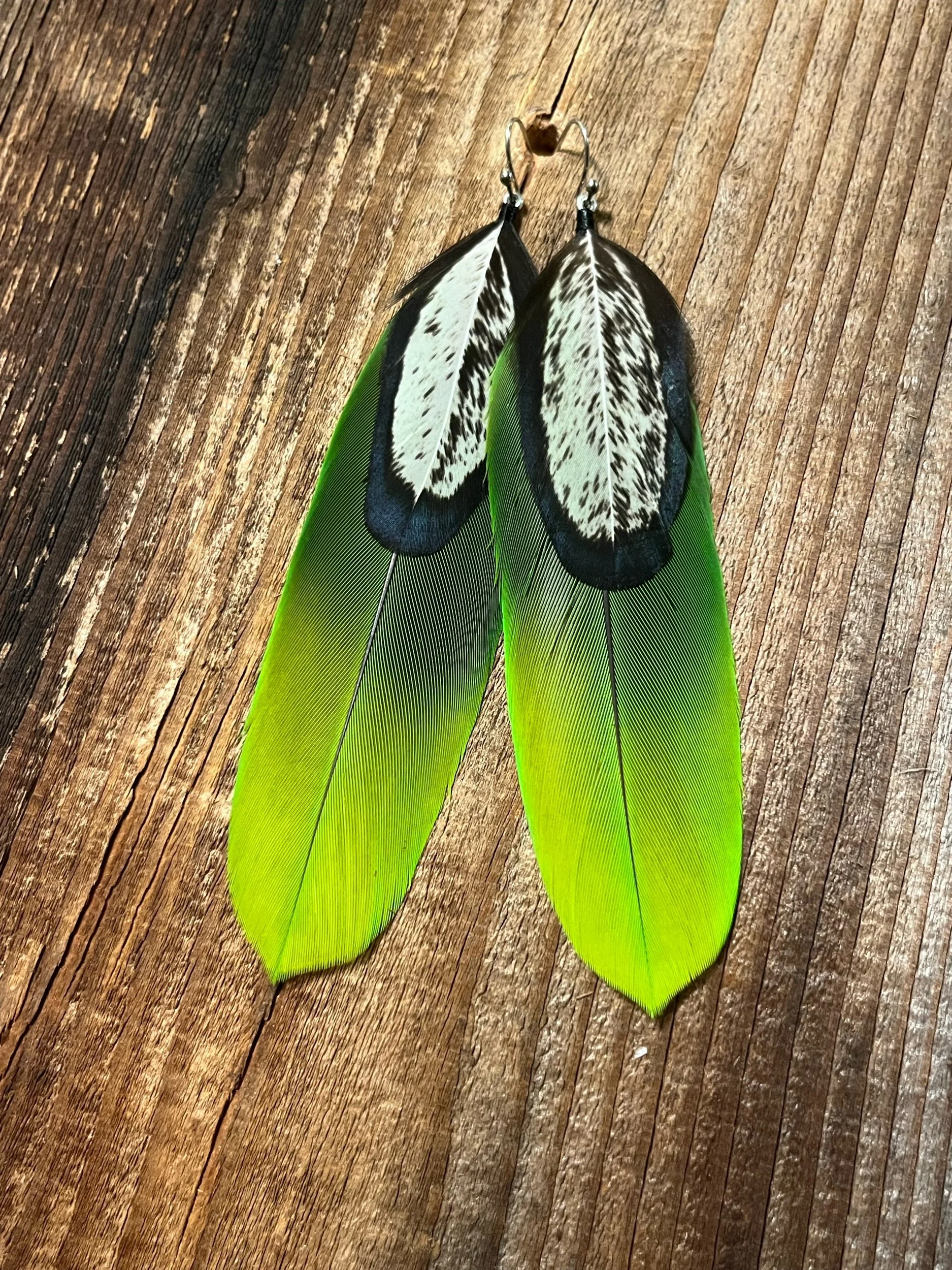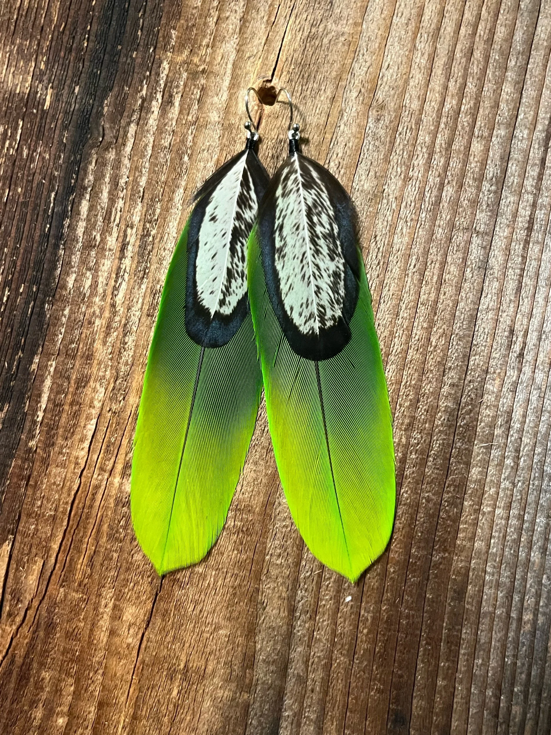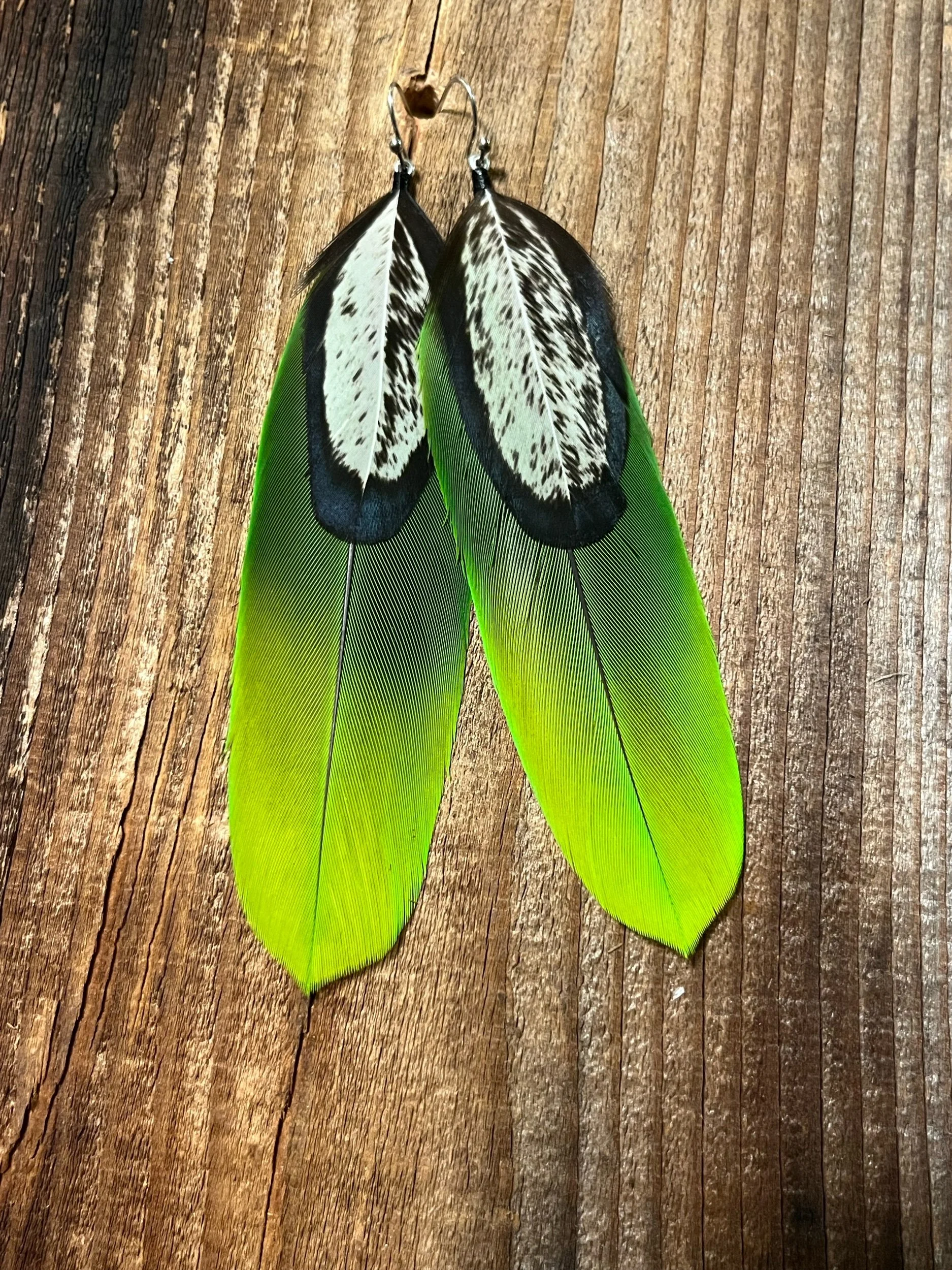 Earrings › Parrot Image 1 of 3 Image 2 of 3 Image 3 of 3 Parrot Sale Price: $55.00 Original Price: $63.00 Amazon green parrot feather earrings in magnificent chartreuse green with black and white speckled Rooster feathers. Add To Cart Added! Amazon green parrot feather earrings in magnificent chartreuse green with black and white speckled Rooster feathers.