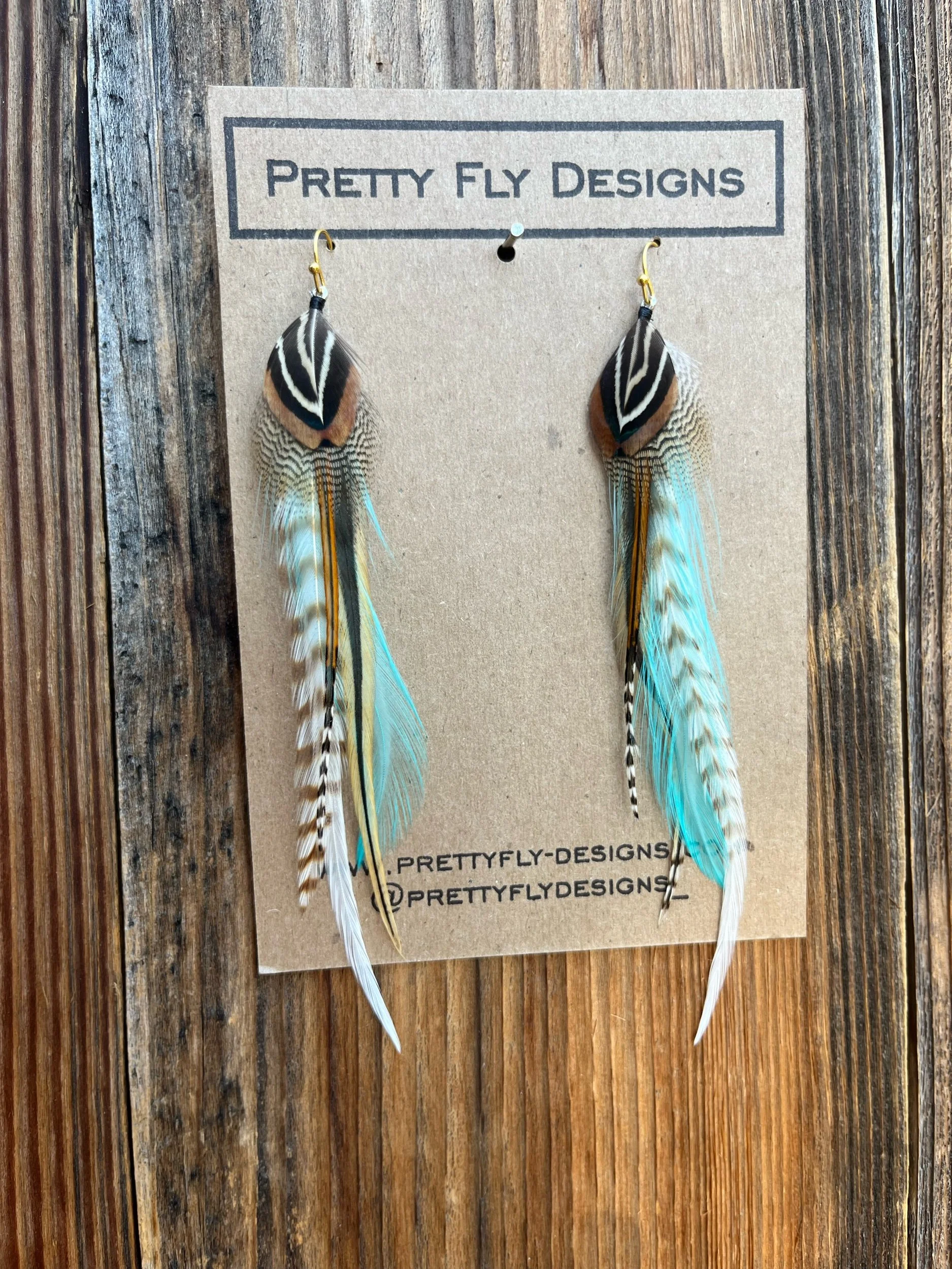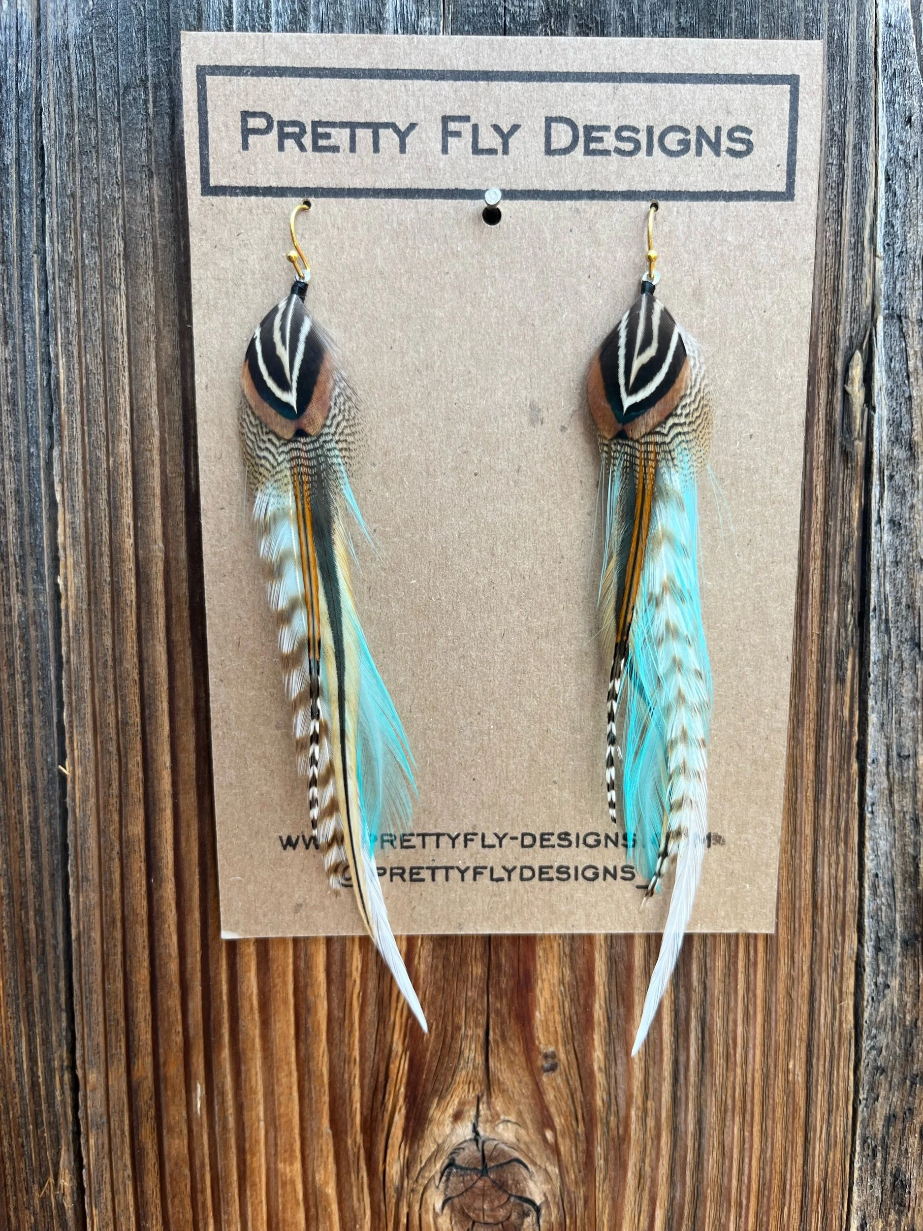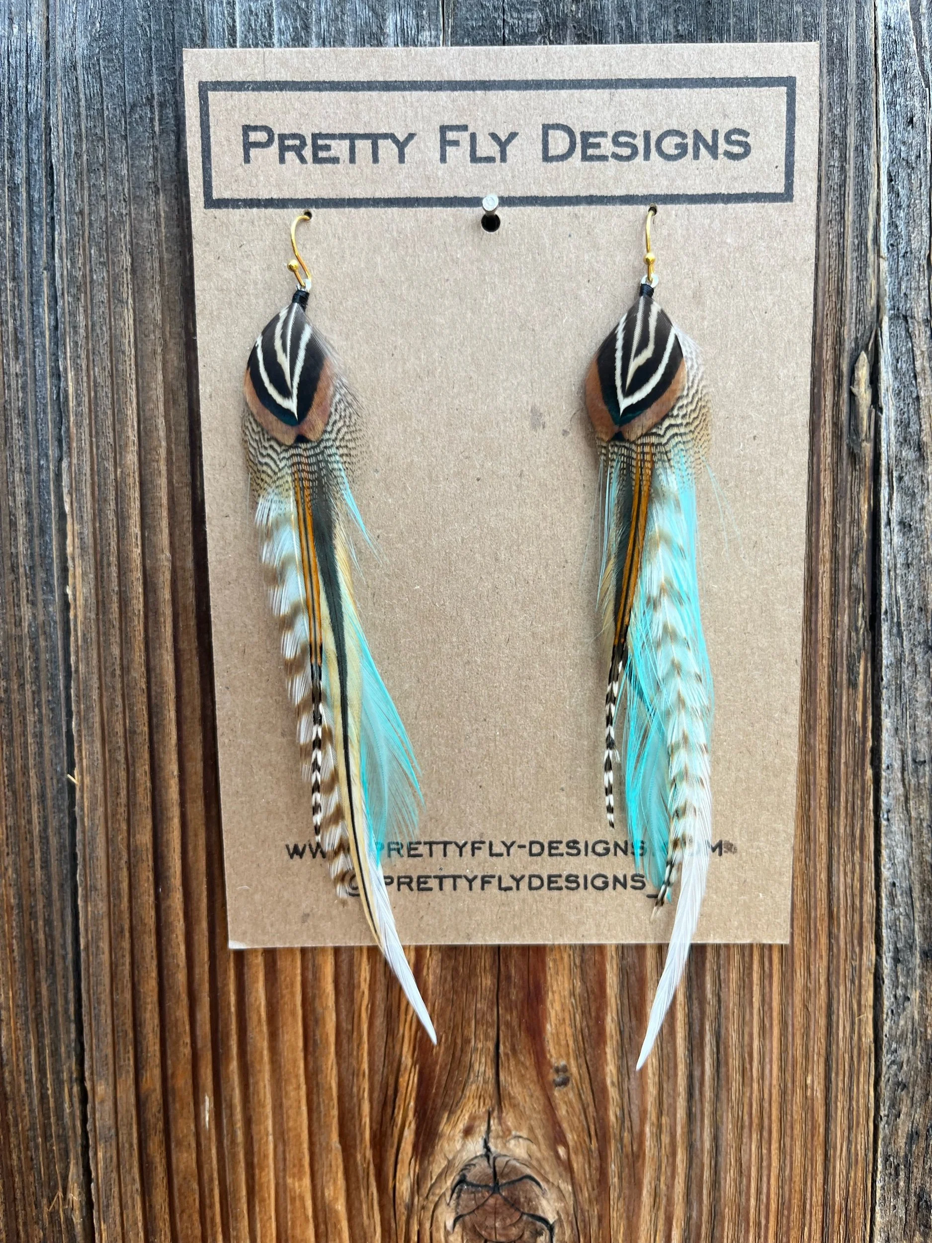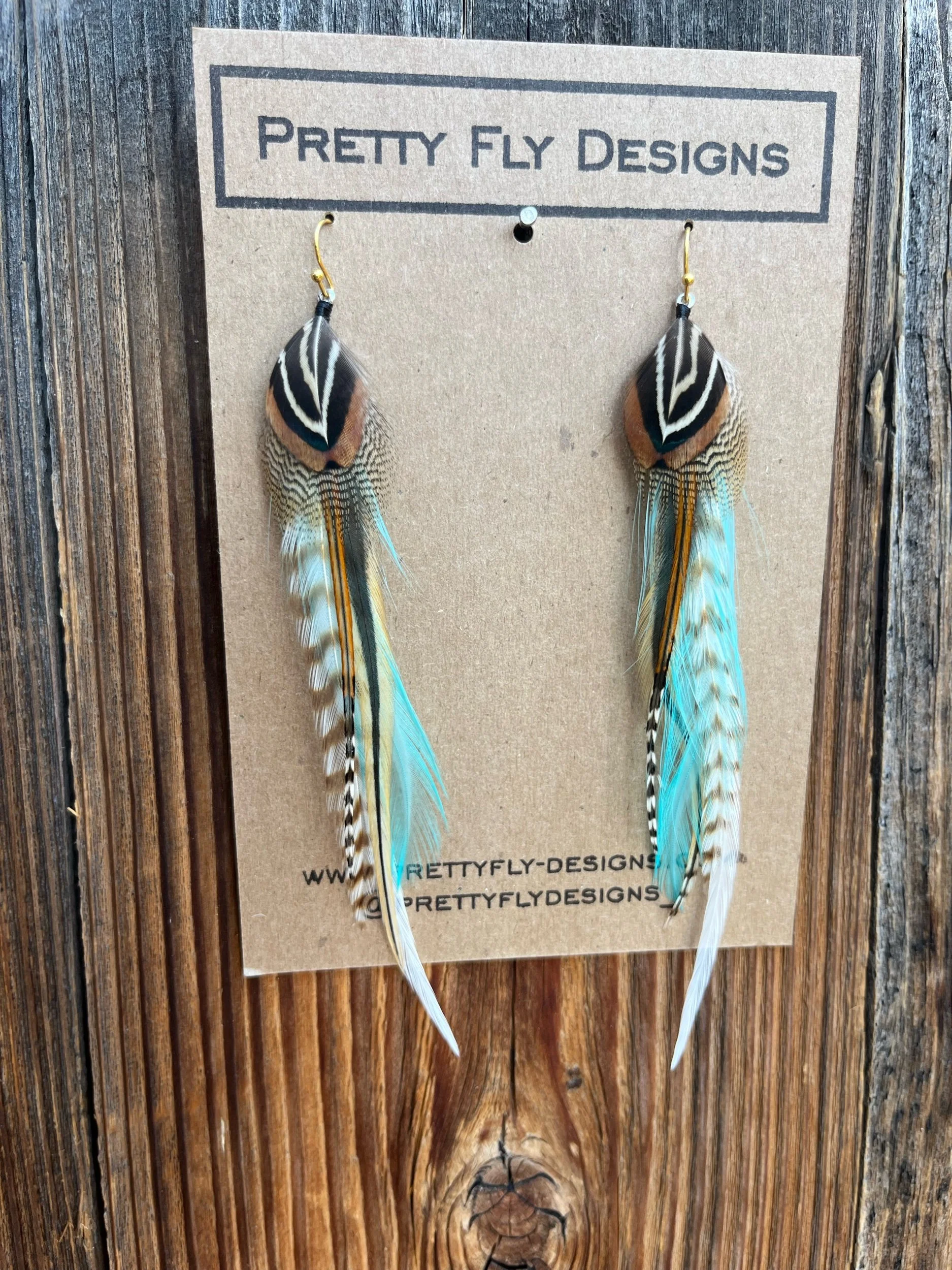 Earrings › Angela Image 1 of 4 Image 2 of 4 Image 3 of 4 Image 4 of 4 Angela $43.00 Four and a half inch long western blend! These really pop! Tied with Rooster, Duck and Ringneck Pheasant feathers. Add To Cart Added! Four and a half inch long western blend! These really pop! Tied with Rooster, Duck and Ringneck Pheasant feathers.