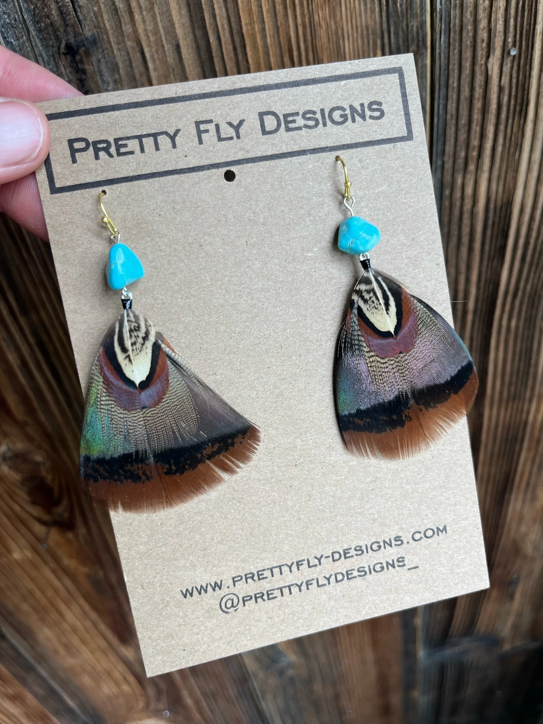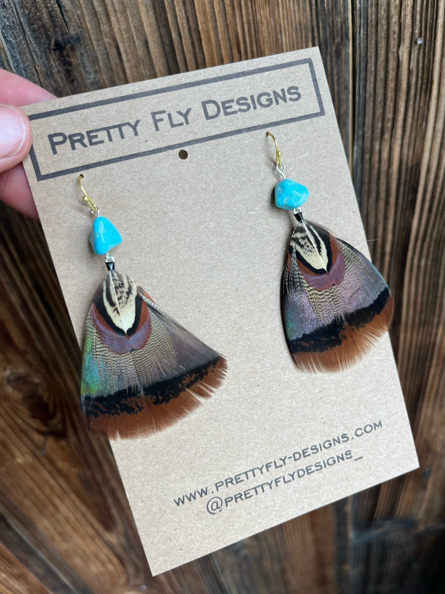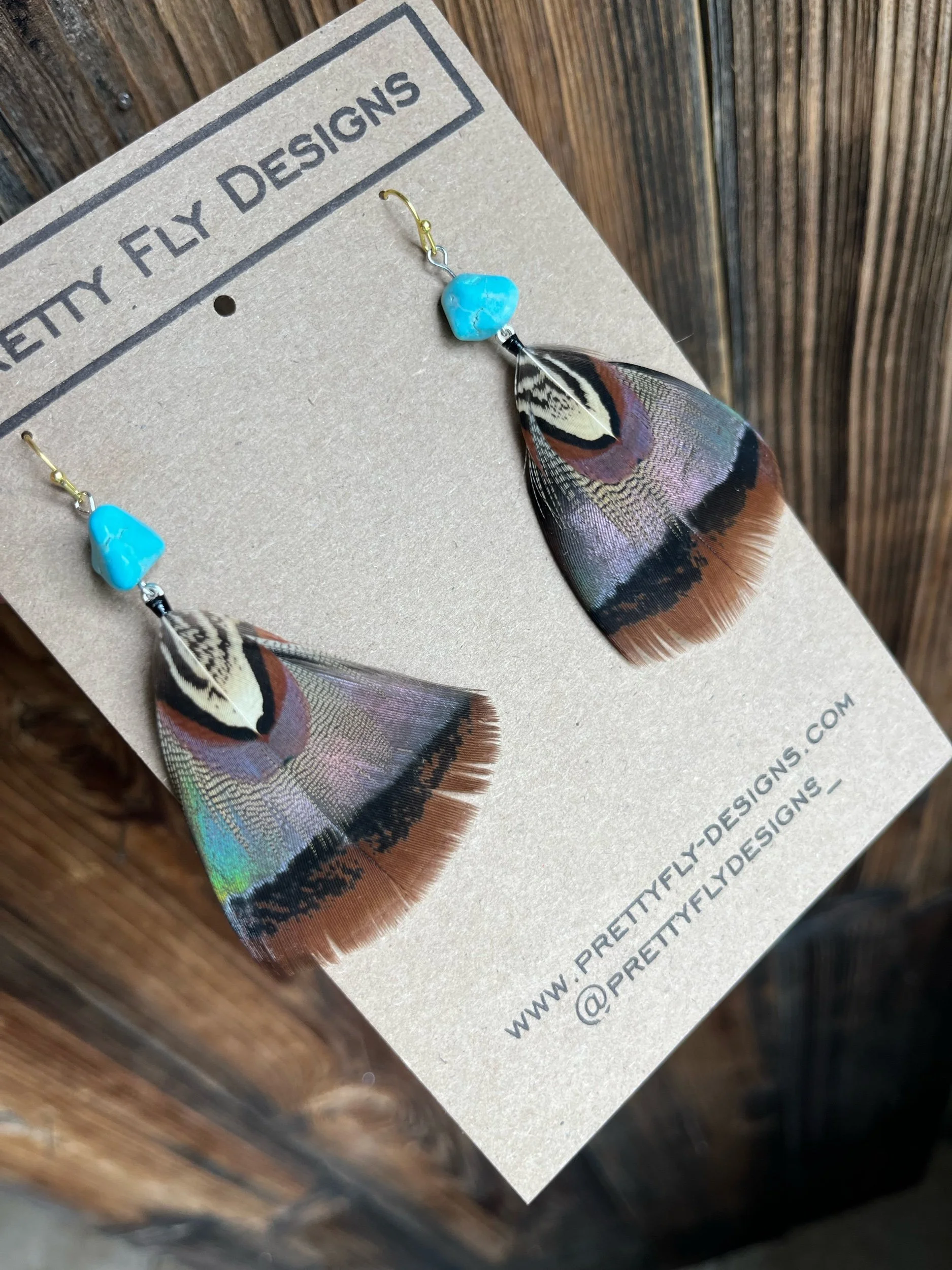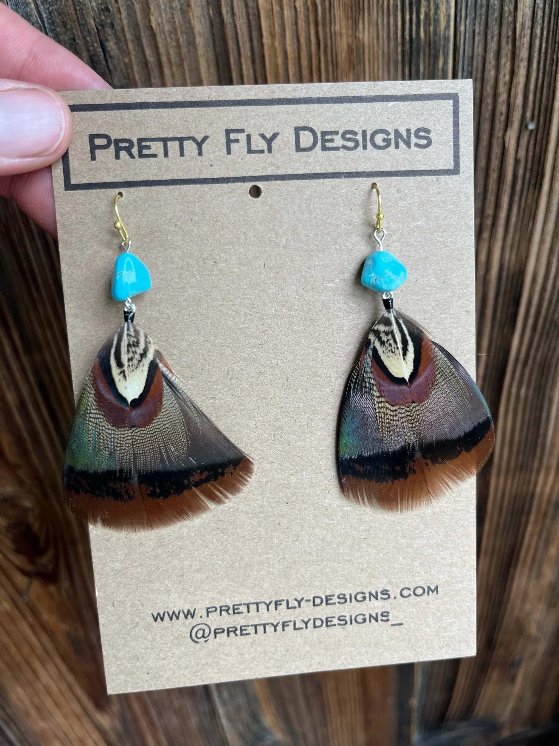 Virginia Turkey with a very cool natural sheen! Matched with Wood Duck and Ringneck Pheasant overlay feathers. Turquoise colored stones. Three inch overall length.
