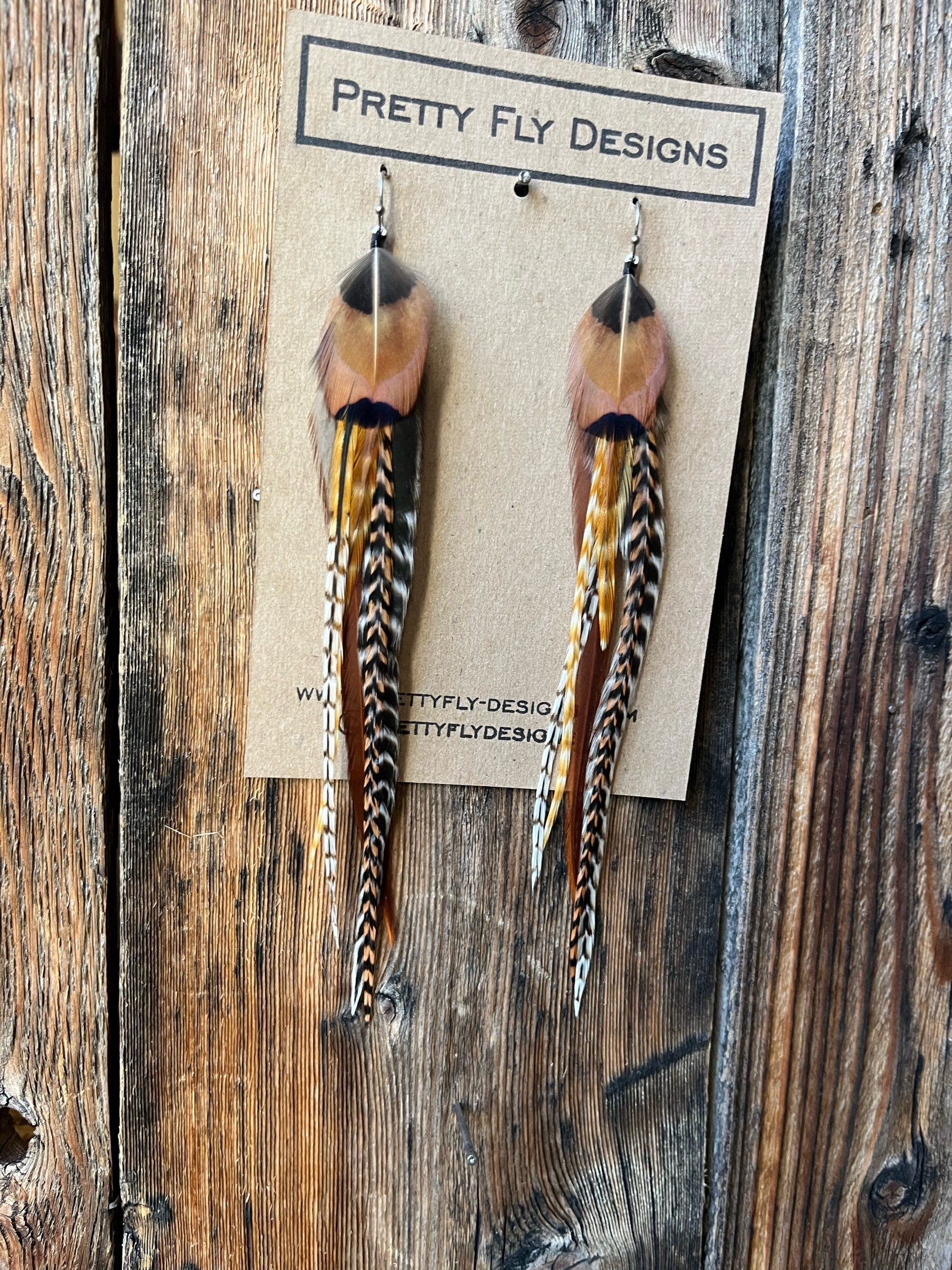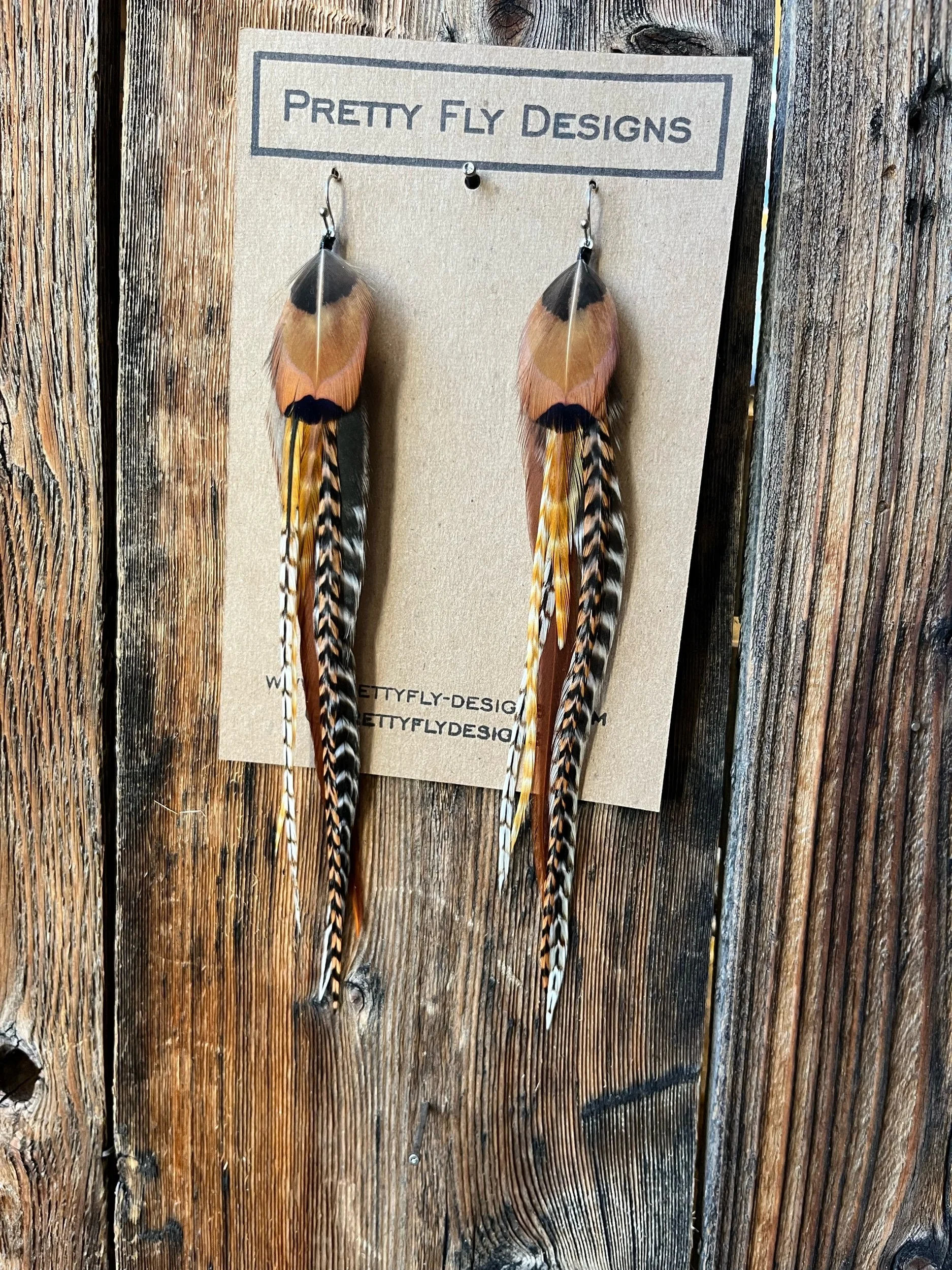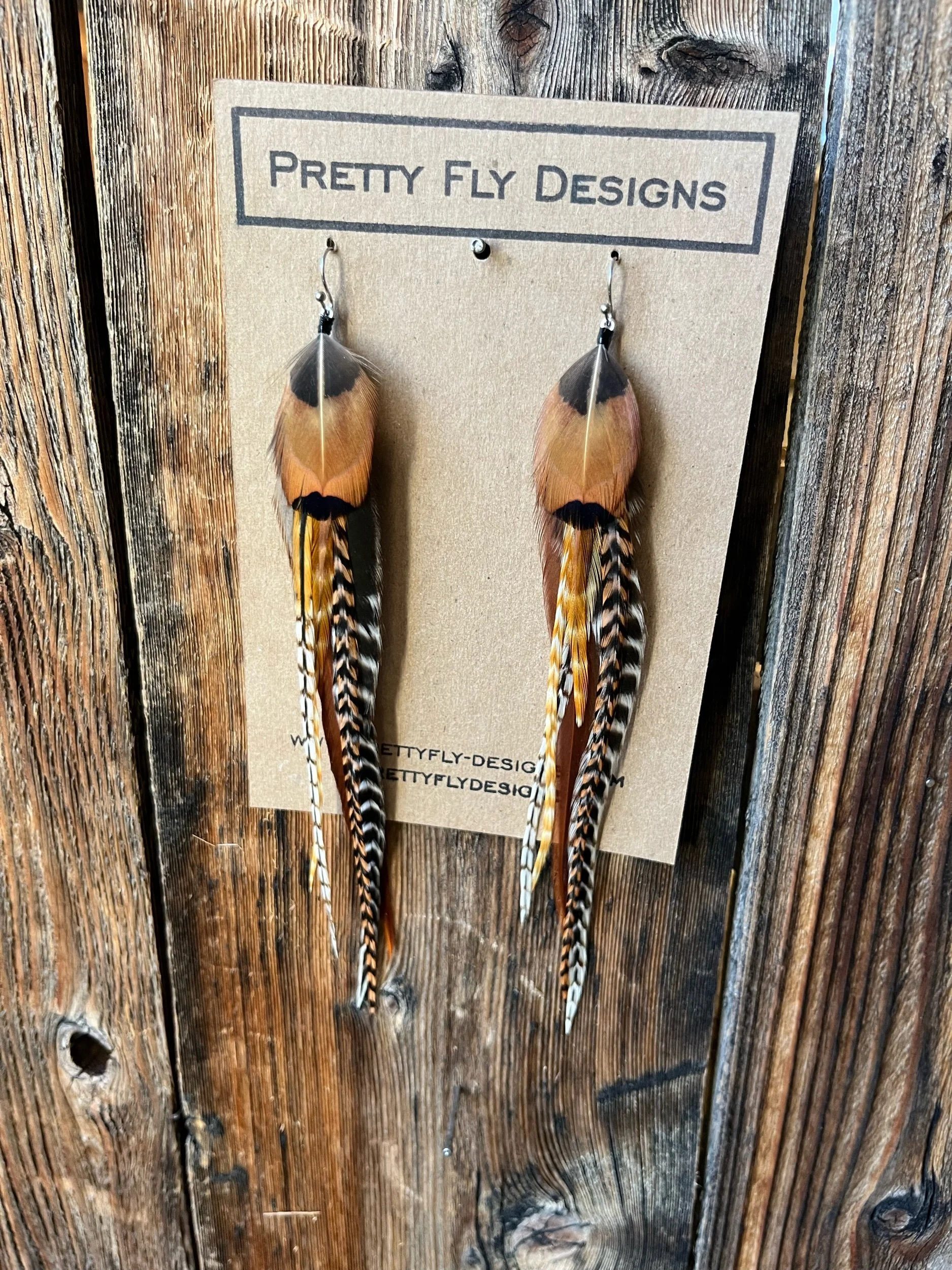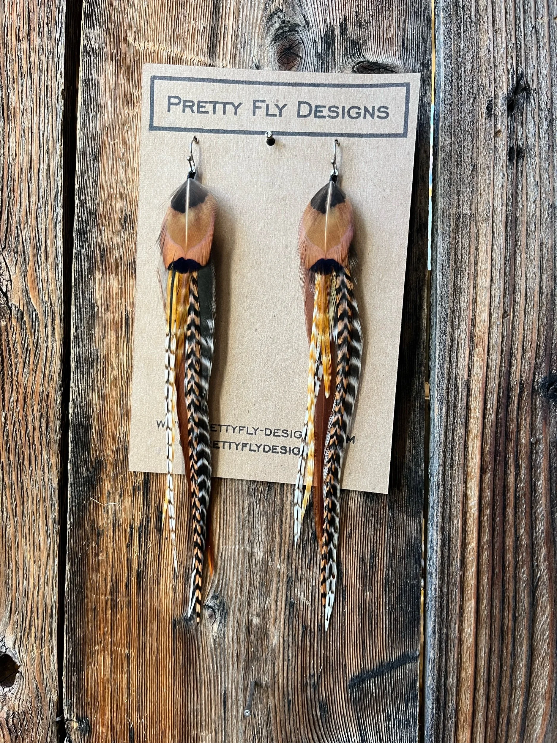 A bold mix of natural colors, six inches long. A bold pair that will pop with any outfit! Tied with Rooster and Ringneck Pheasant feathers.