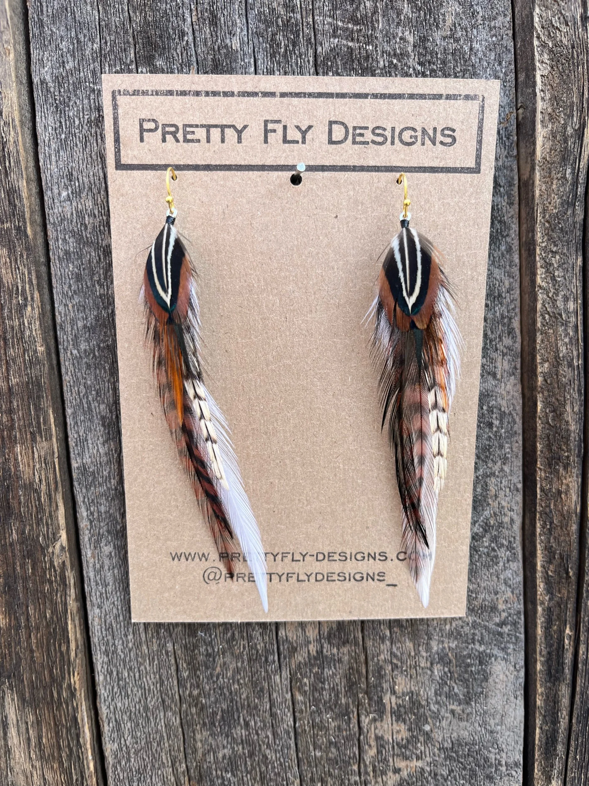 Black, Brown and White! The Cowprint is the most popular color combo. Four and a half inches long. Tied with Rooster and Ringneck Pheasant feathers.