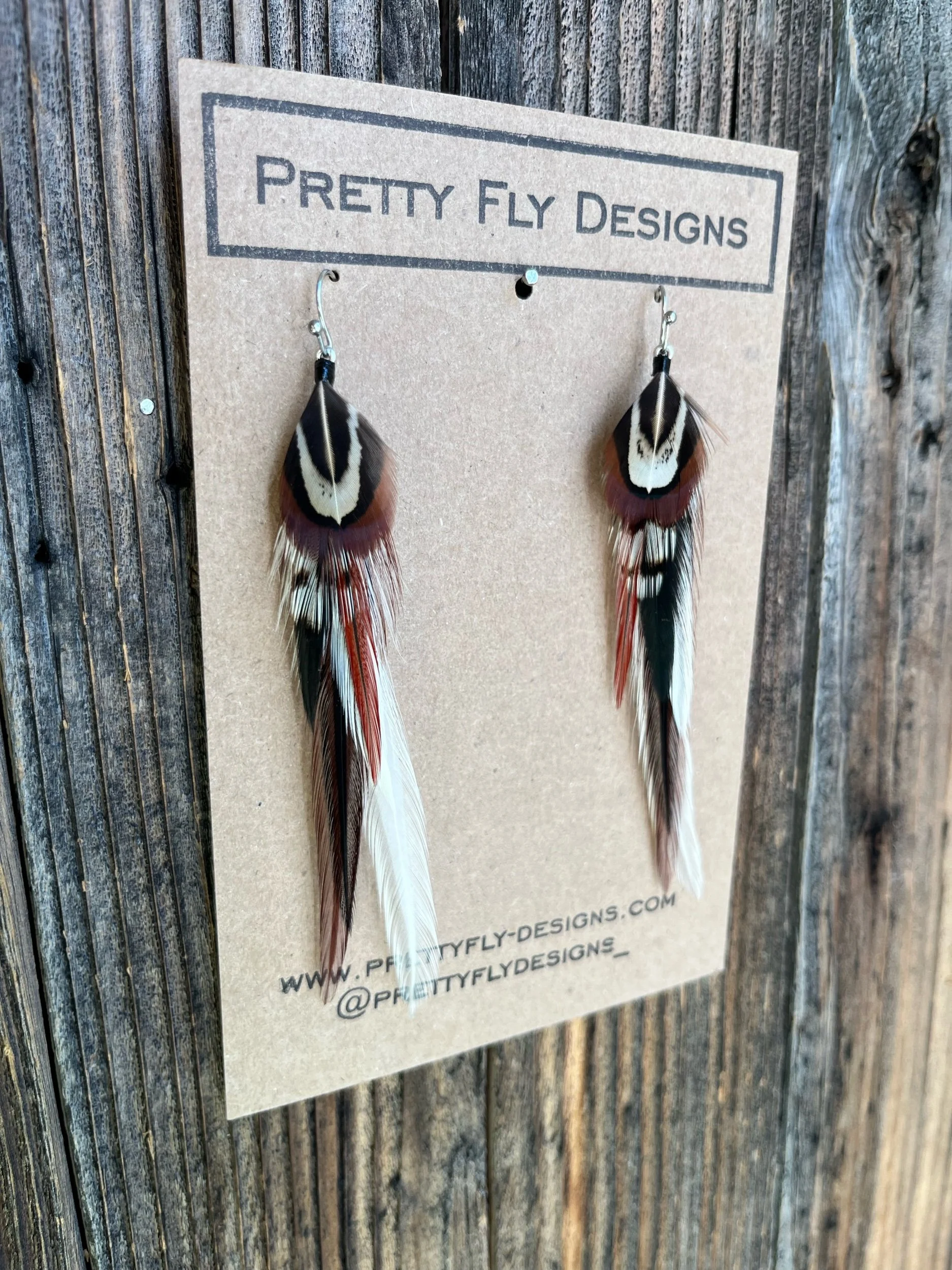 A variation of the most popular Cowprint pair of feather earrings! 4” long tied with Black, Brown and White Rooster feathers and Ringneck Pheasant overlay feathers.