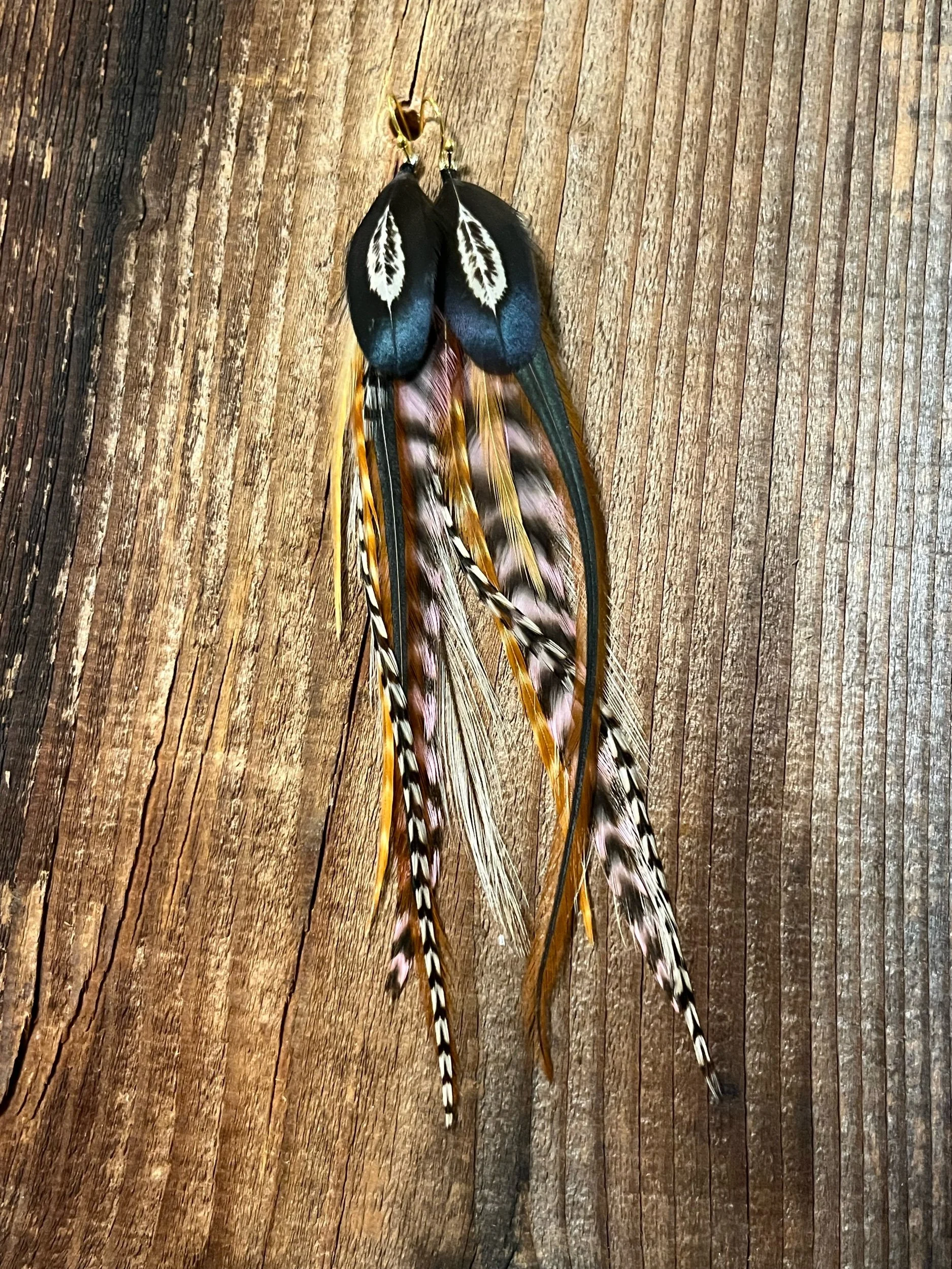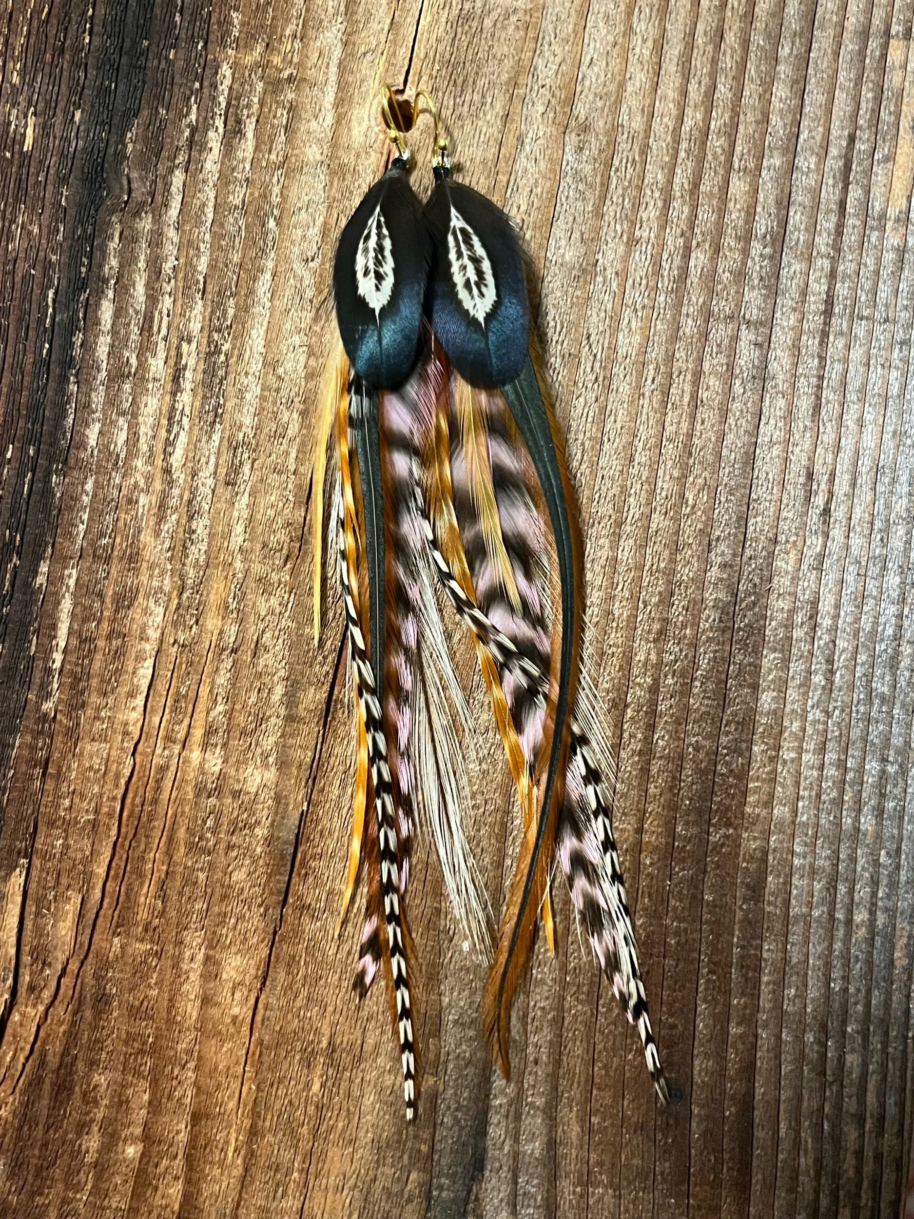A five inch long blend of natural colors with pops of pink. Another bold pair of feather earrings. Tied with Rooster feathers.