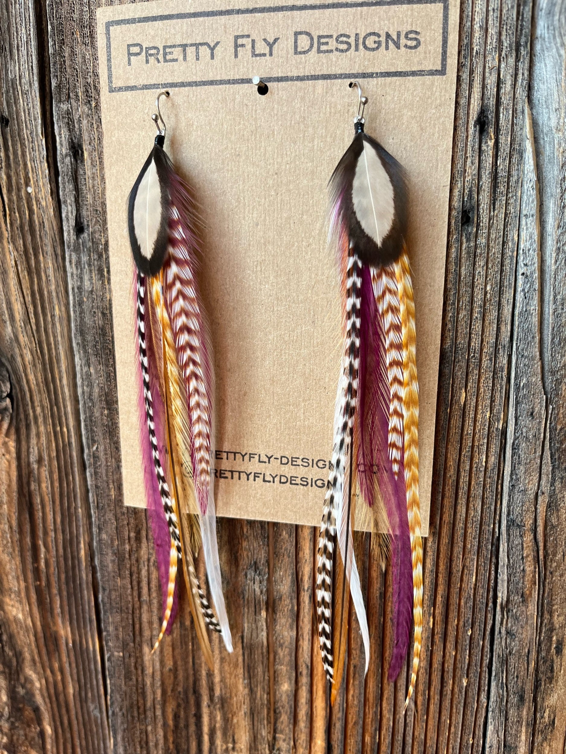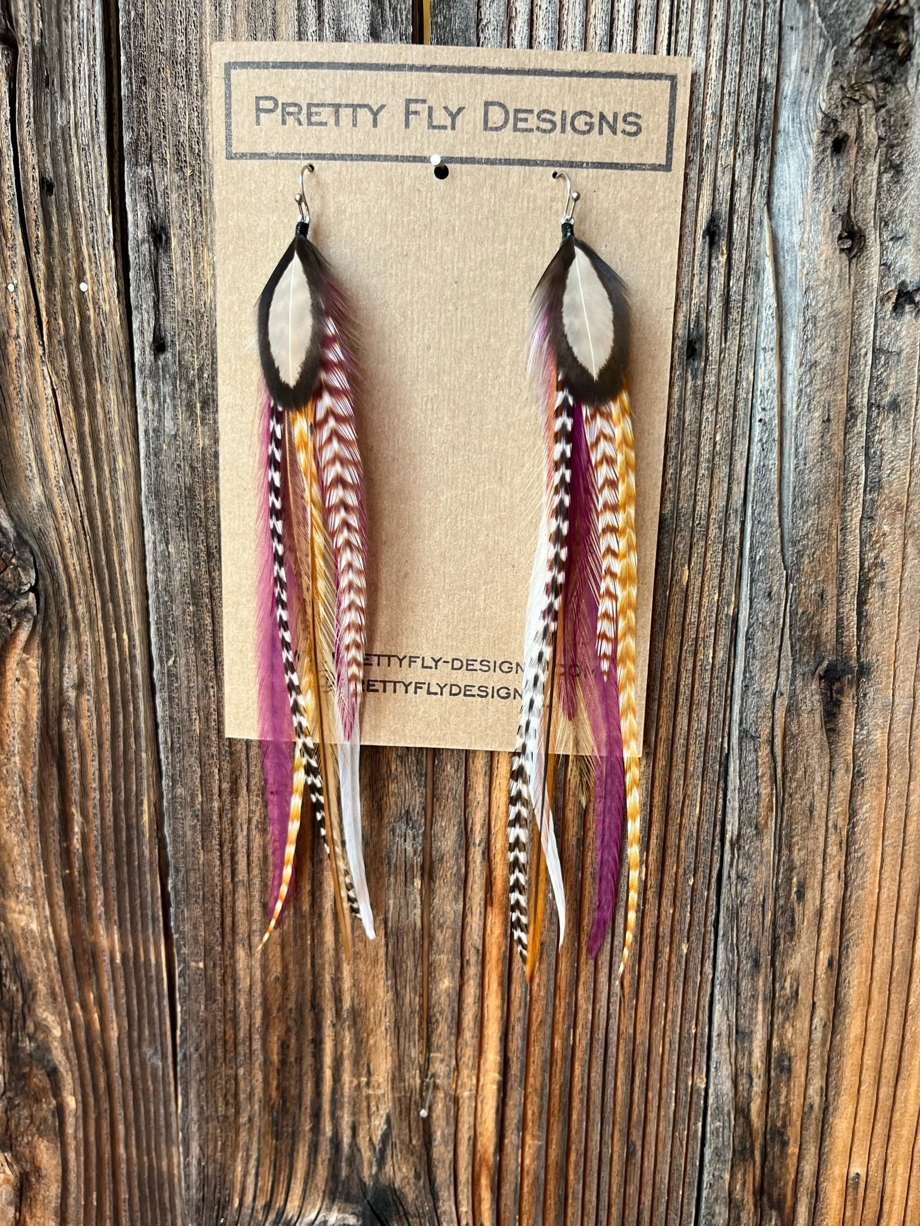 Seven inch long pair blending dyed fuscia and golden colored feathers! A very cool pair of feather earrings with lots of pop. Tied with Rooster feathers.