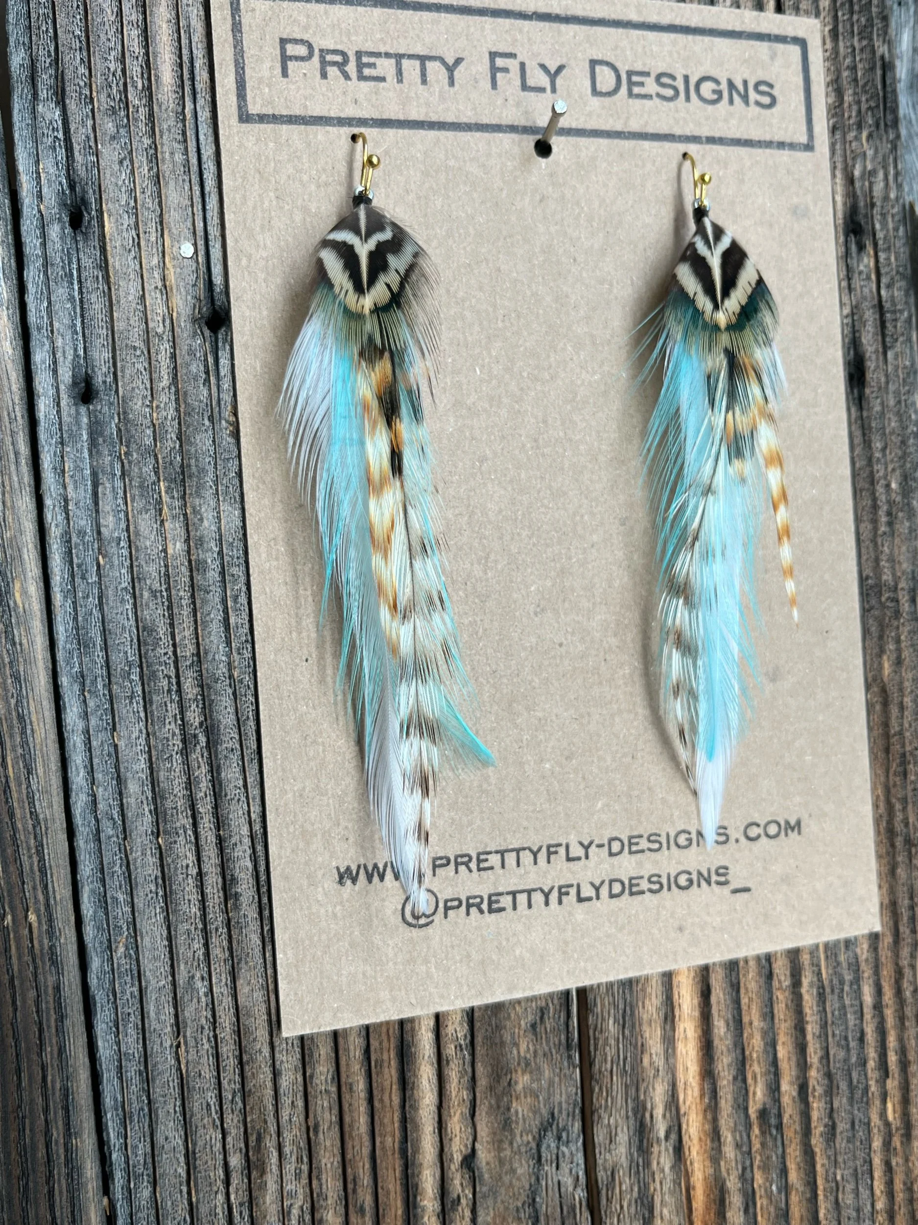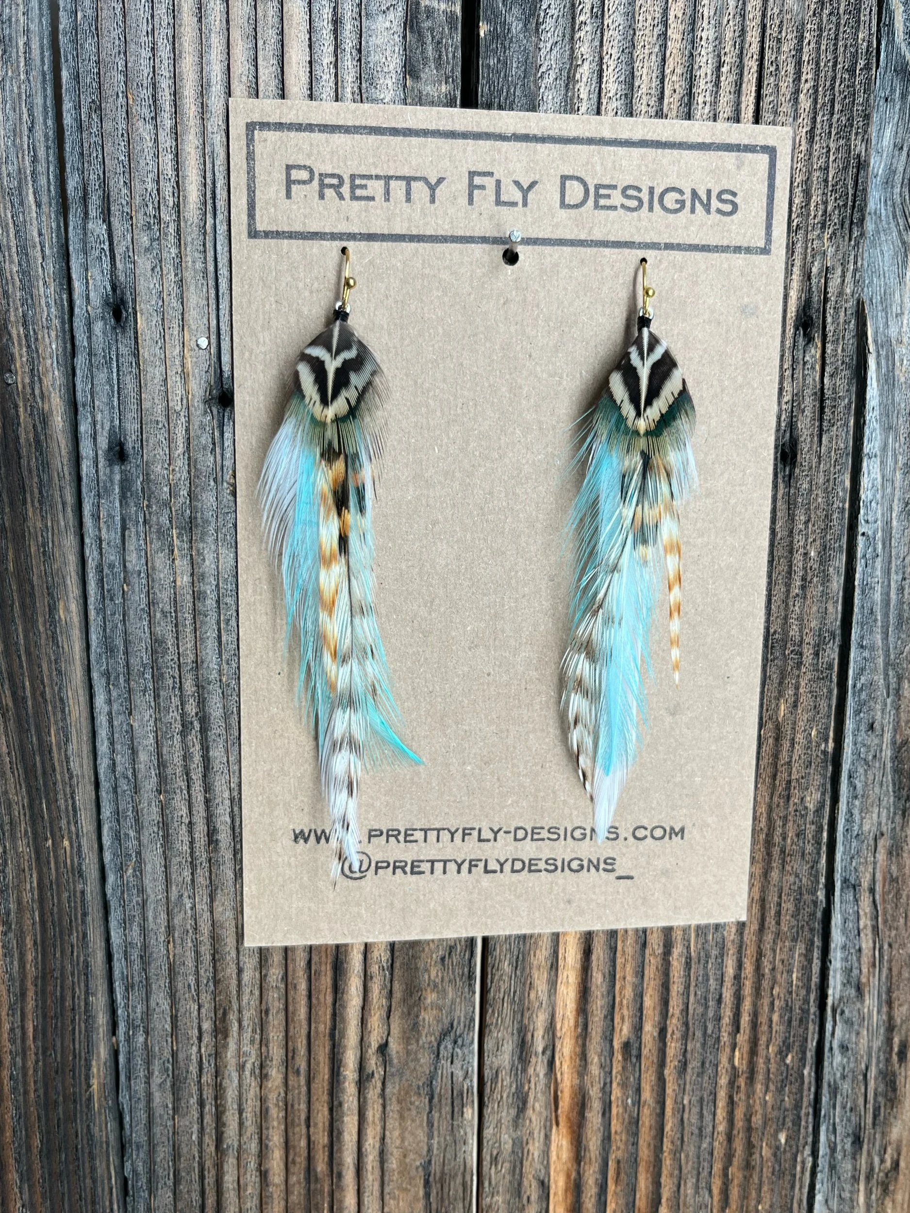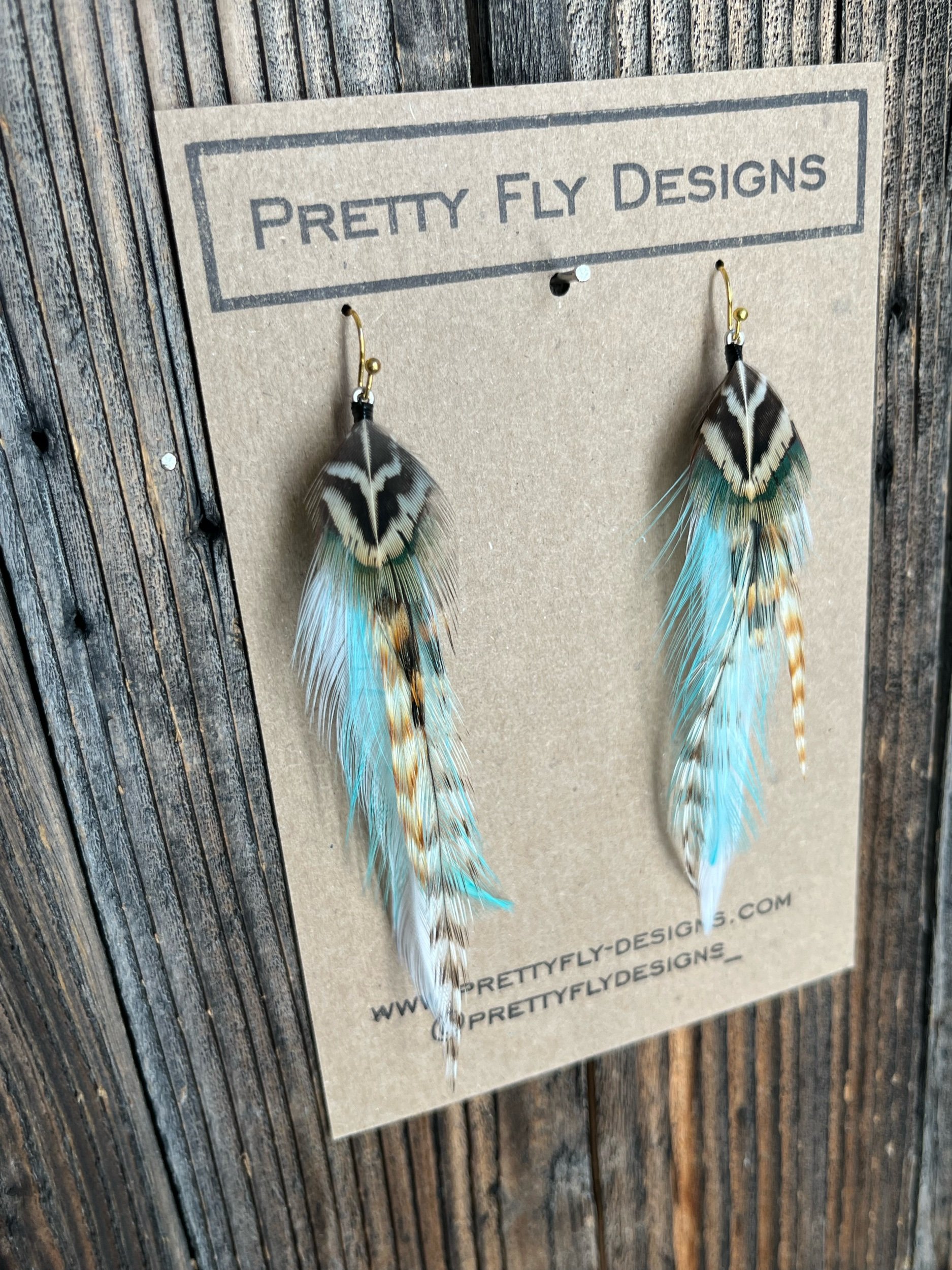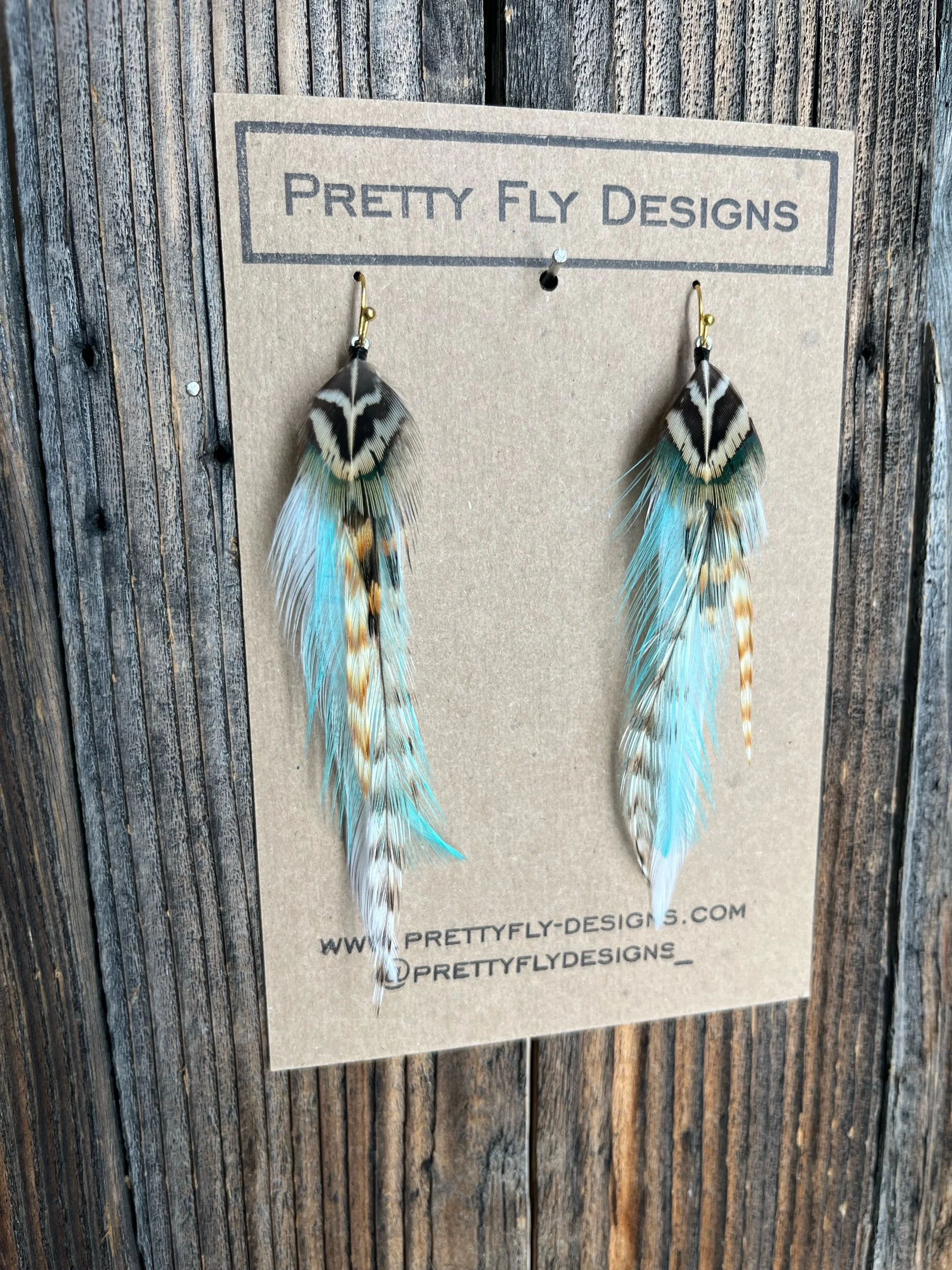 Three and a half inch long pair with turquoise paired with natural feathers. Tied with Rooster and Ringneck Pheasant feathers. These pop with any hair color!
