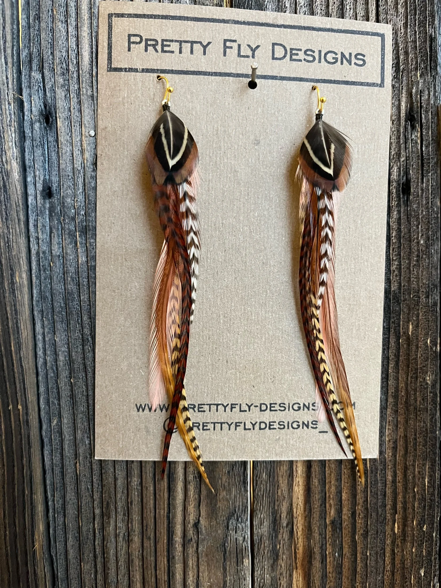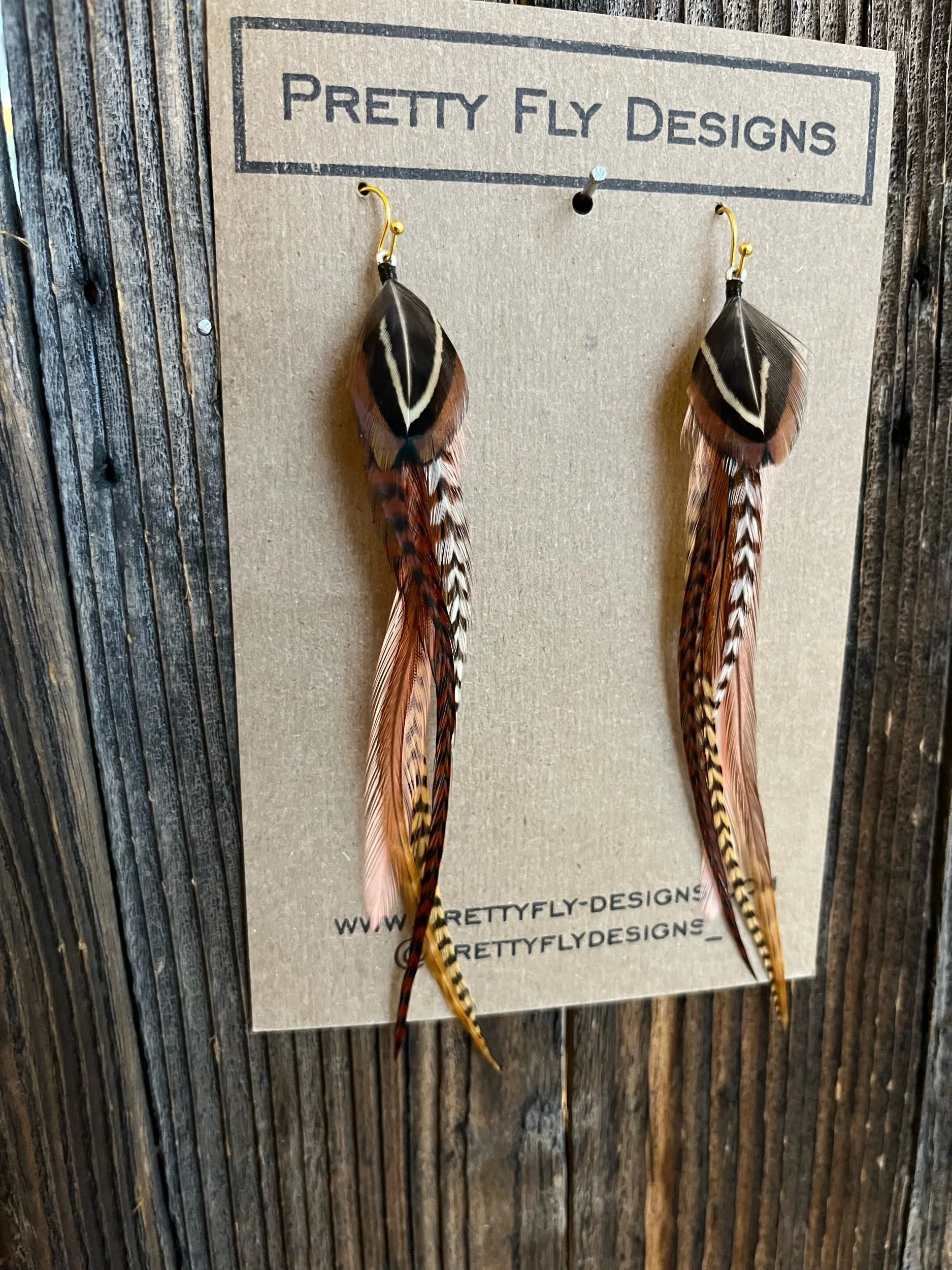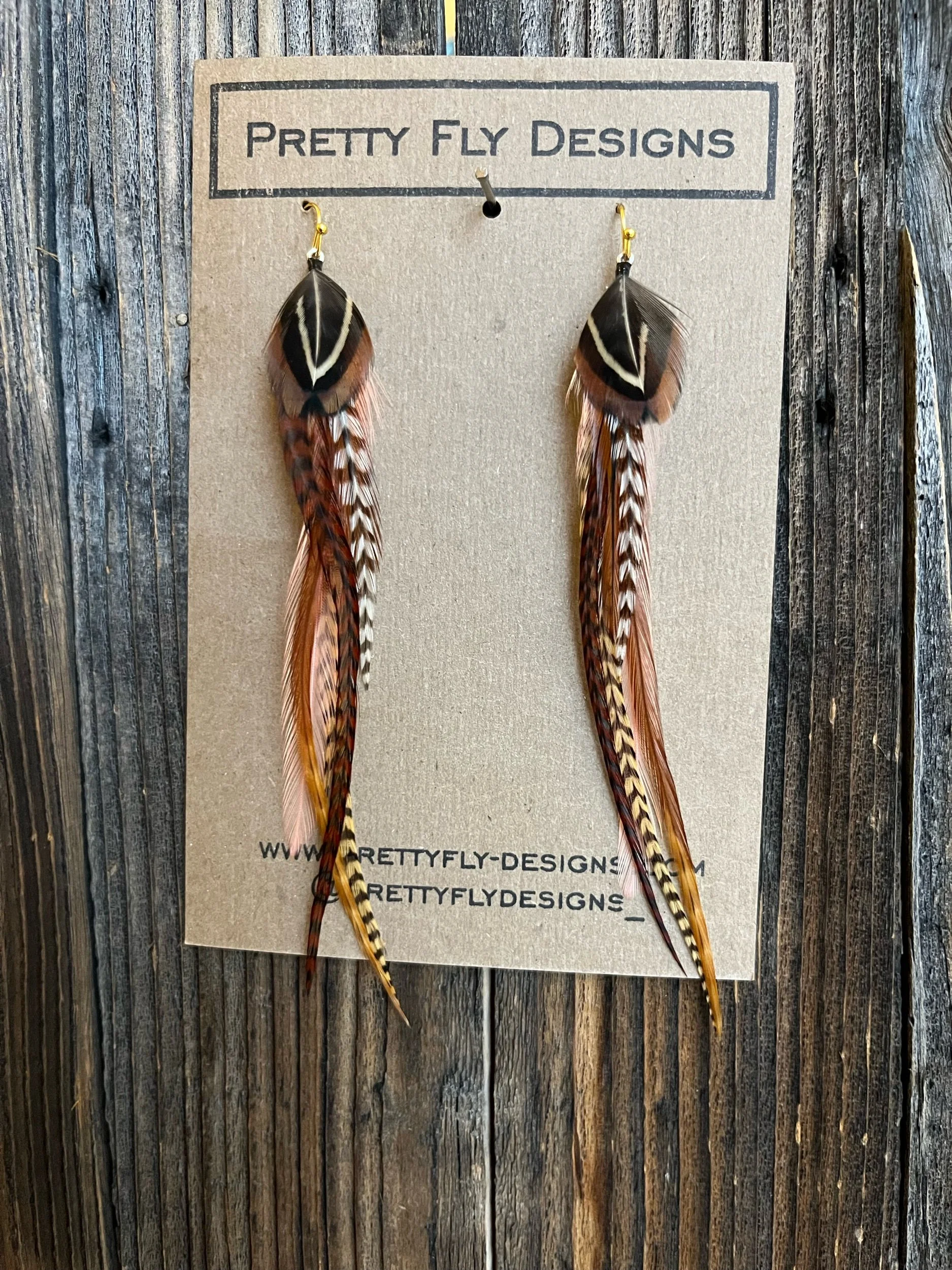 Five and a half inch long pair of browns and coral! It’s a mix of neutrals with pop of coral color. Tied with Rooster and Ringneck Pheasant feathers.