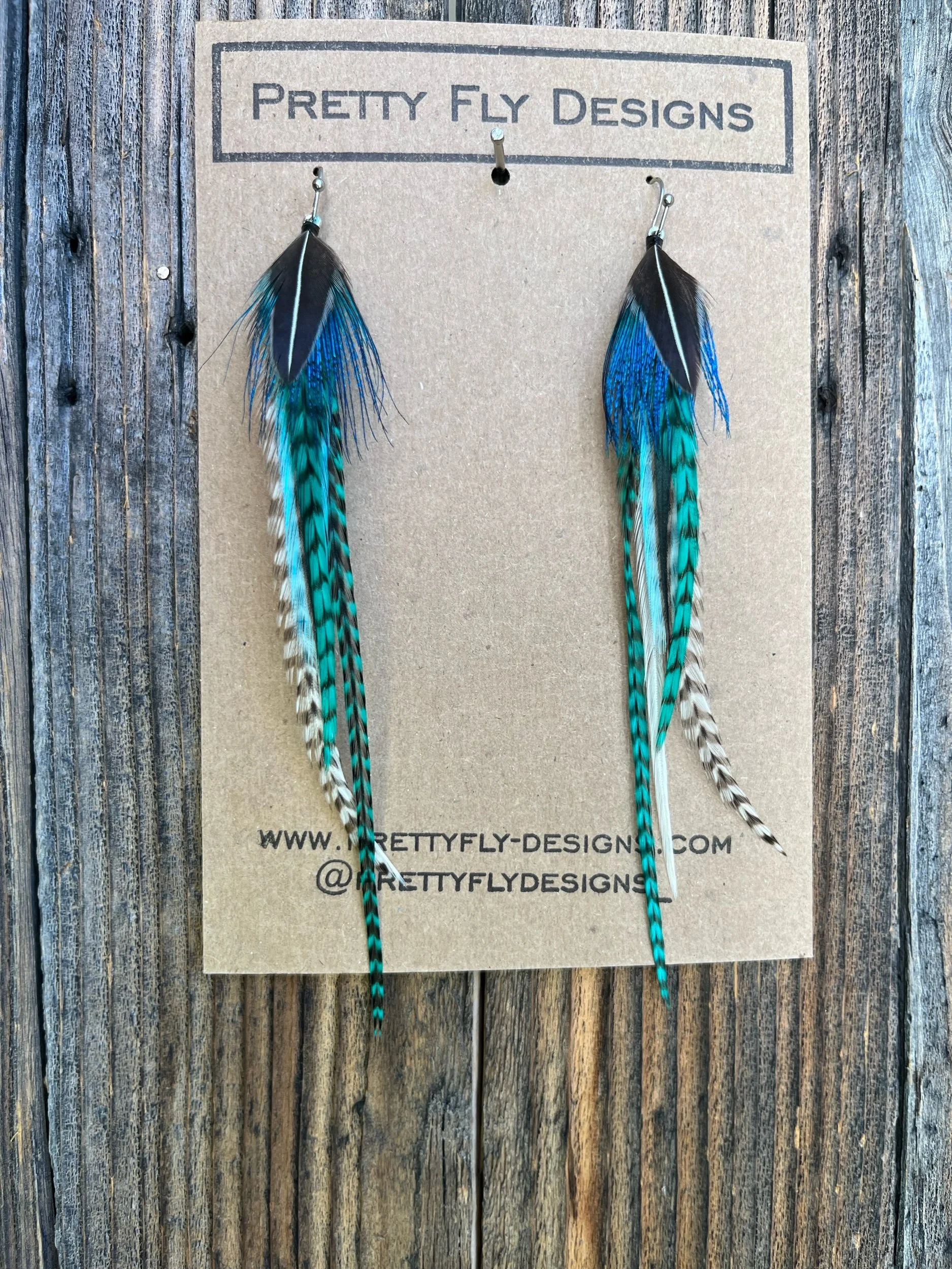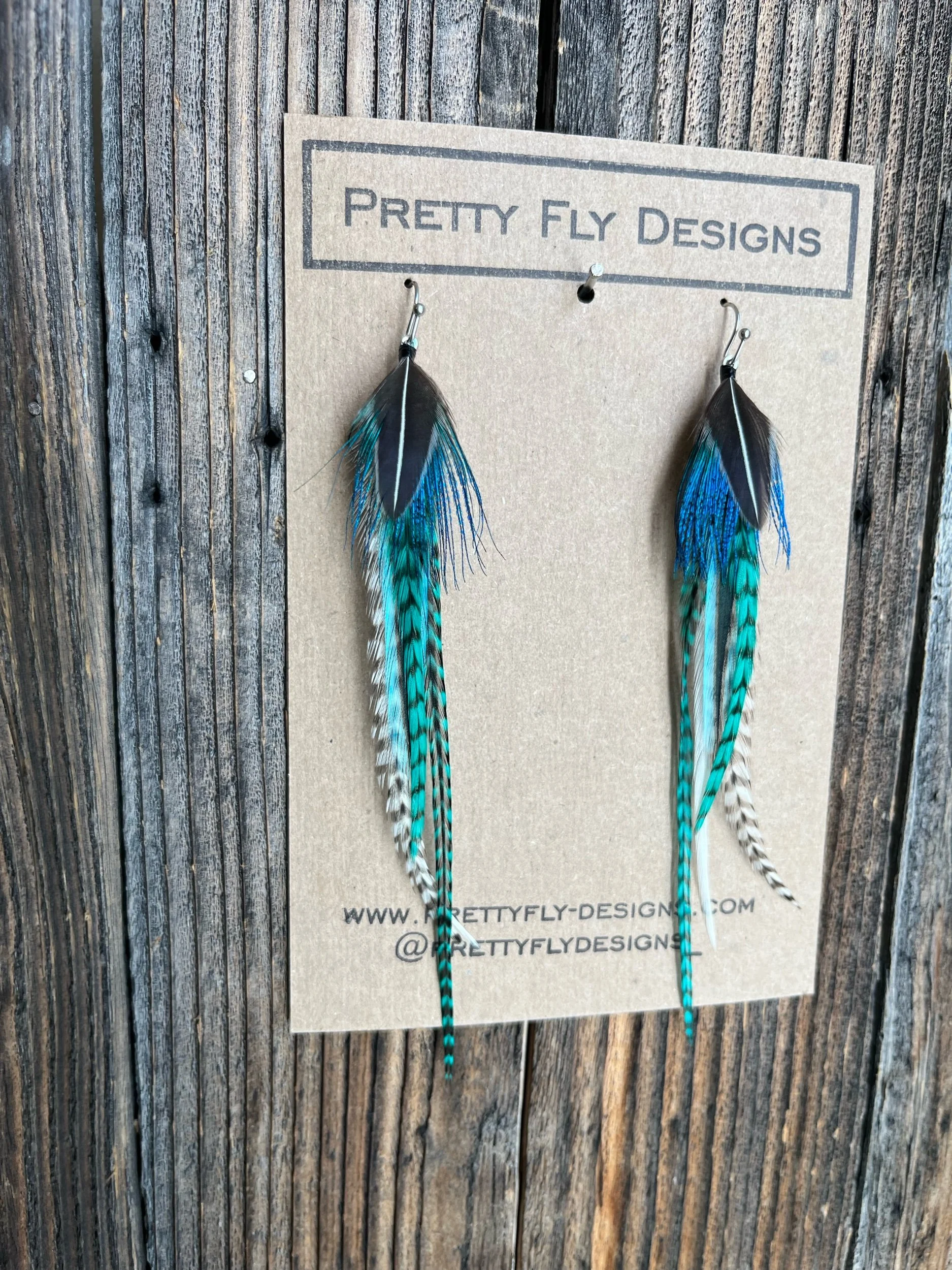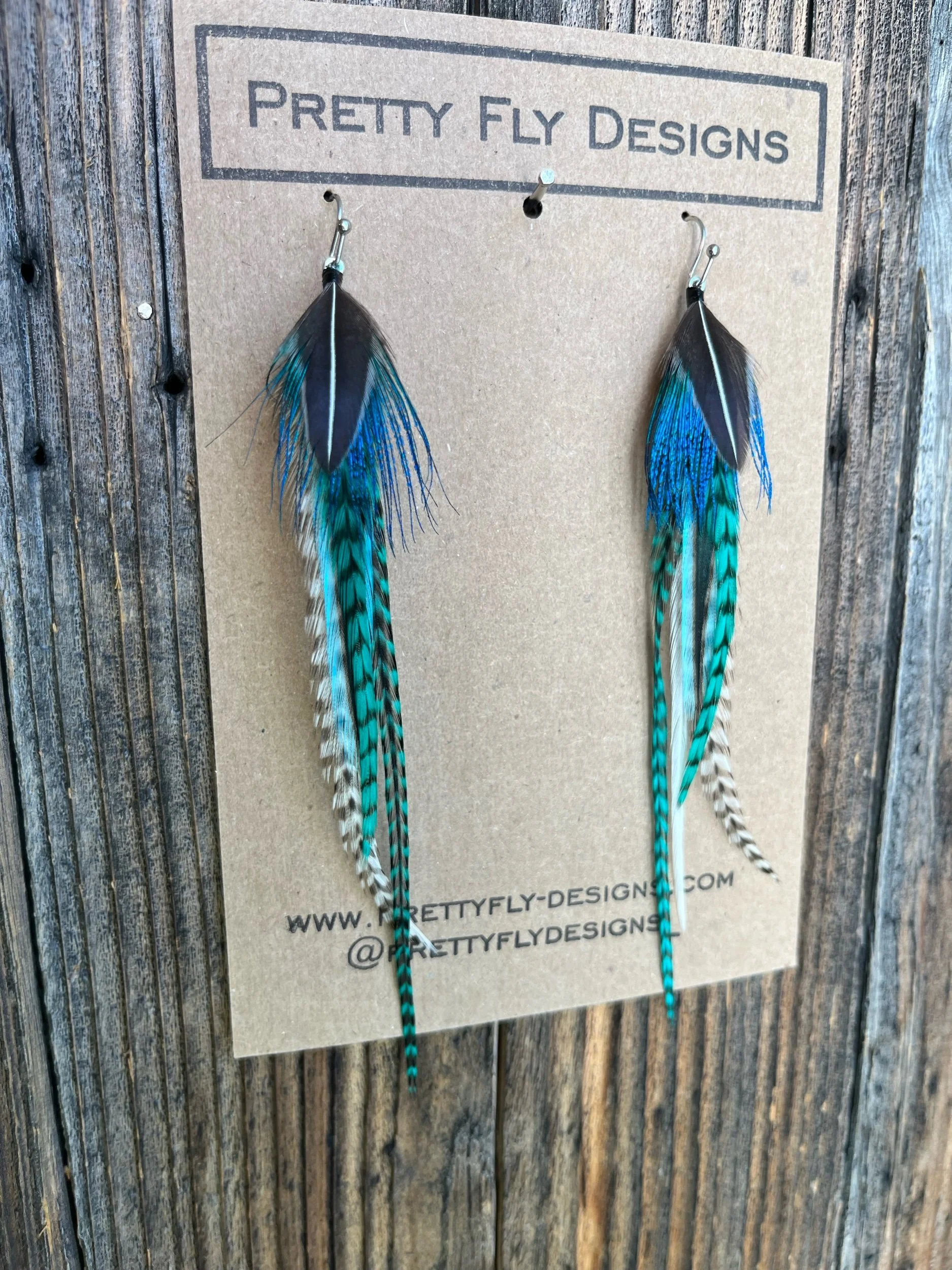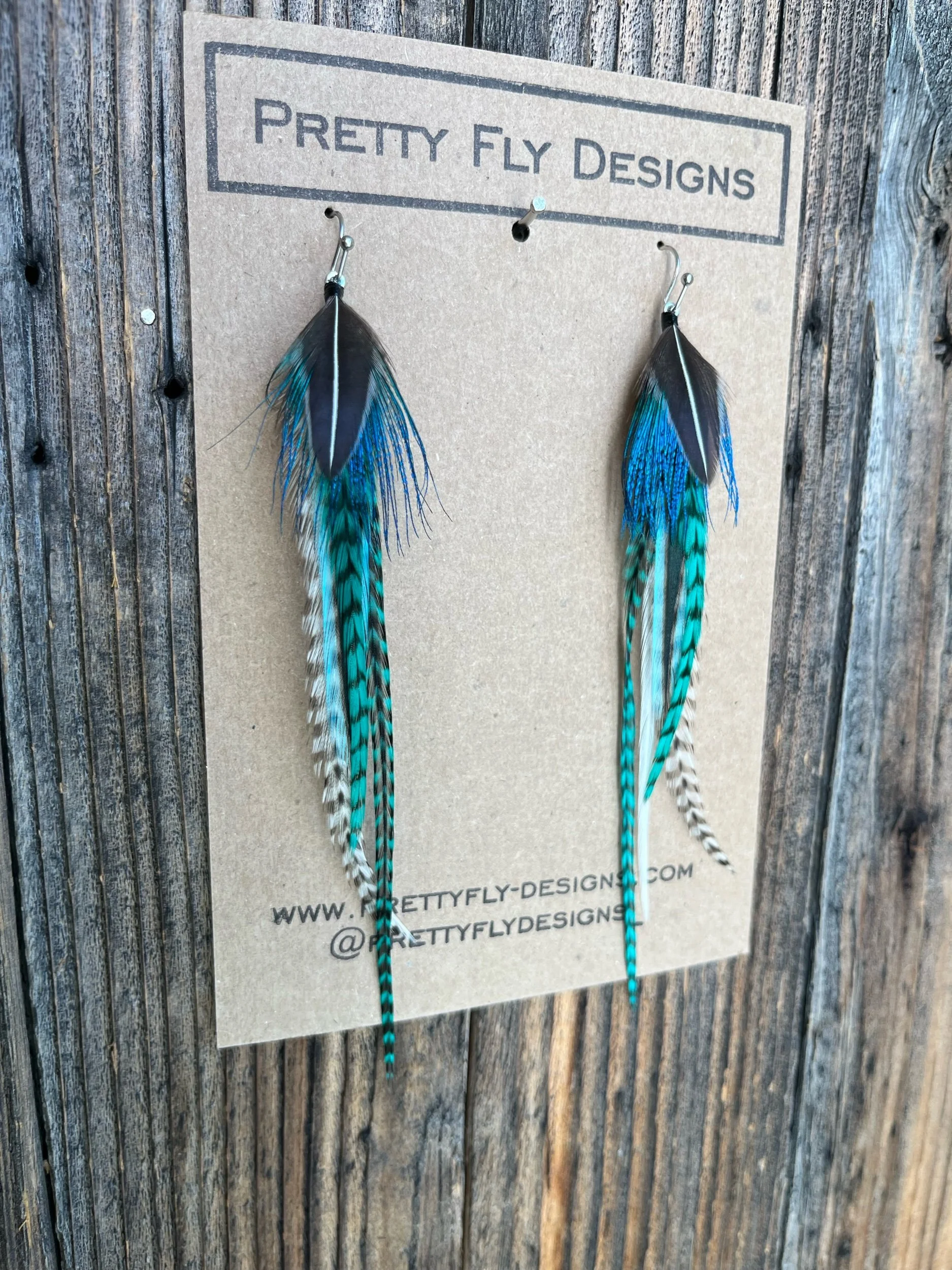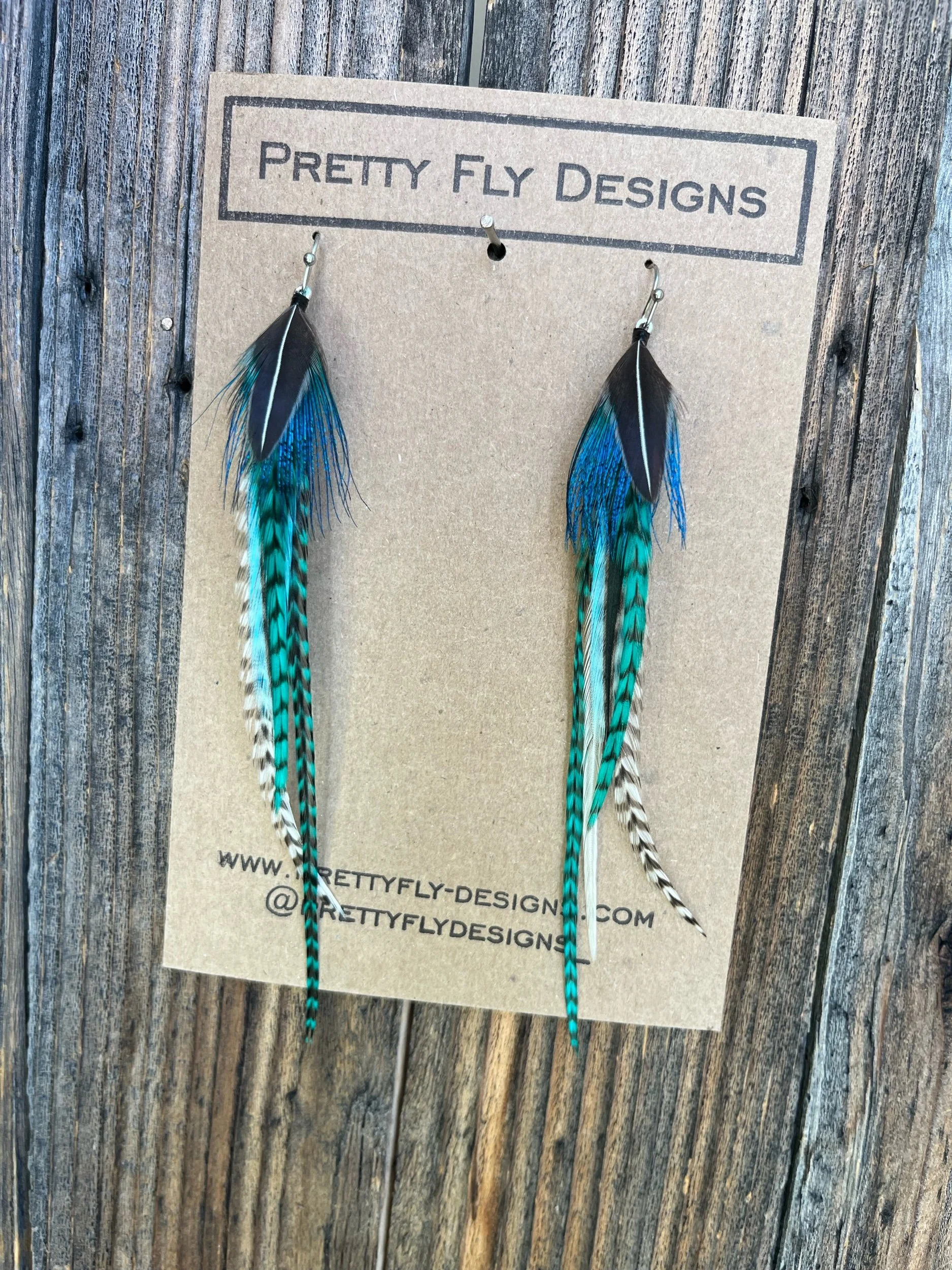 Five inch long pair of teal rooster feathers with an overlay feather of Peacock and Jungle Cock Rooster feathers!