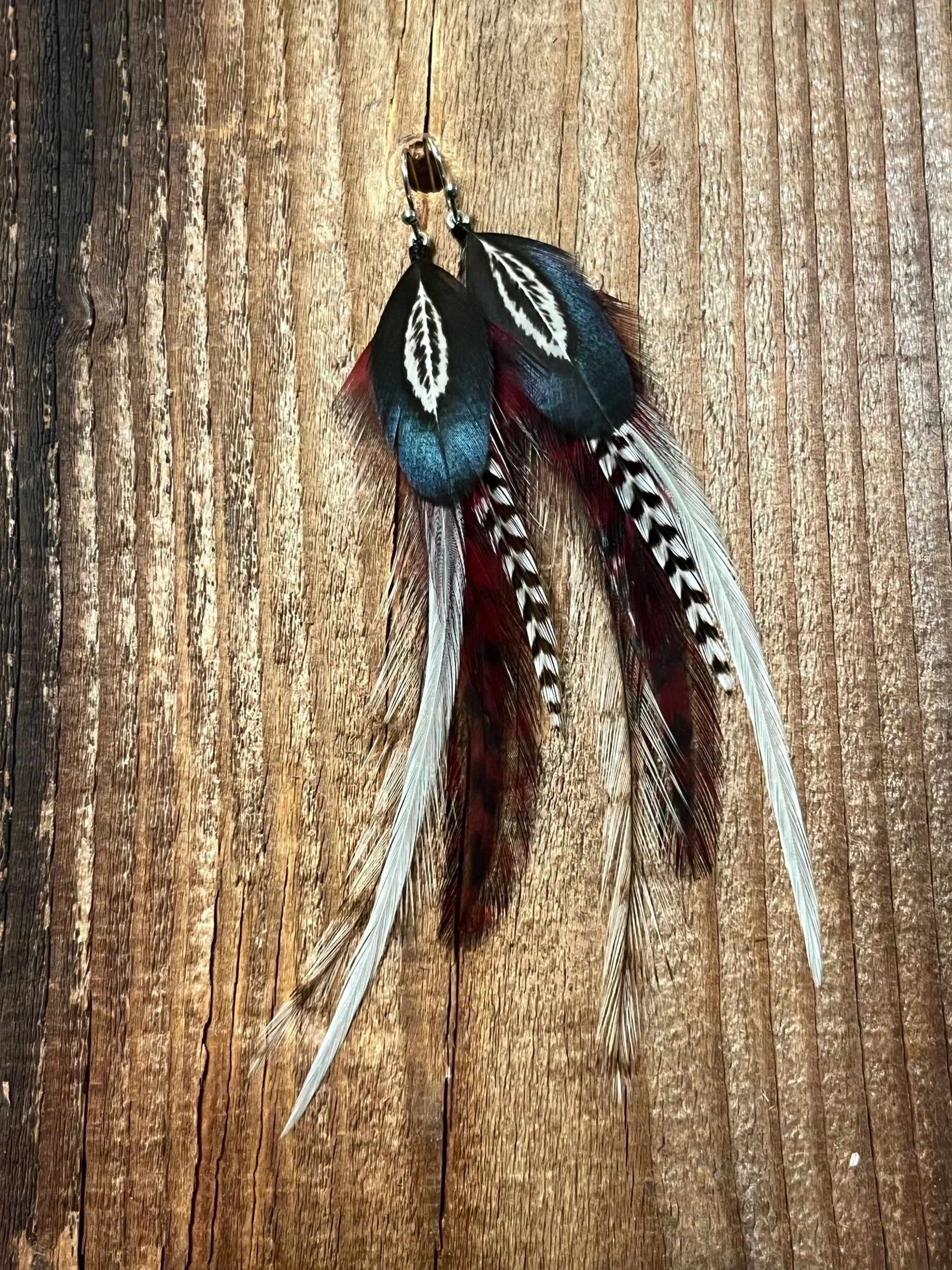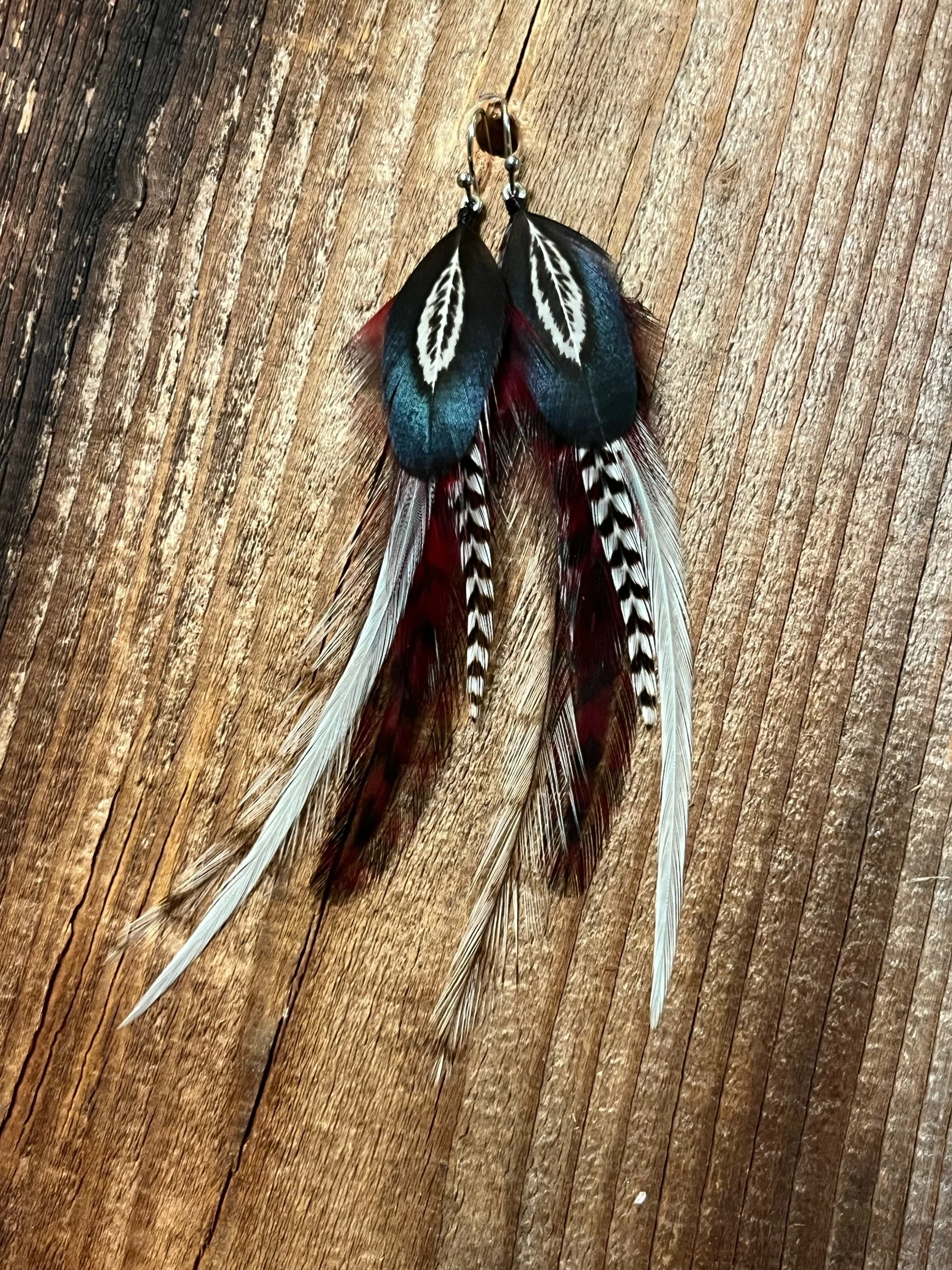 Four inch long blend of super light blue and wine colored feathers makes a gorgeous pair of eye catching feather earrings. Tied with Rooster feathers.