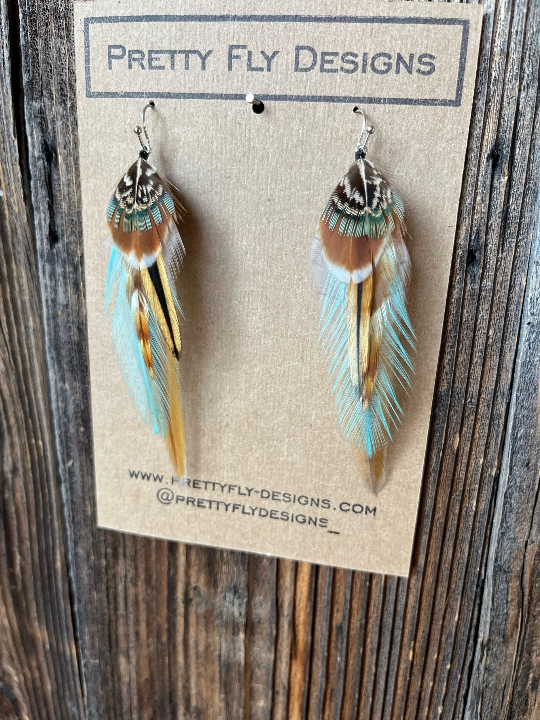 Earrings › Blake Image 1 of 4 Image 2 of 4 Image 3 of 4 Image 4 of 4 Blake $43.00 Four inch long natural tan pair of feather earrings with pop of Turquoise! Tied with Rooster and Ringneck Pheasant. Quantity: Add To Cart Added! Four inch long natural tan pair of feather earrings with pop of Turquoise! Tied with Rooster and Ringneck Pheasant.
