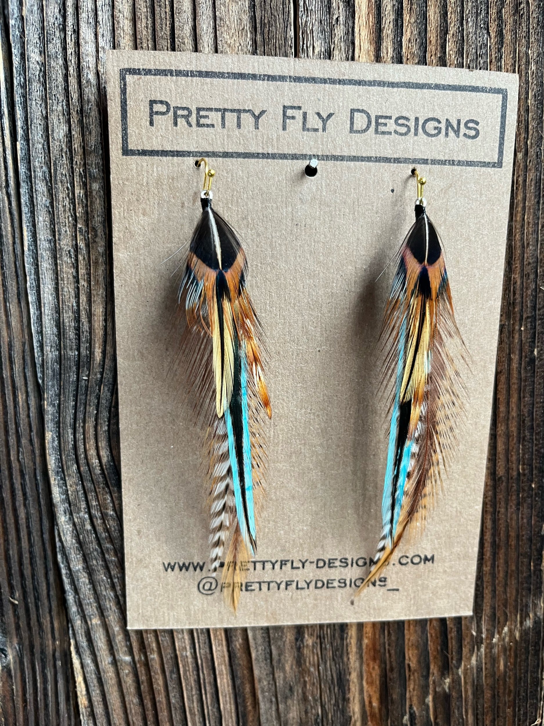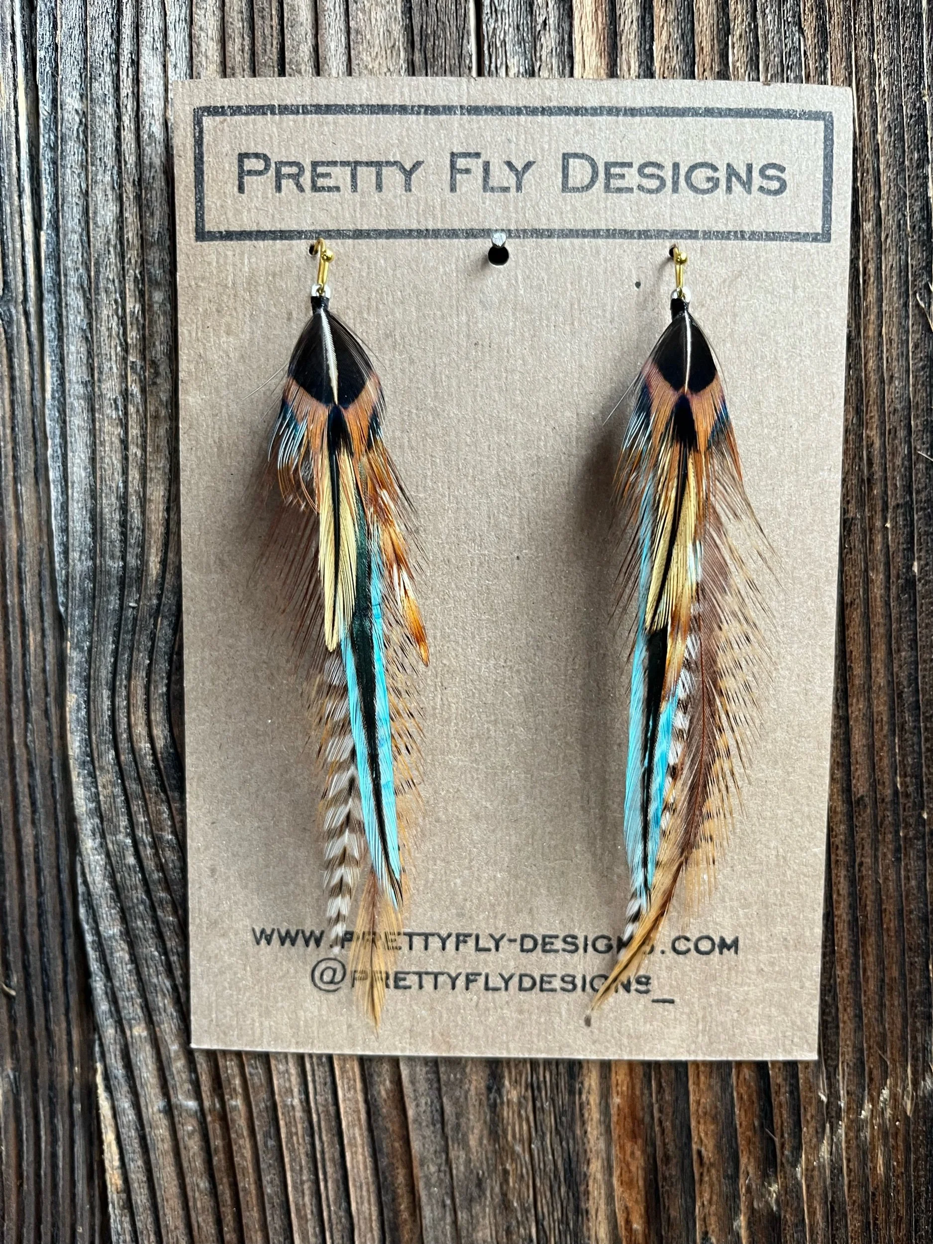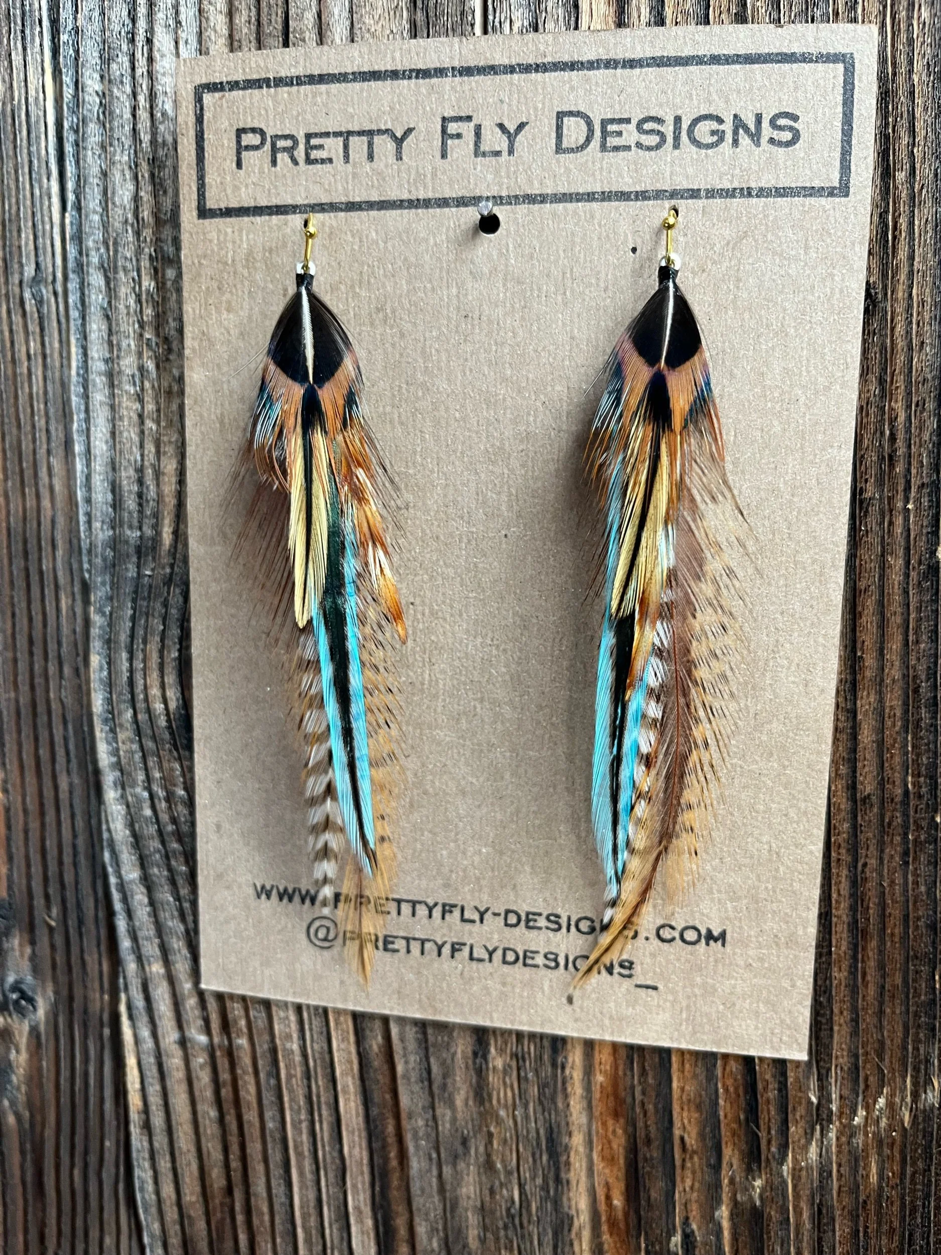 Four and a half inch long pair feather earrings with dyed golden and turquoise blue feathers. This is an awesome western style! Ringneck Pheasant and Rooster.