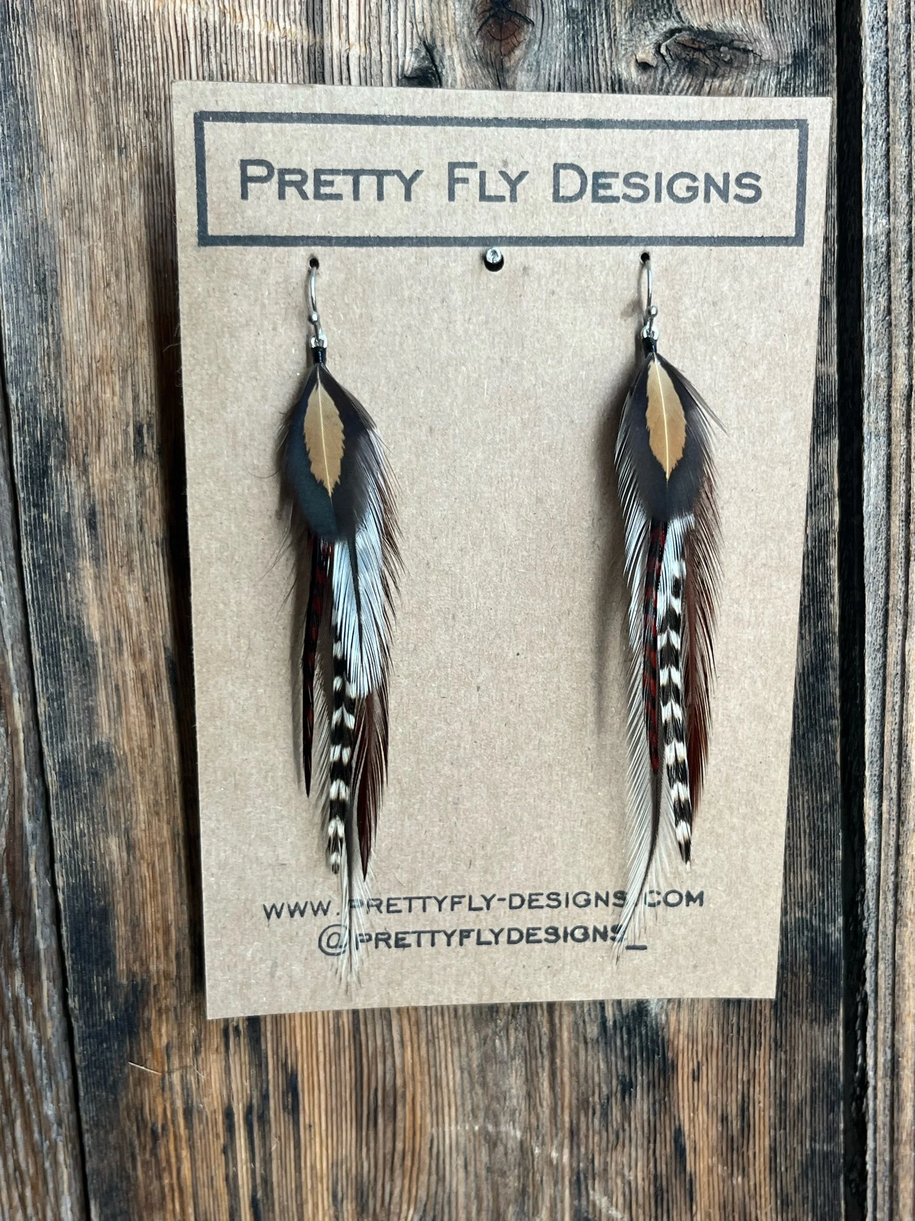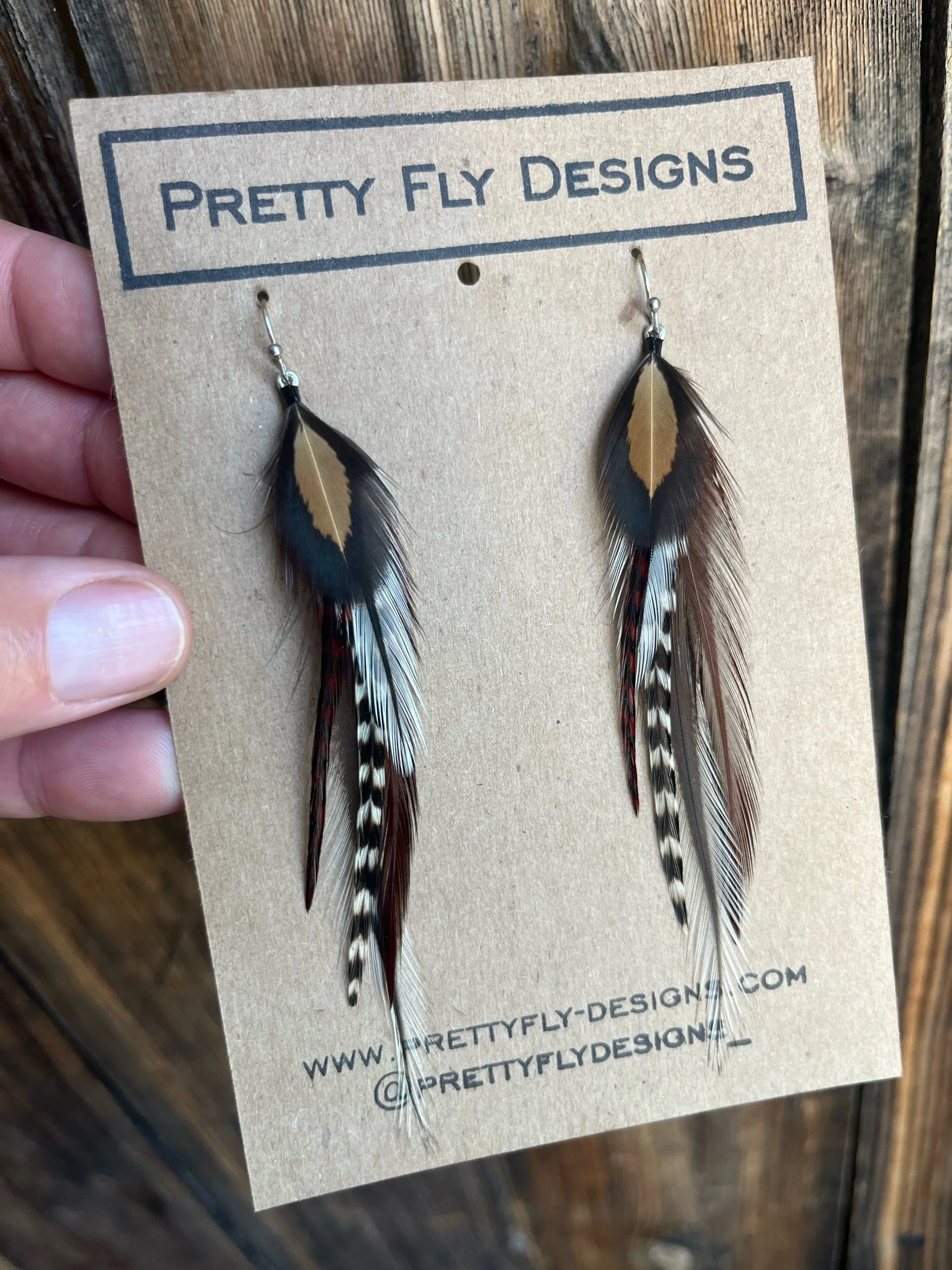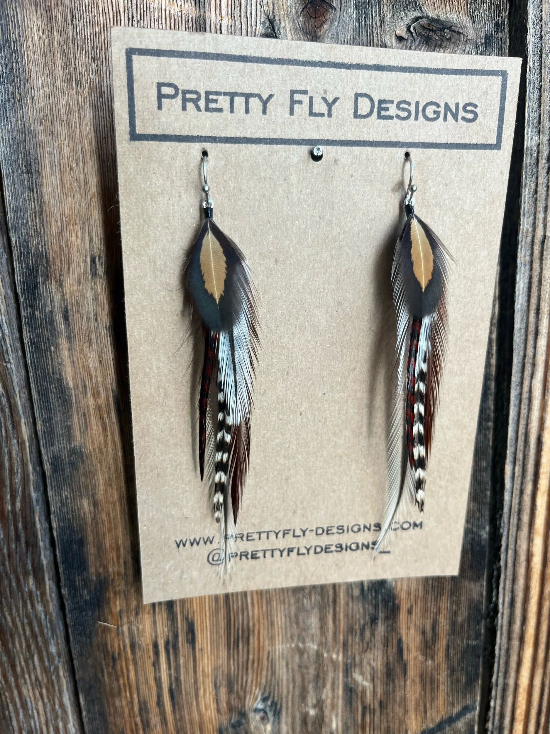 A variation of the very popular Cowprint pair. Tied with Rooster feathers. 3.5” long.