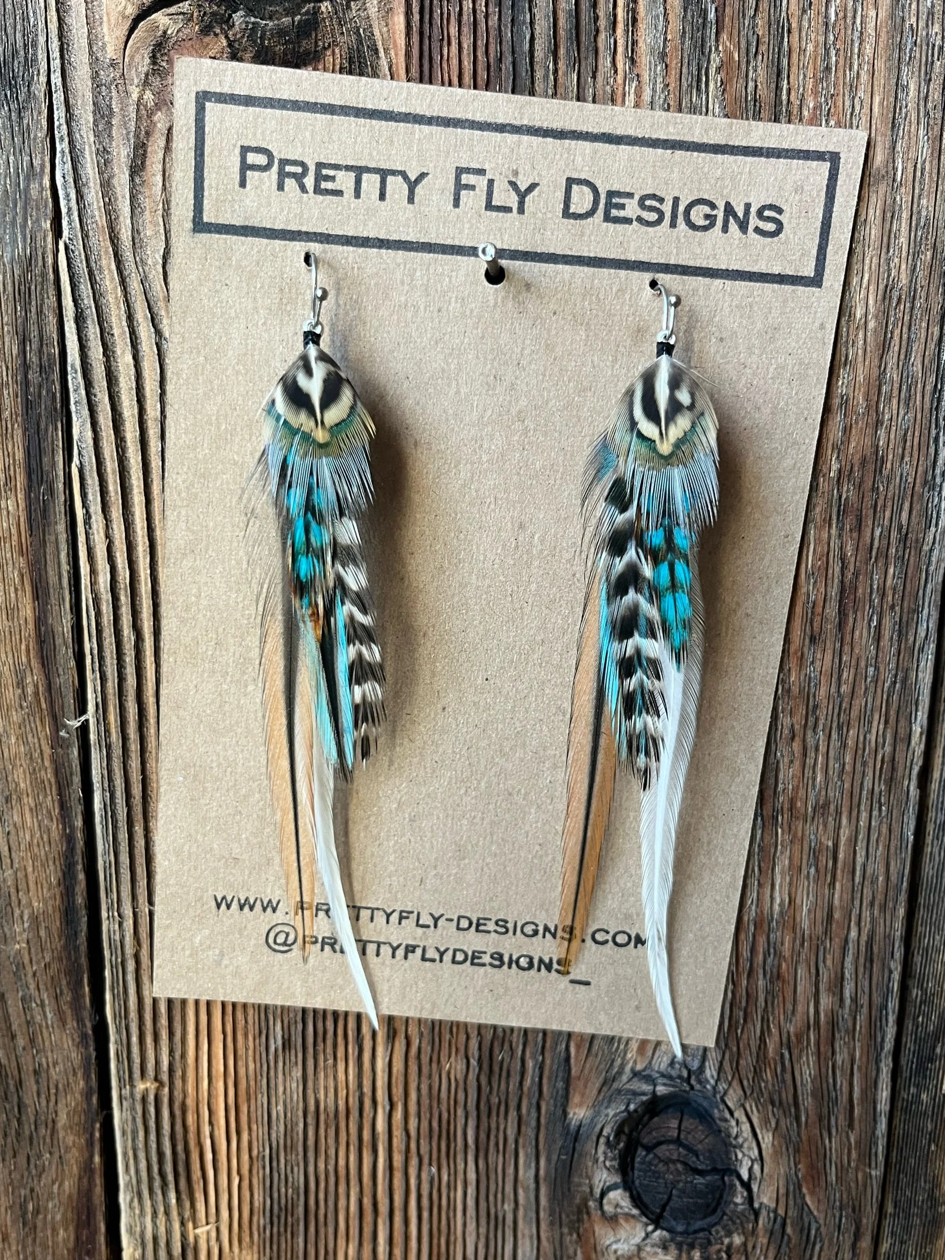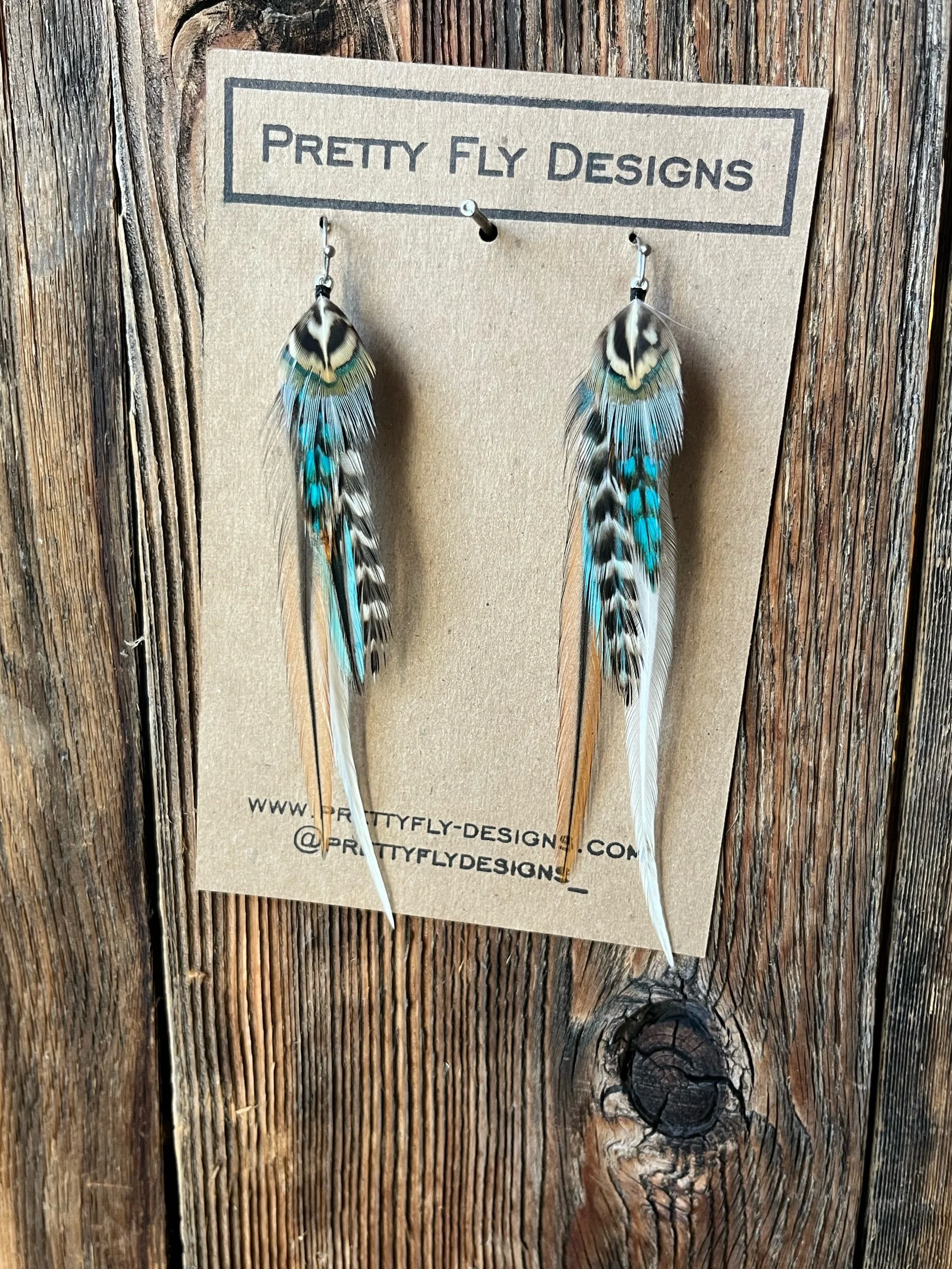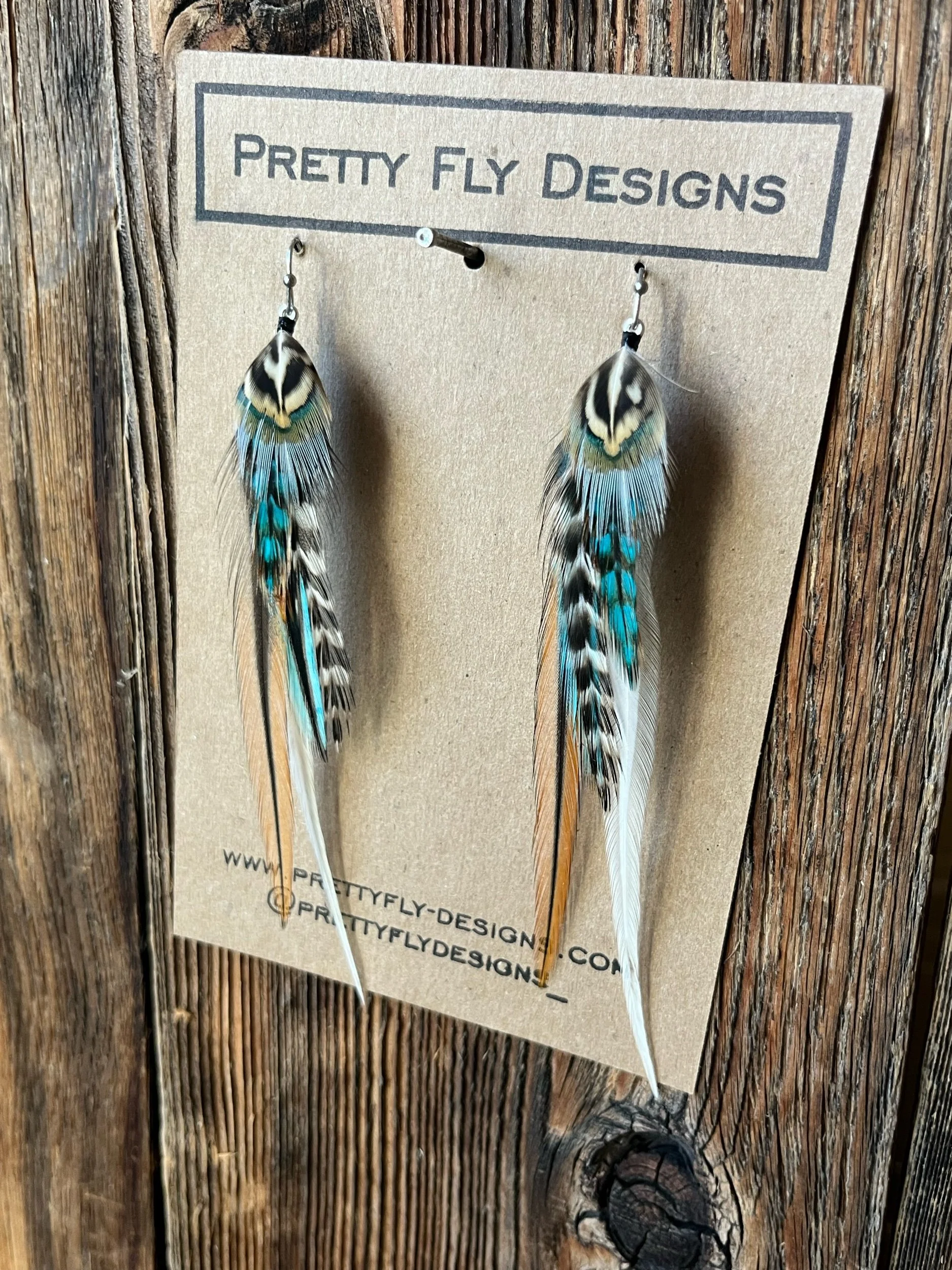 Four inch long pair mixing natural colors and blues. Tied with Rooster and Ringneck Pheasant.