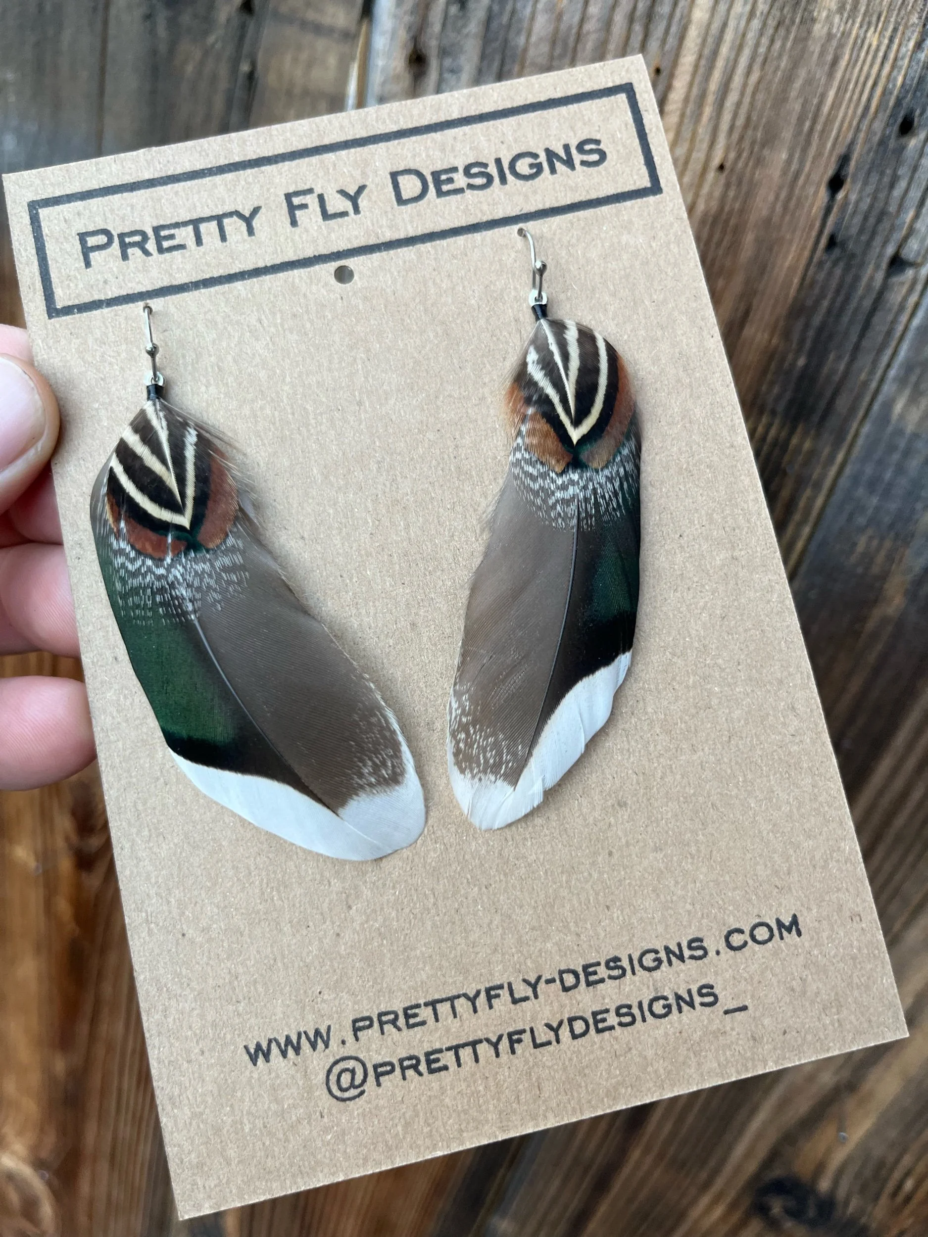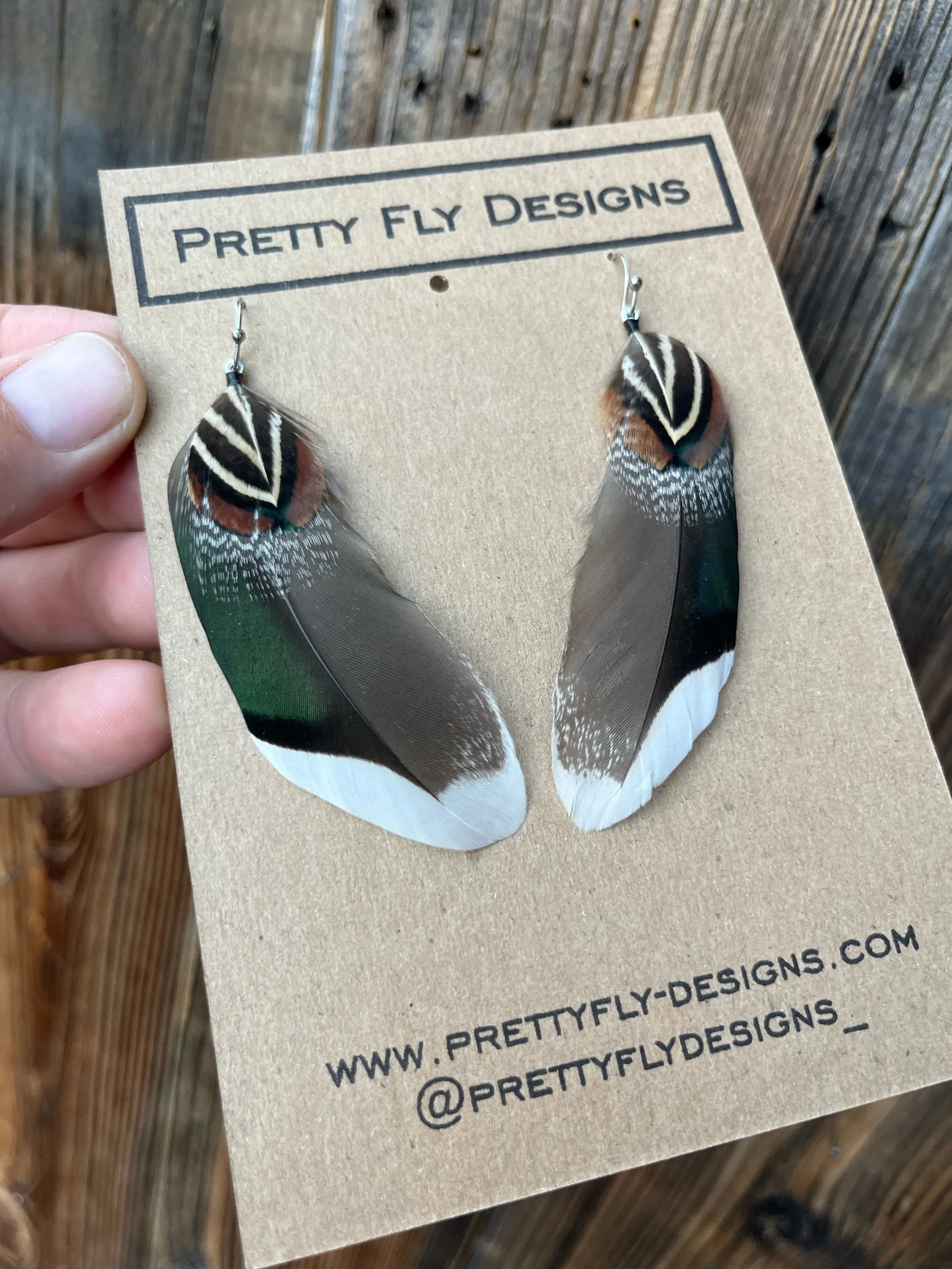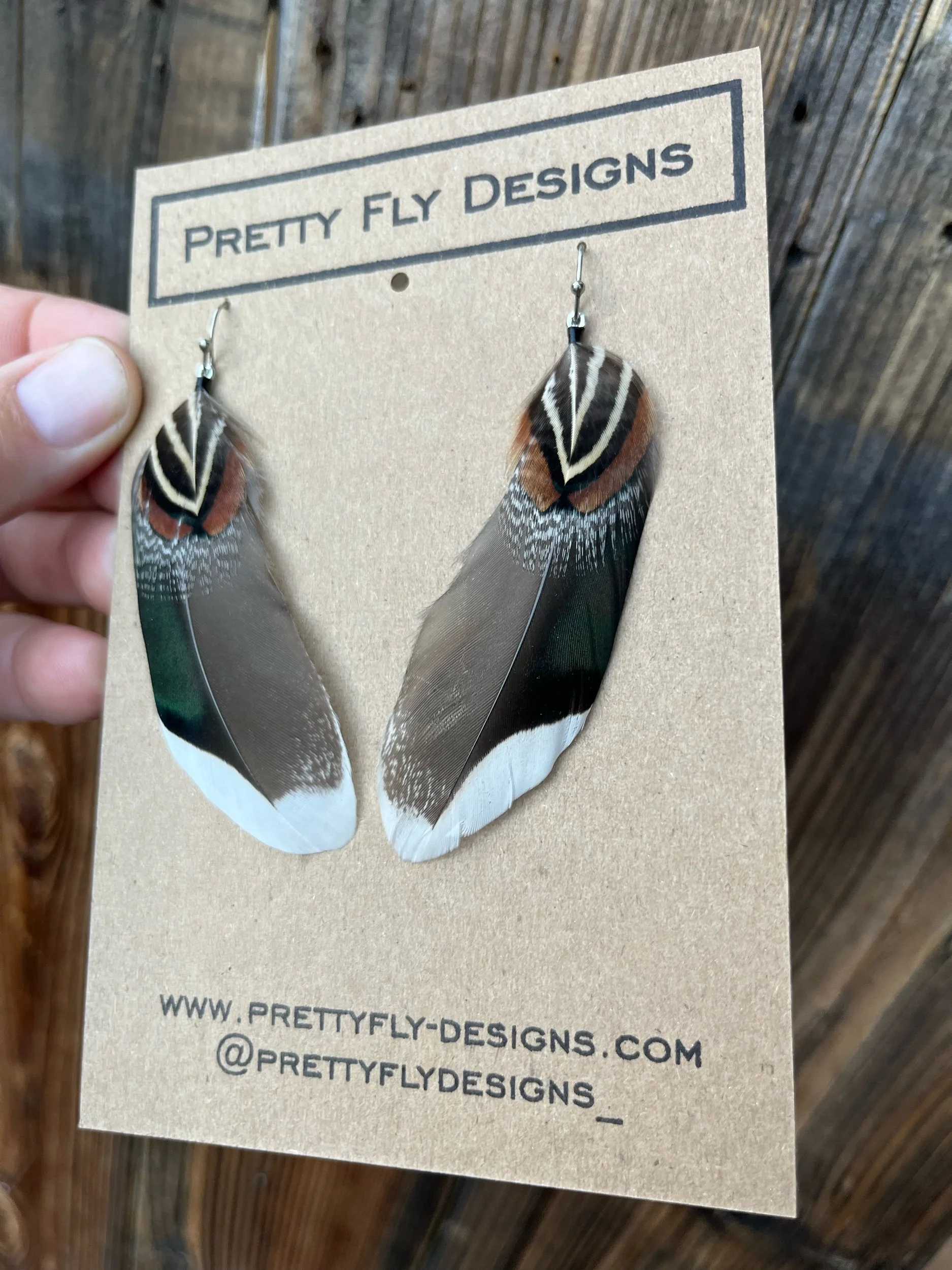 Earrings › Green Duck Image 1 of 3 Image 2 of 3 Image 3 of 3 Green Duck $43.00 A unique olive green sheen duck pair. Three inches long. Ringneck Pheasant overlay feathers. Add To Cart Added! A unique olive green sheen duck pair. Three inches long. Ringneck Pheasant overlay feathers.