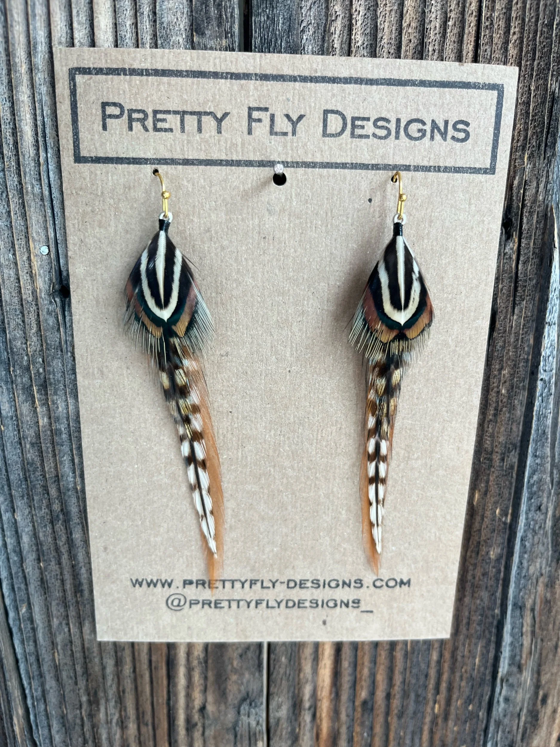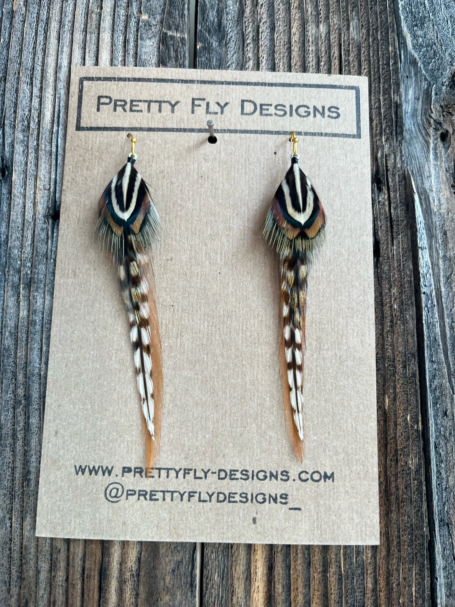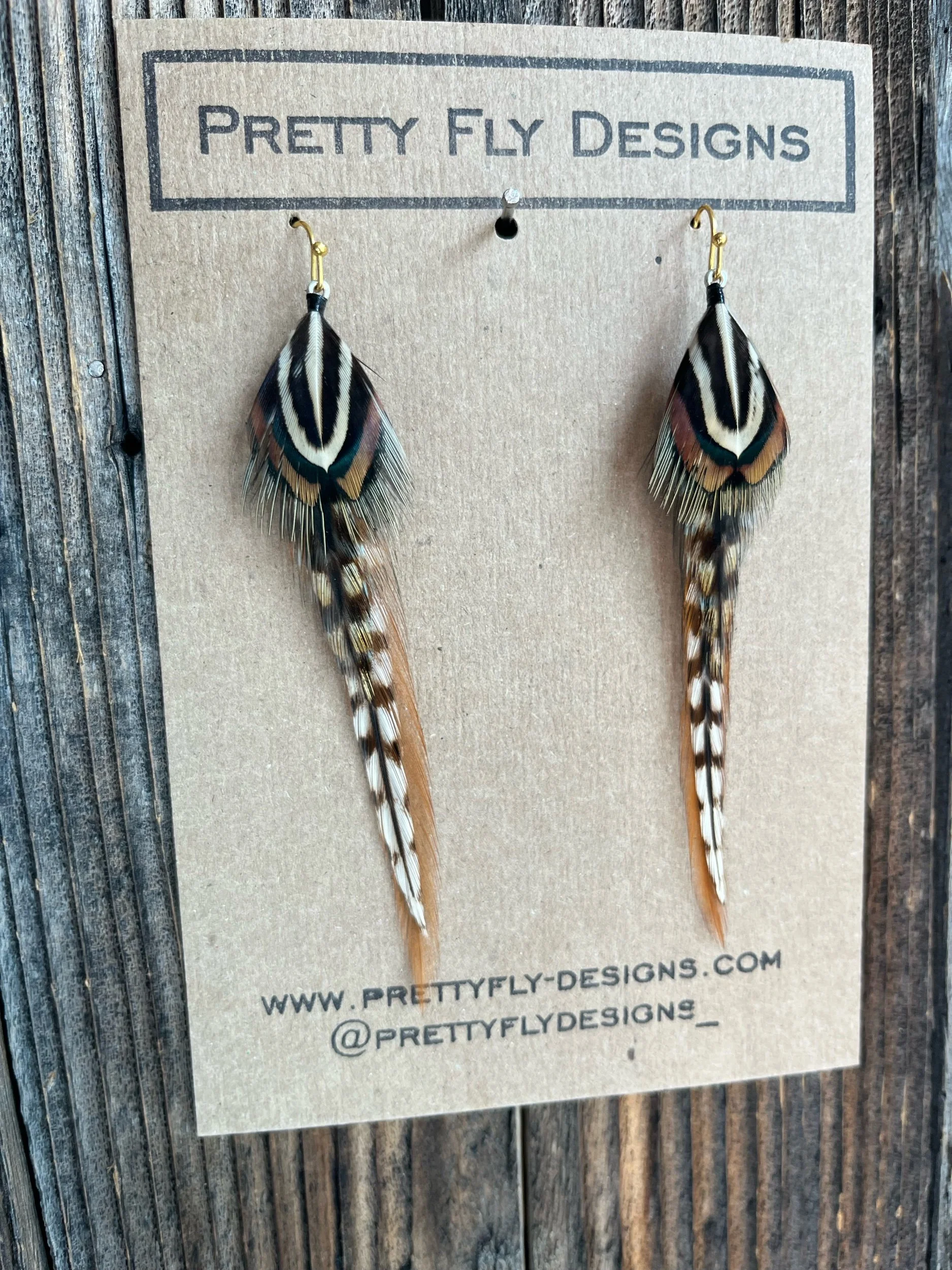 An all naturally colored pair of feather earrings that really pops! Four inches long. Tied with Rooster and Ringneck Pheasant feathers.