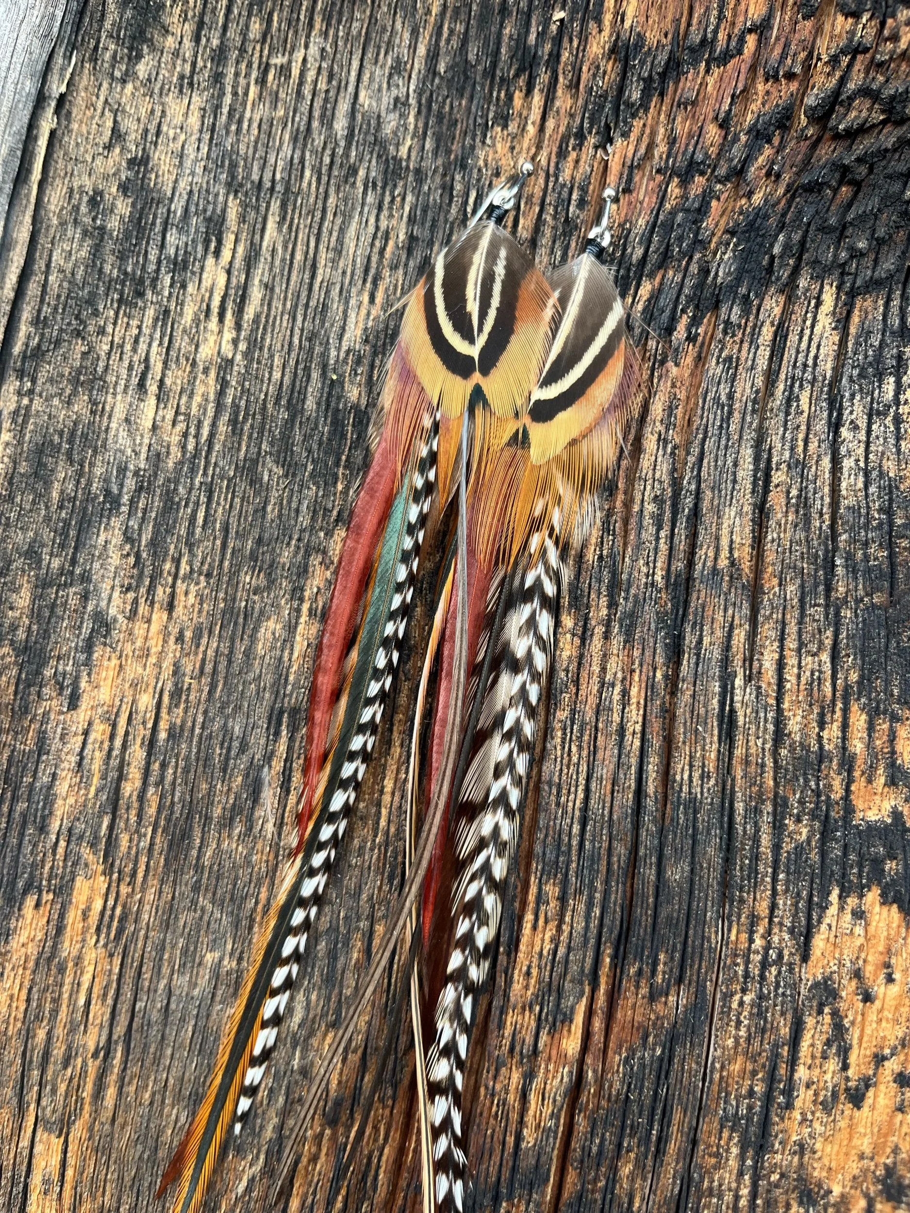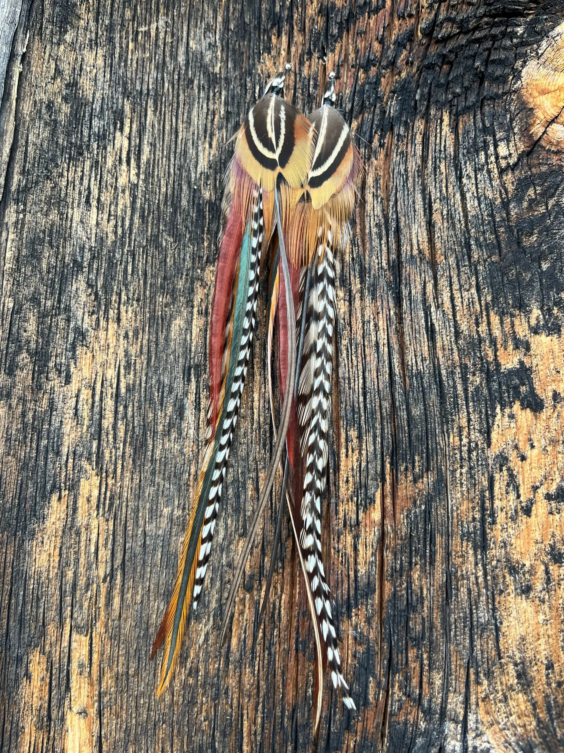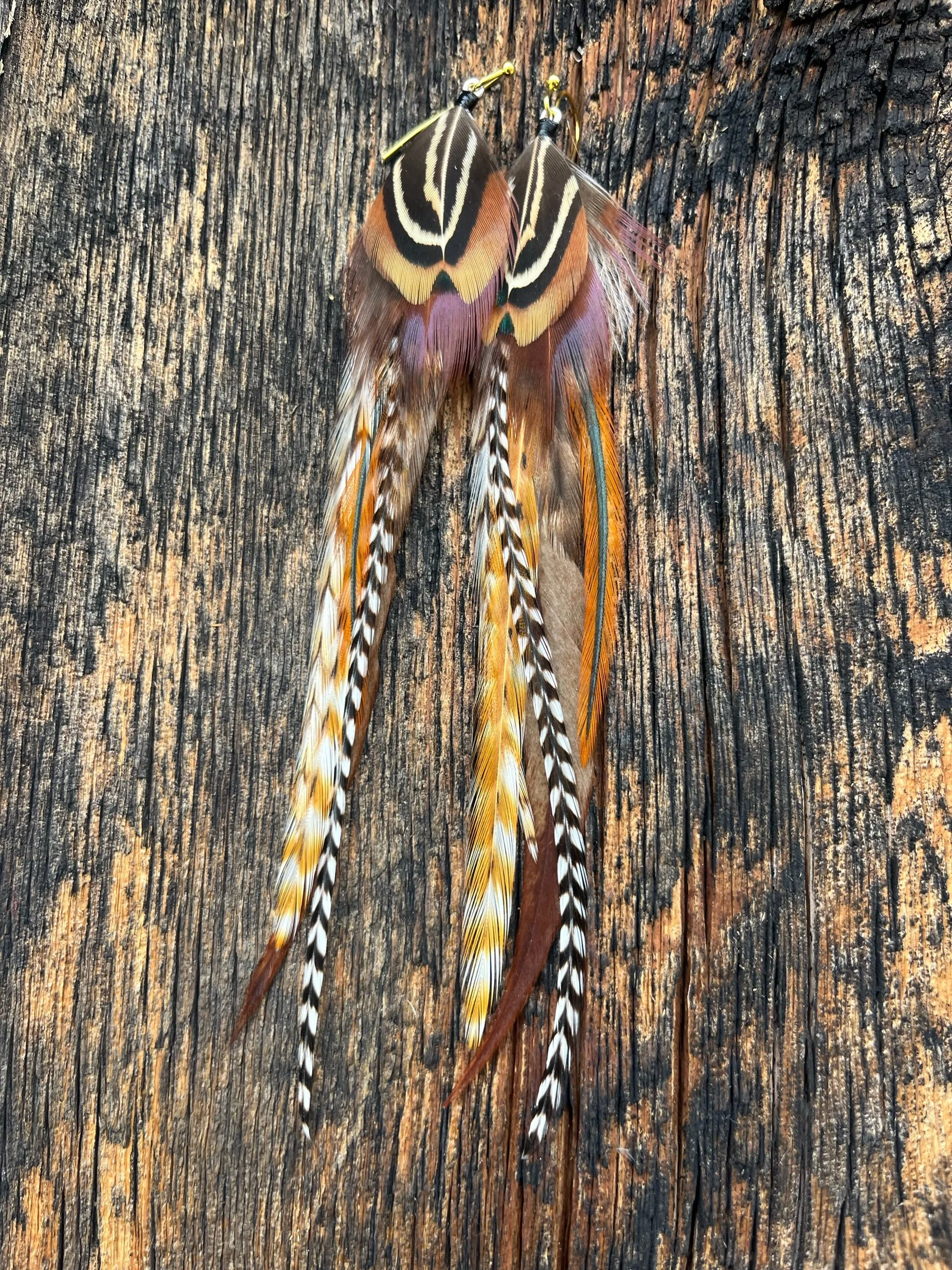 This six inch long pair of feather earrings uses a mix of dyed and naturally colored Rooster feathers with Ringneck Pheasant overlay feathers.