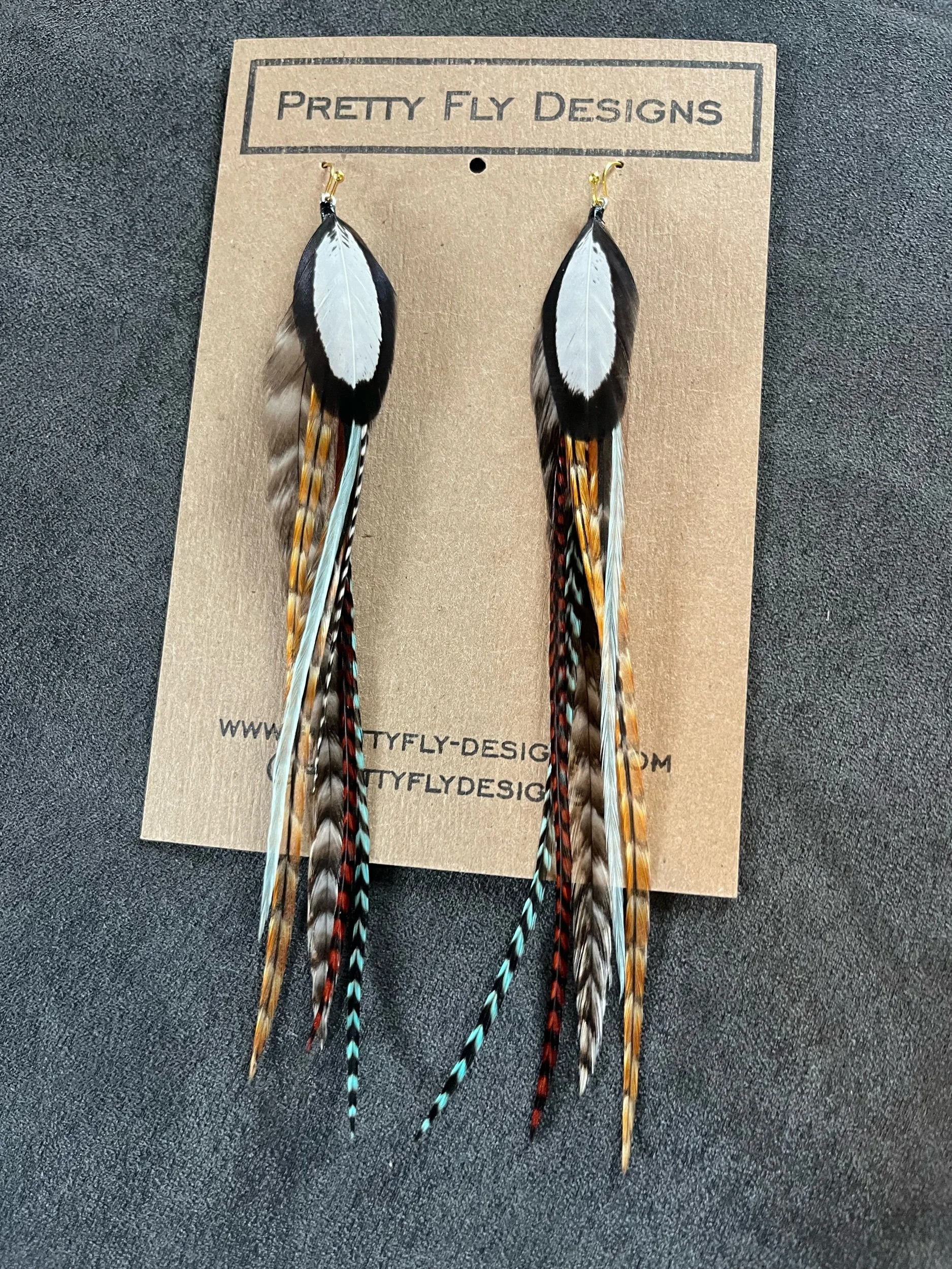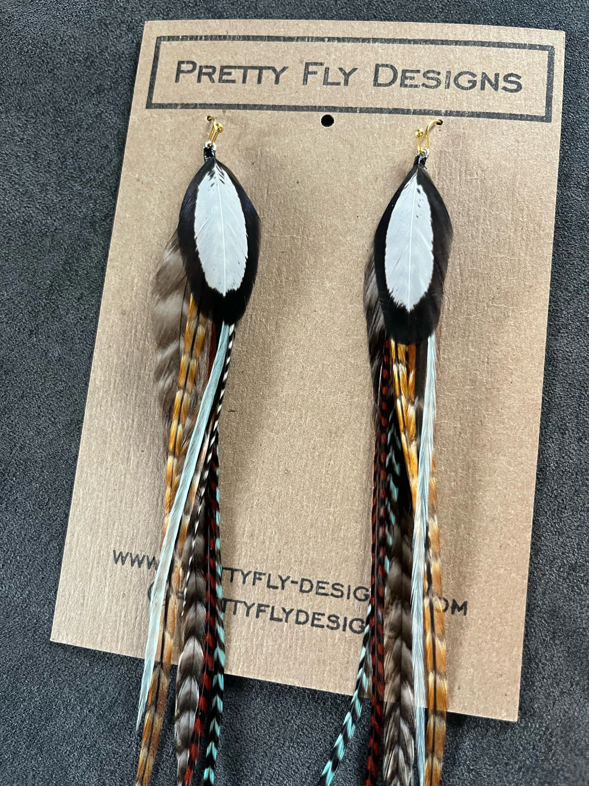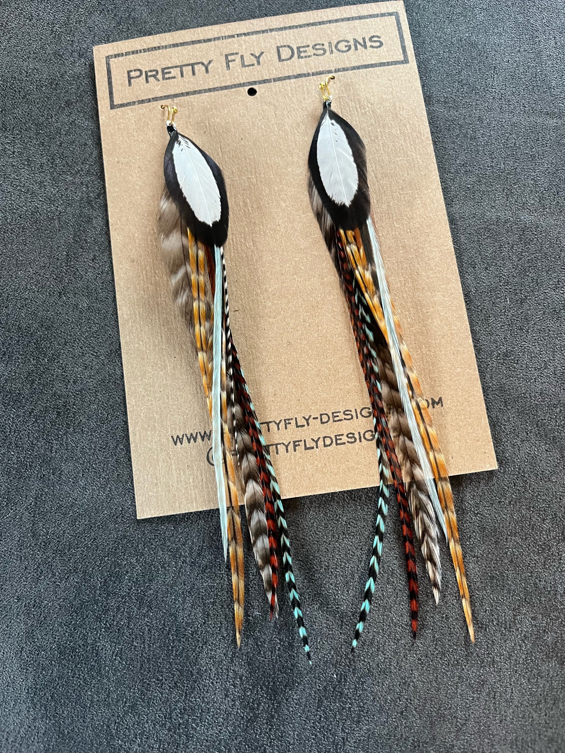 A six inch long blend of natural and dyed colors in a popular Western style pair of feather earrings! Tied with Rooster feathers.