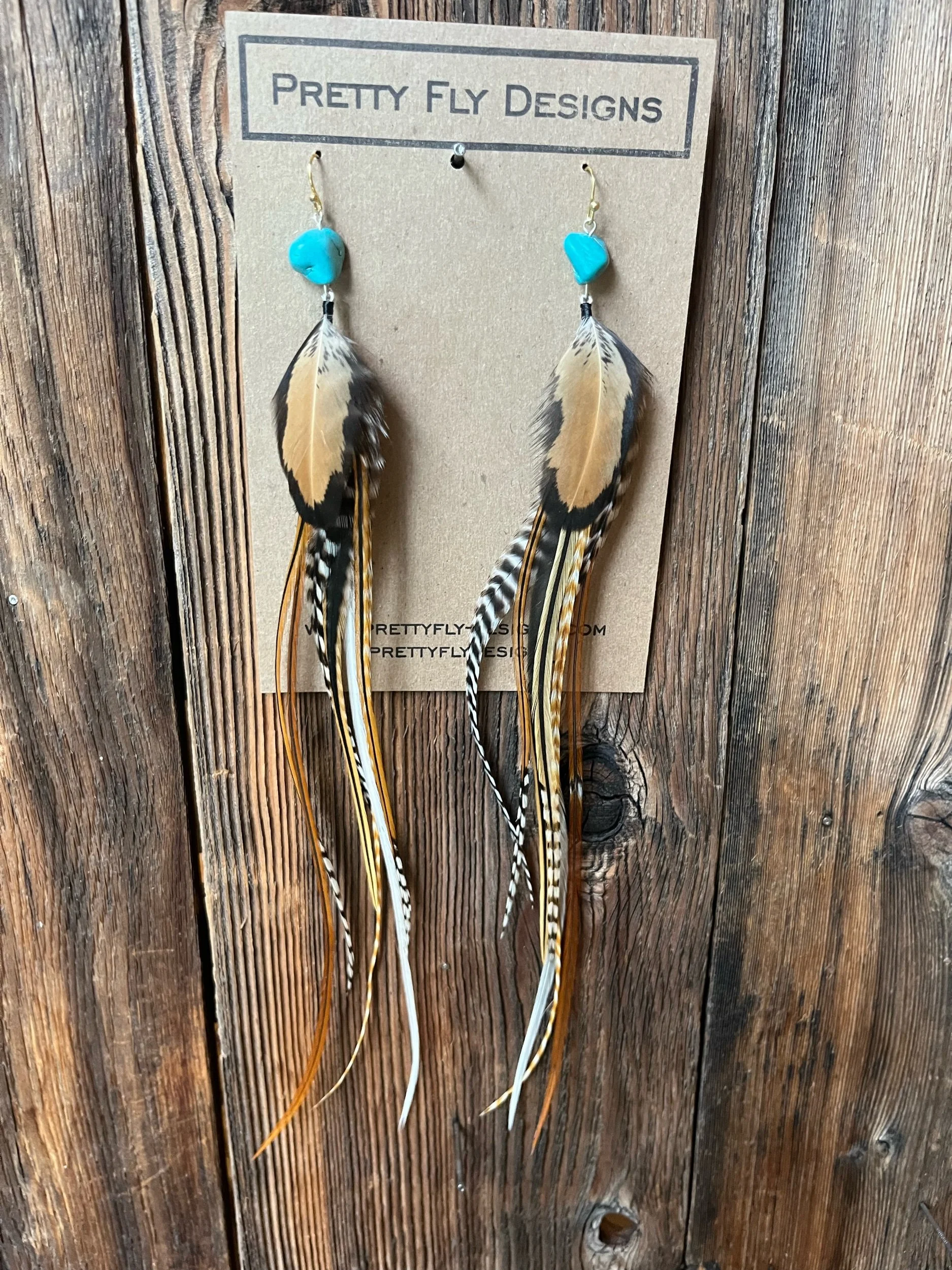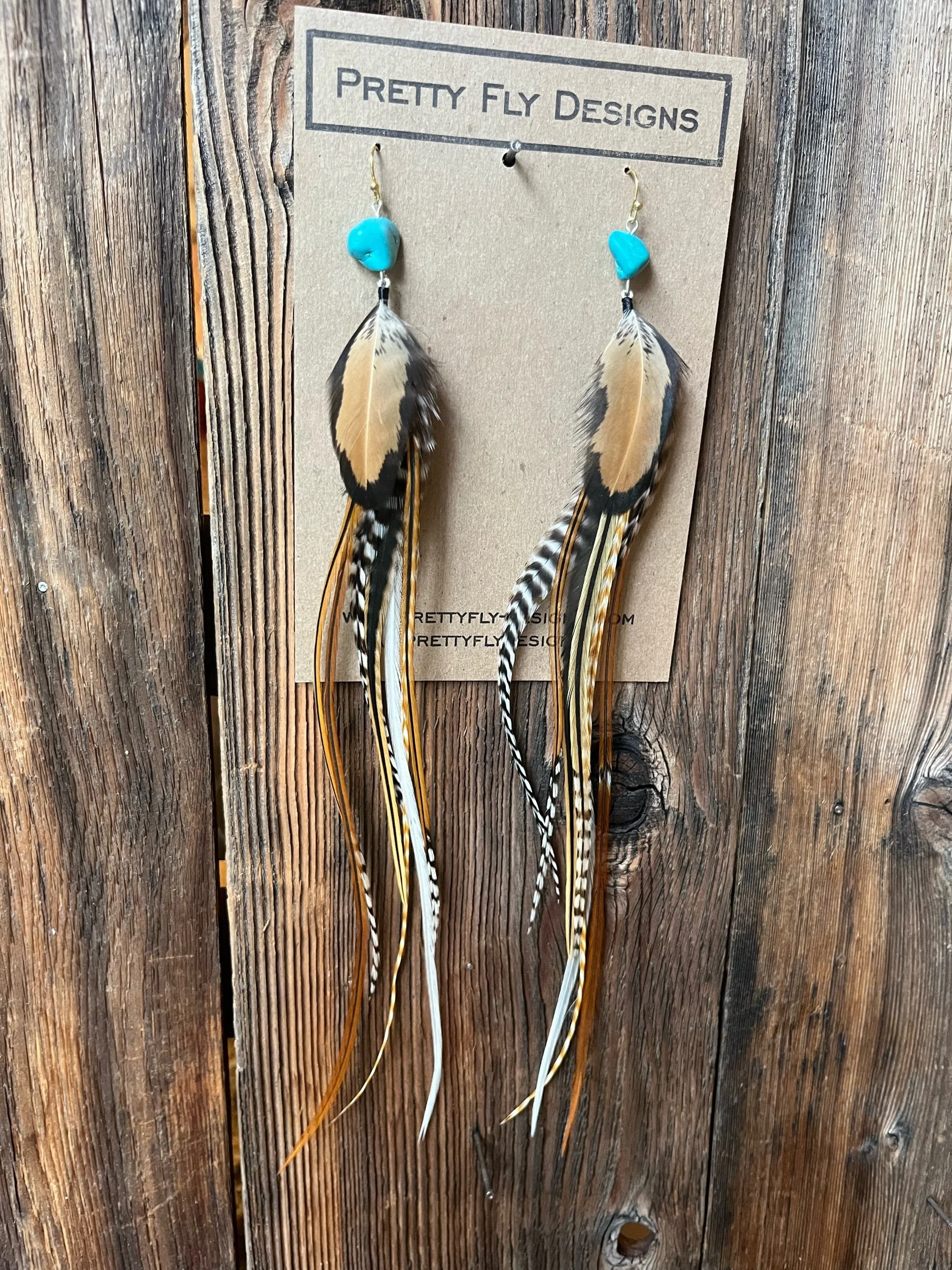 Nine inch long feathers in all natural colors! Tied with Rooster feathers. Topped with turquoise stones!