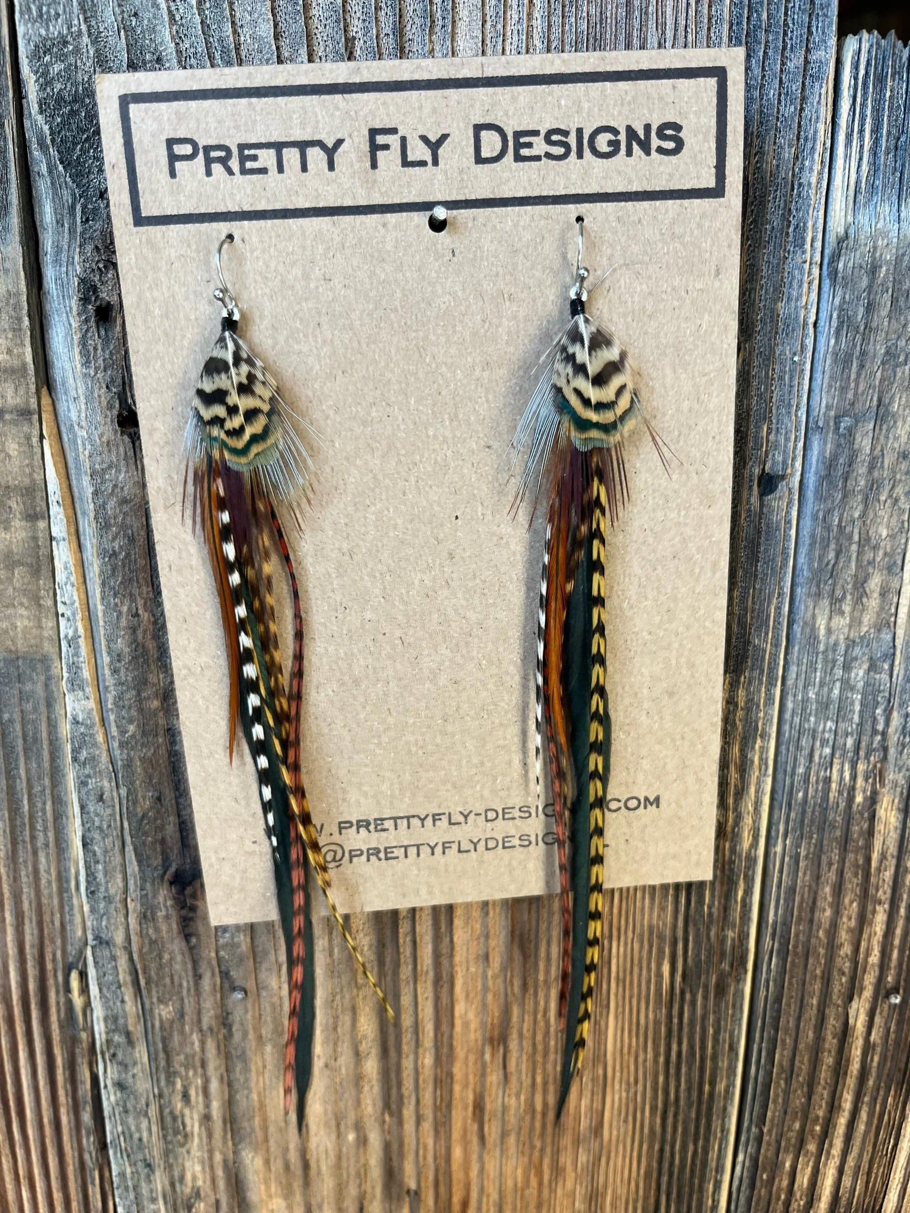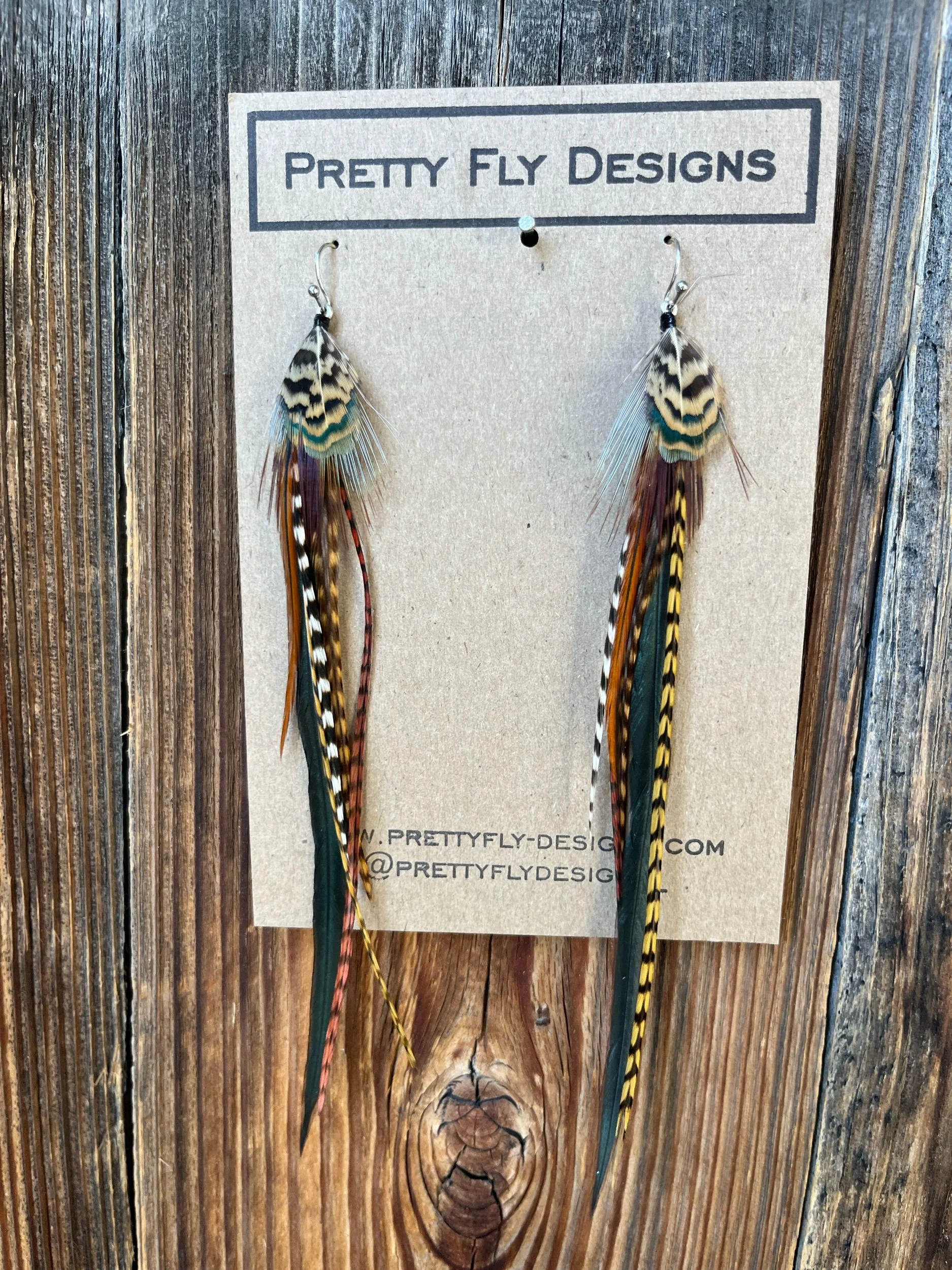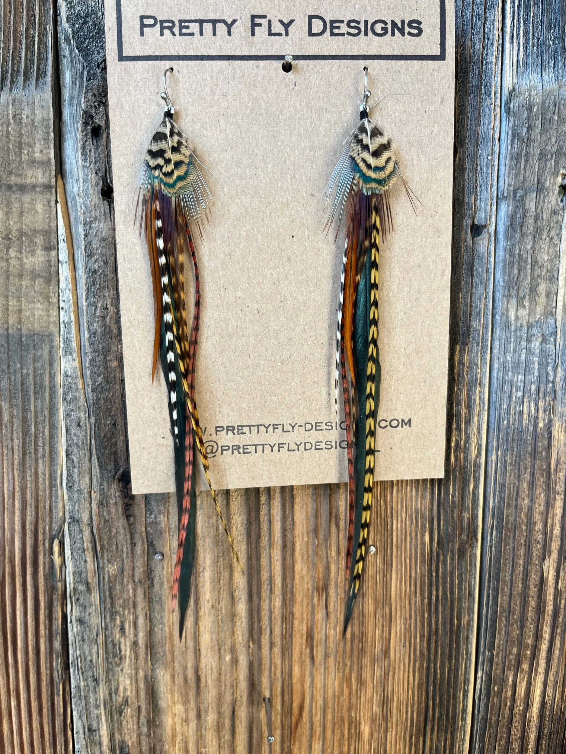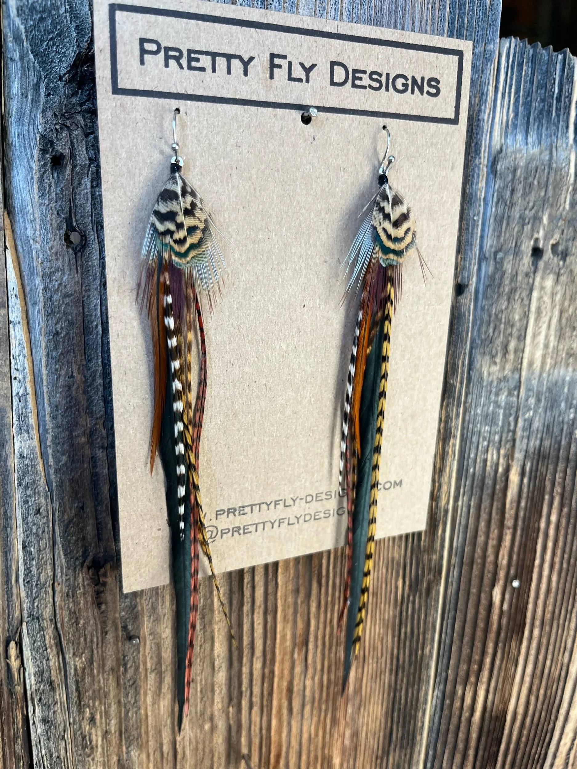 Six and a half inch long blend with a natural green sheen base feather and dyed skinny feathers. Tied with Rooster and Ringneck Pheasant.