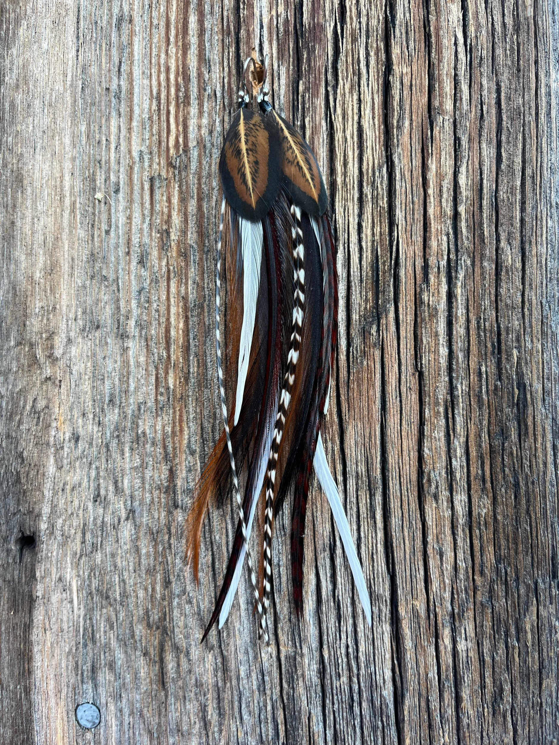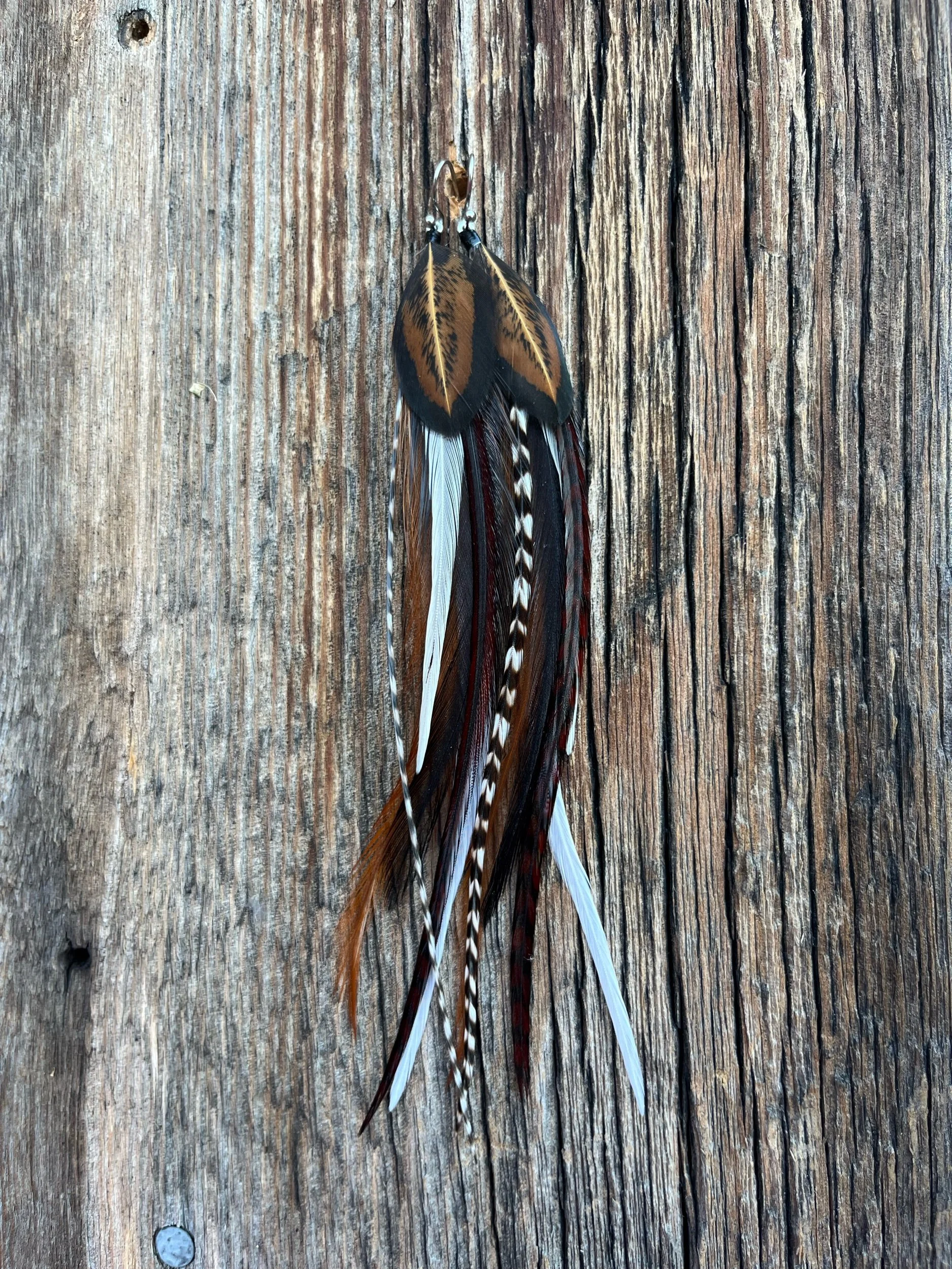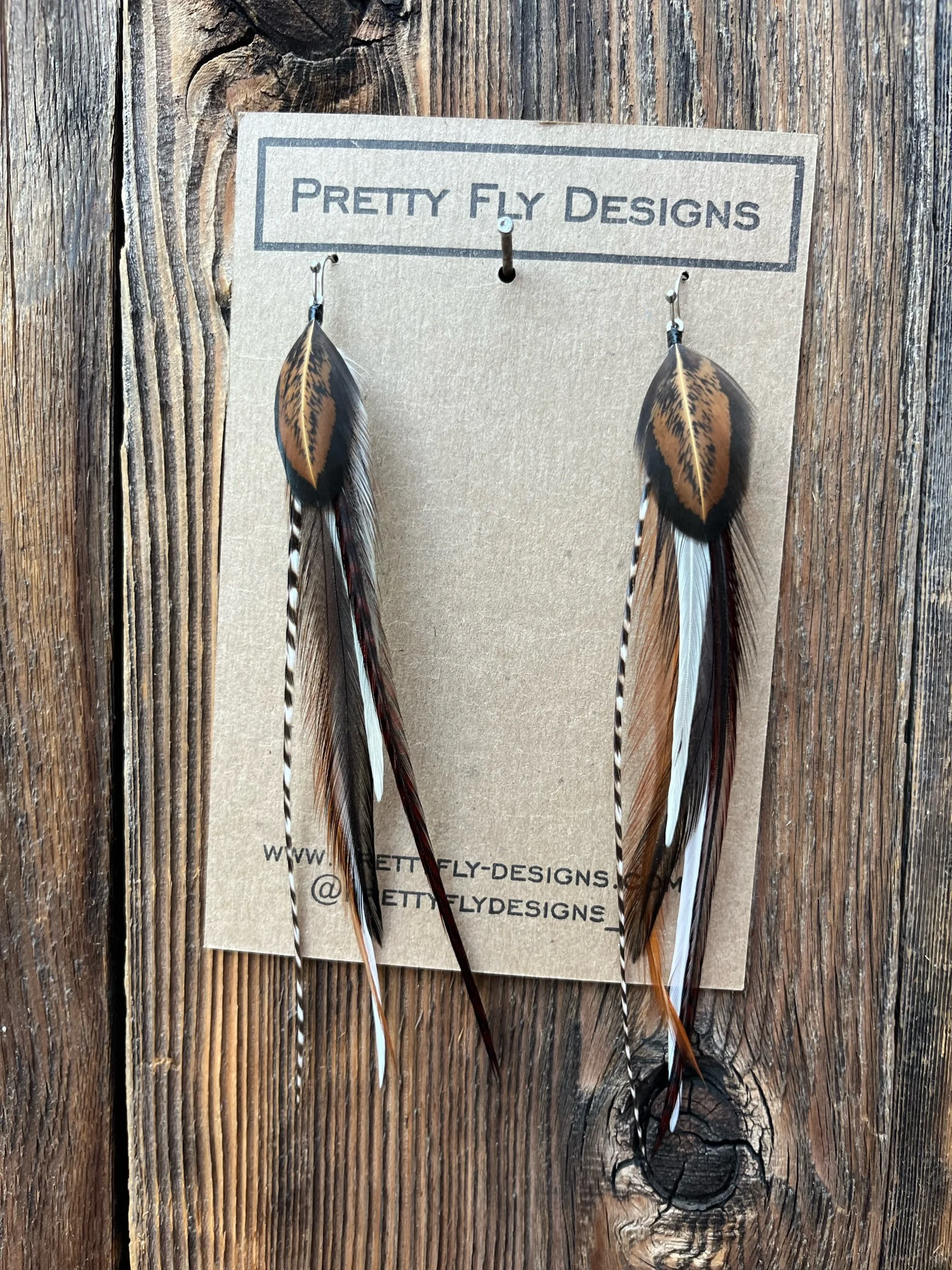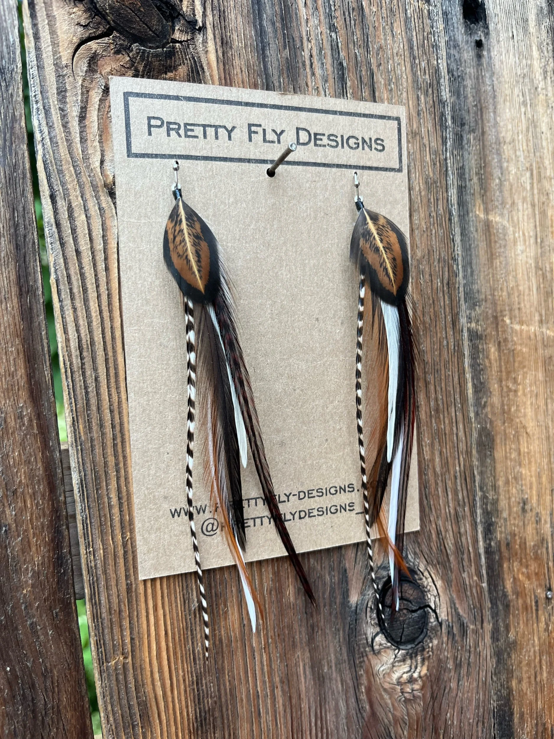 Five inch long pair of the super popular black, brown and white blend! Looks just like Cowprint! Tied with Rooster feathers.