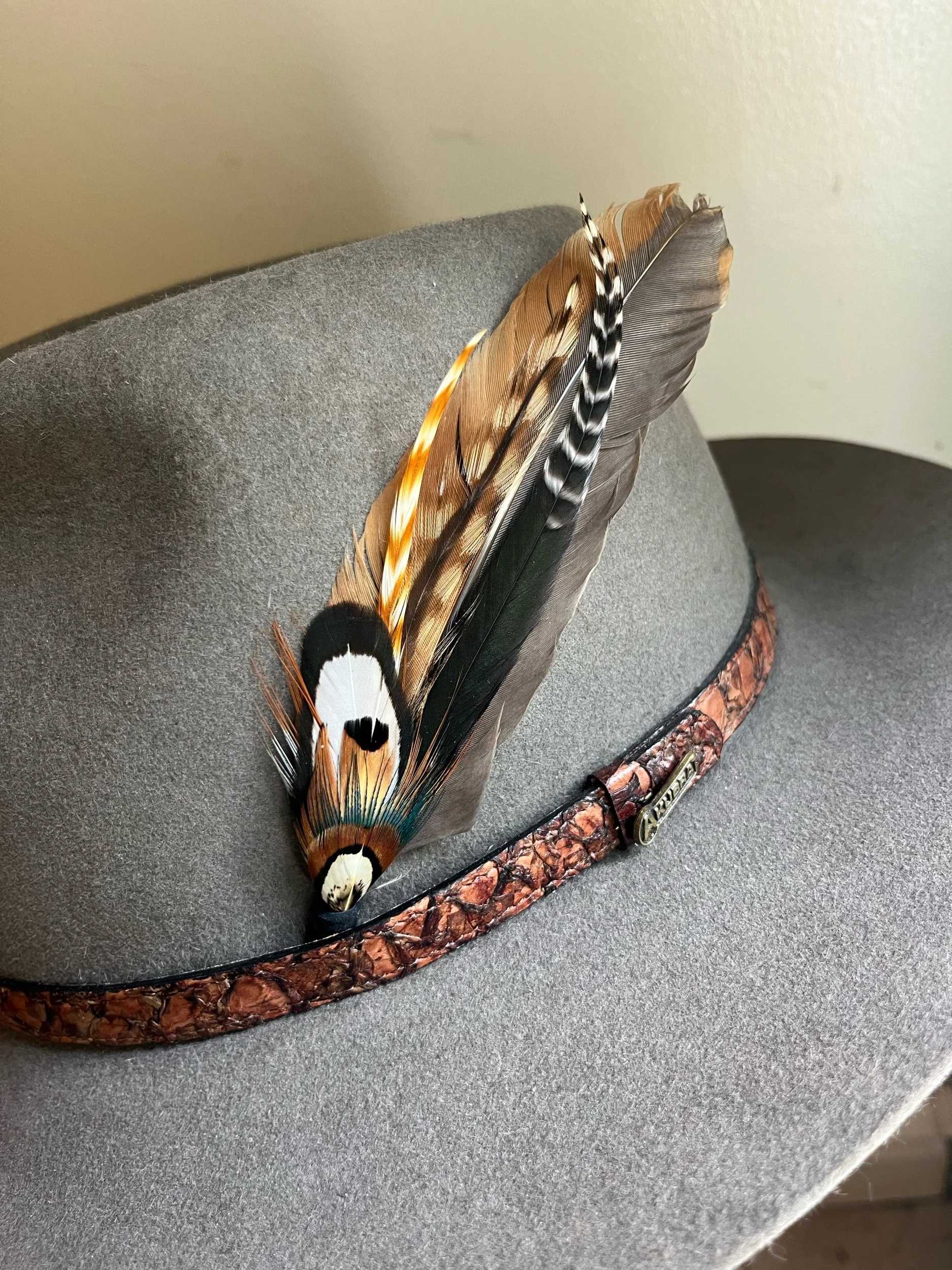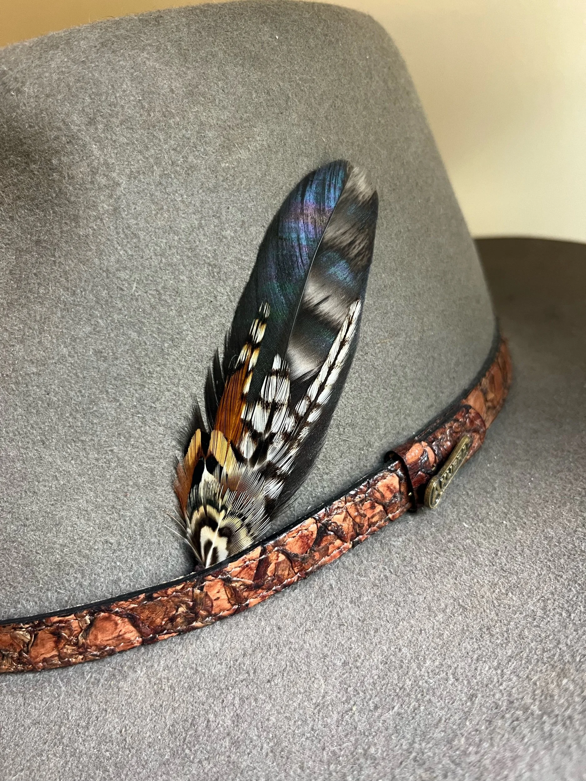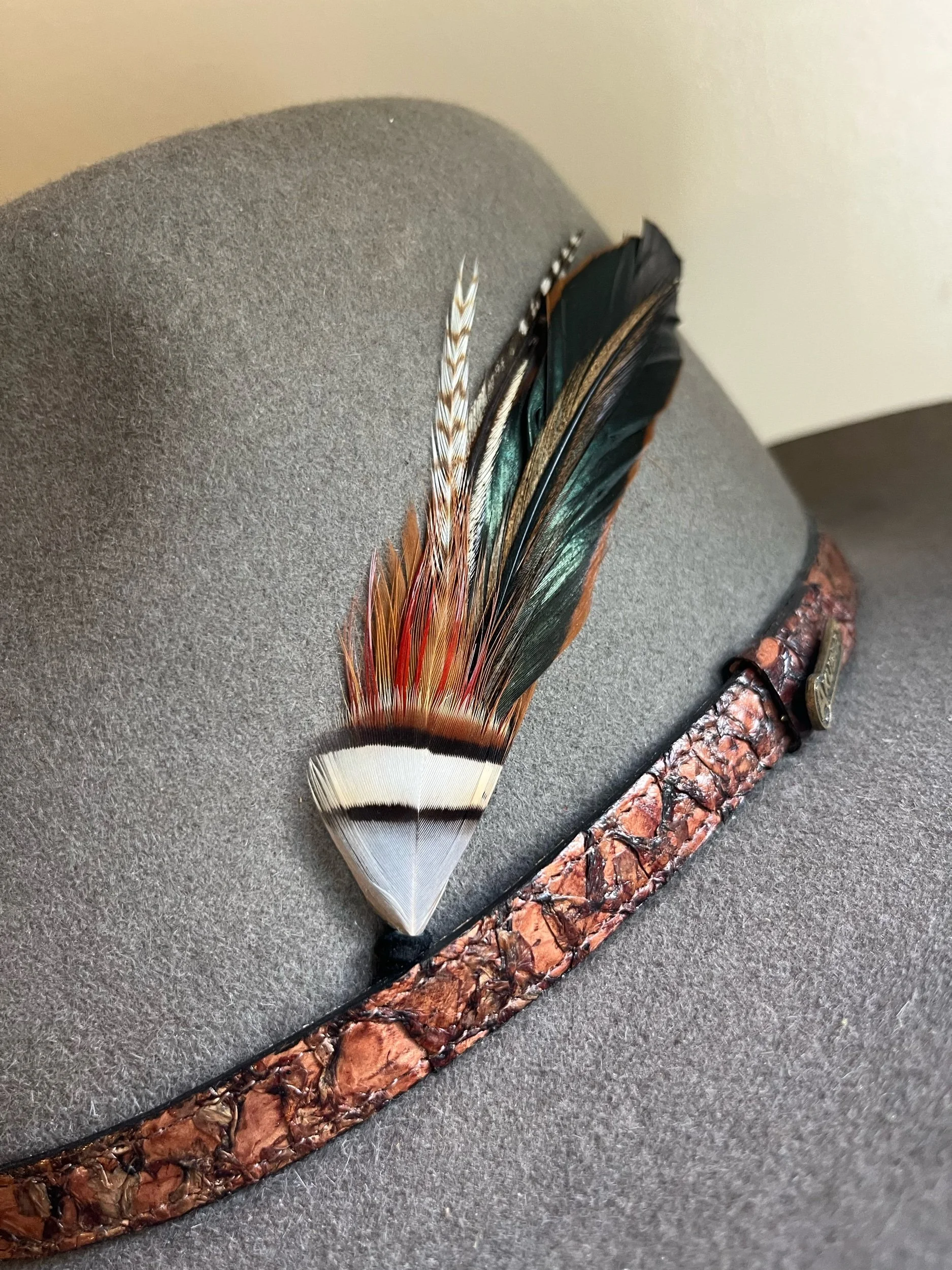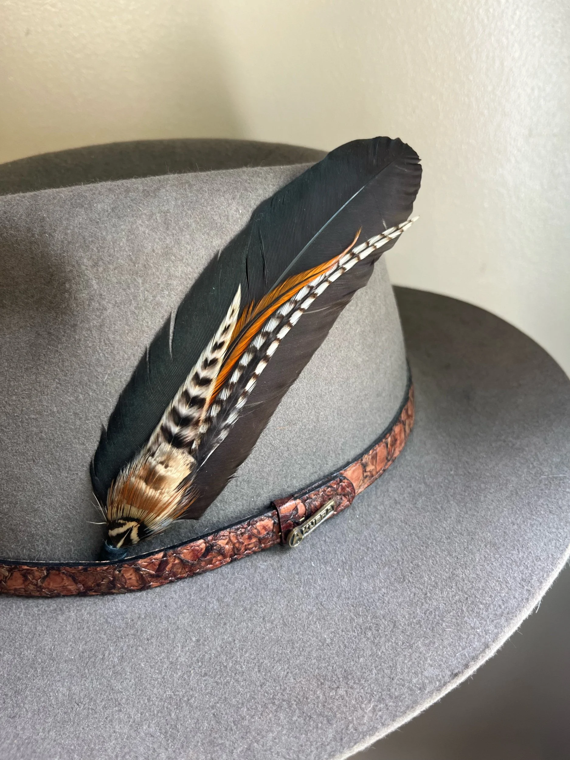 Handmade with the most bold feathers, designed to give your hat a unique “pop!” Each features a leather tip designed to hold the bundle between the band and hat, with a loop on the end so it can be permanently stitched in if desired.