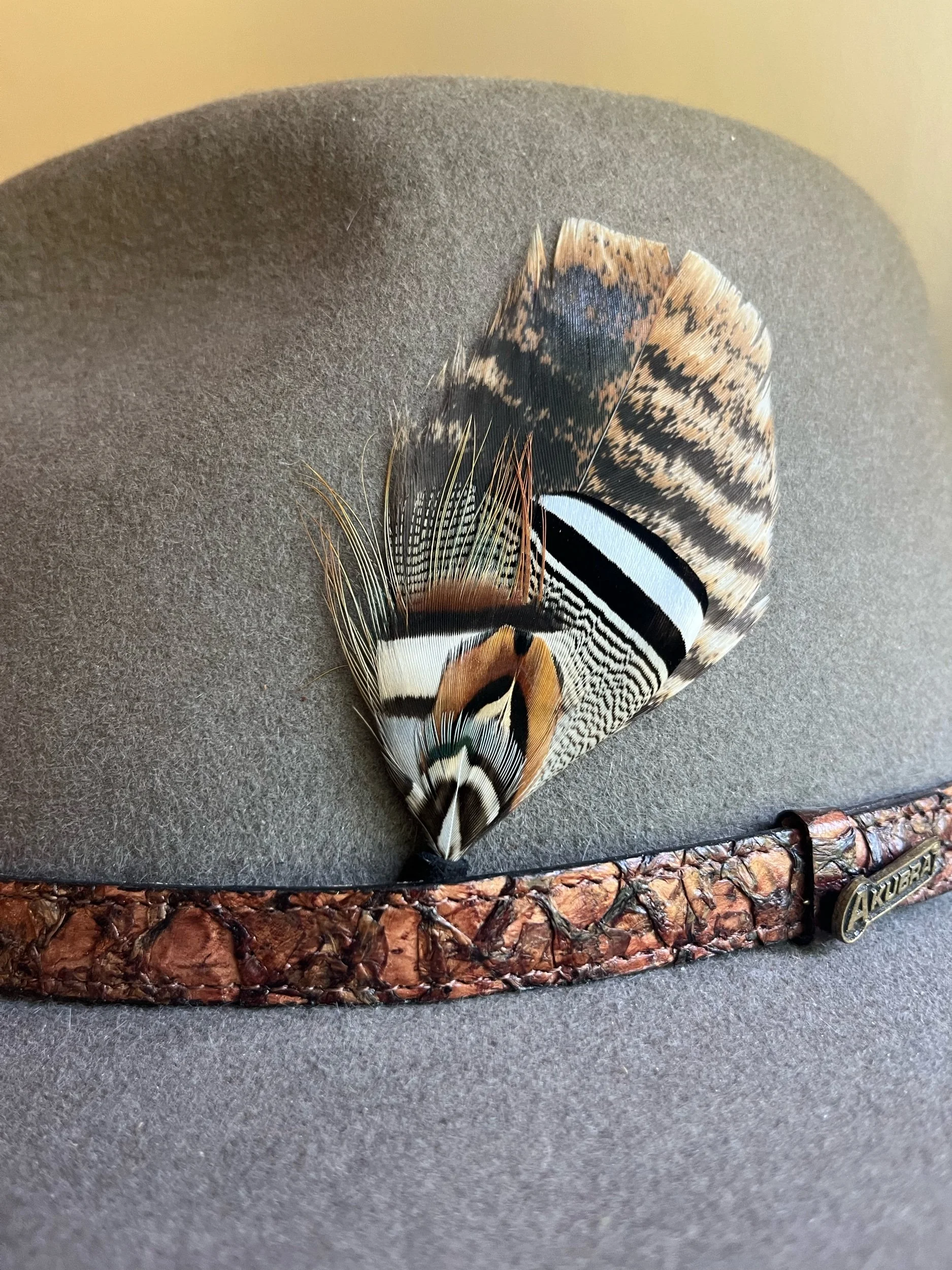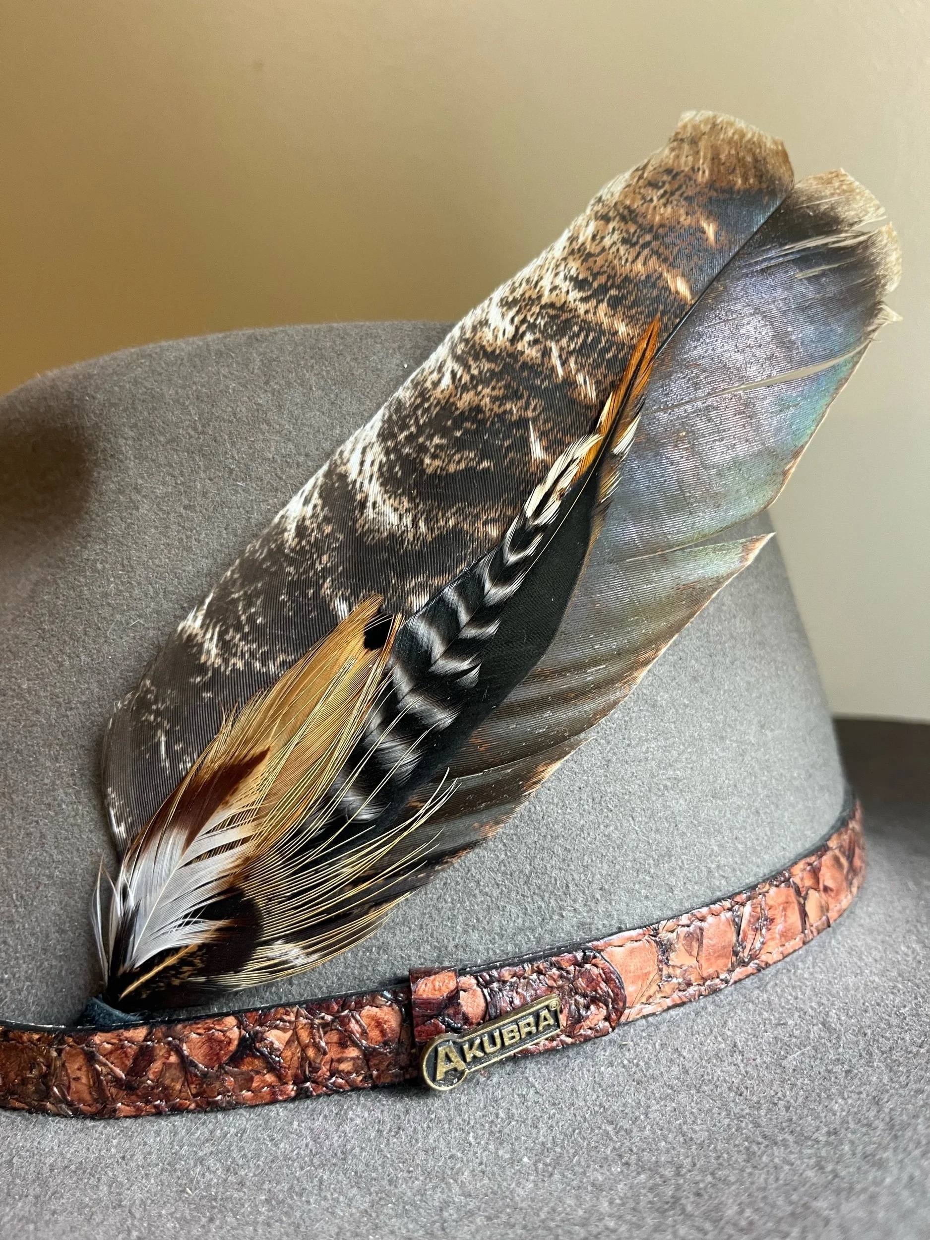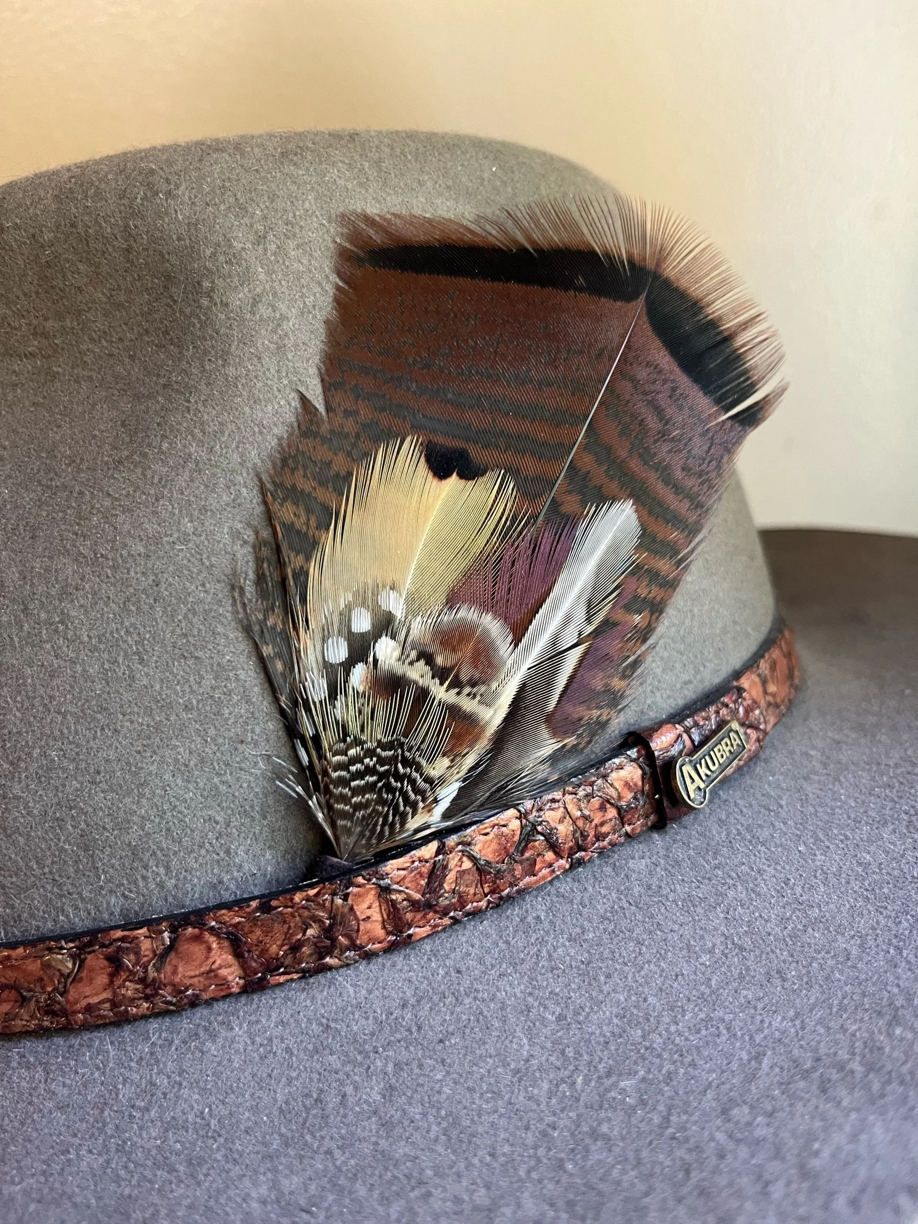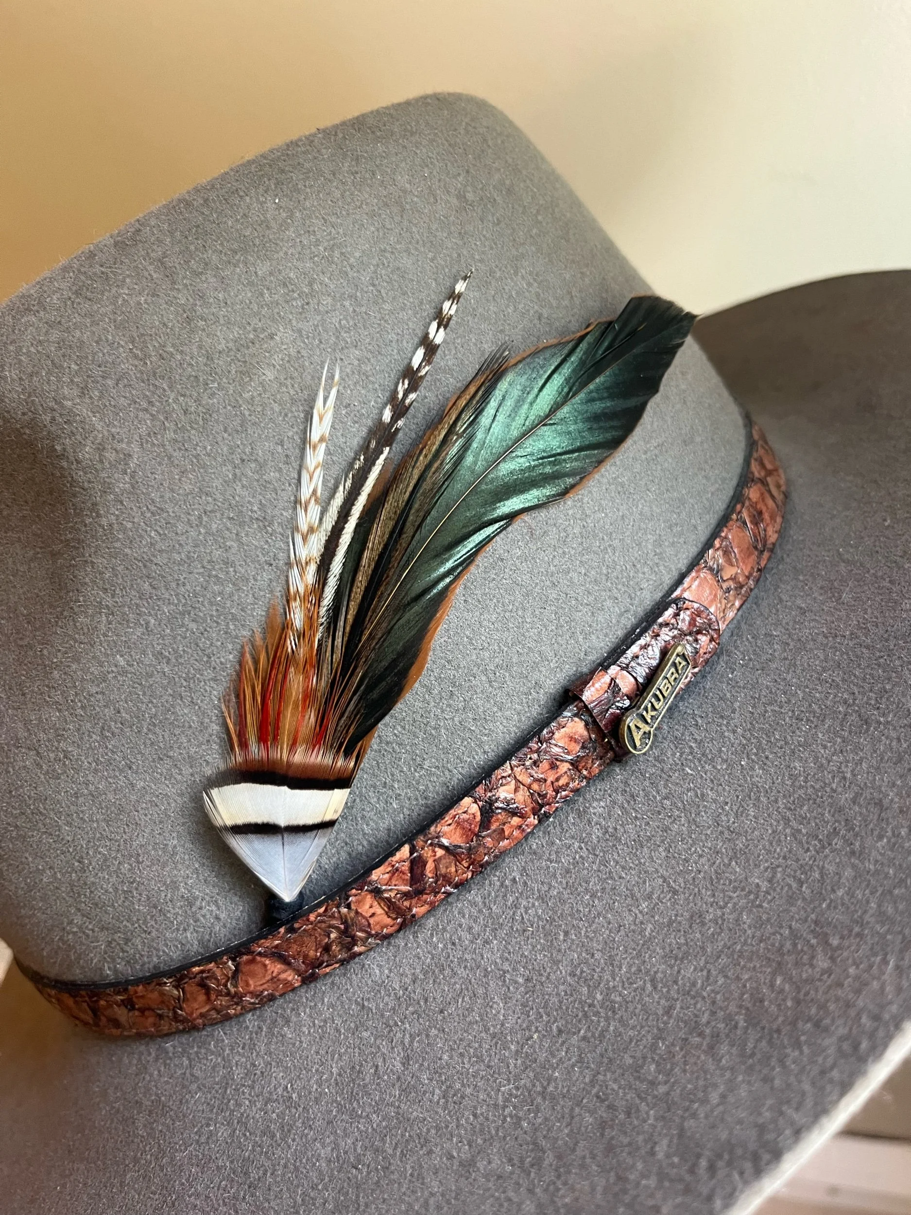 Handmade with the most bold feathers, designed to give your hat a unique “pop!” Each features a leather tip designed to hold the bundle between the band and hat, with a loop on the end so it can be permanently stitched in if desired.