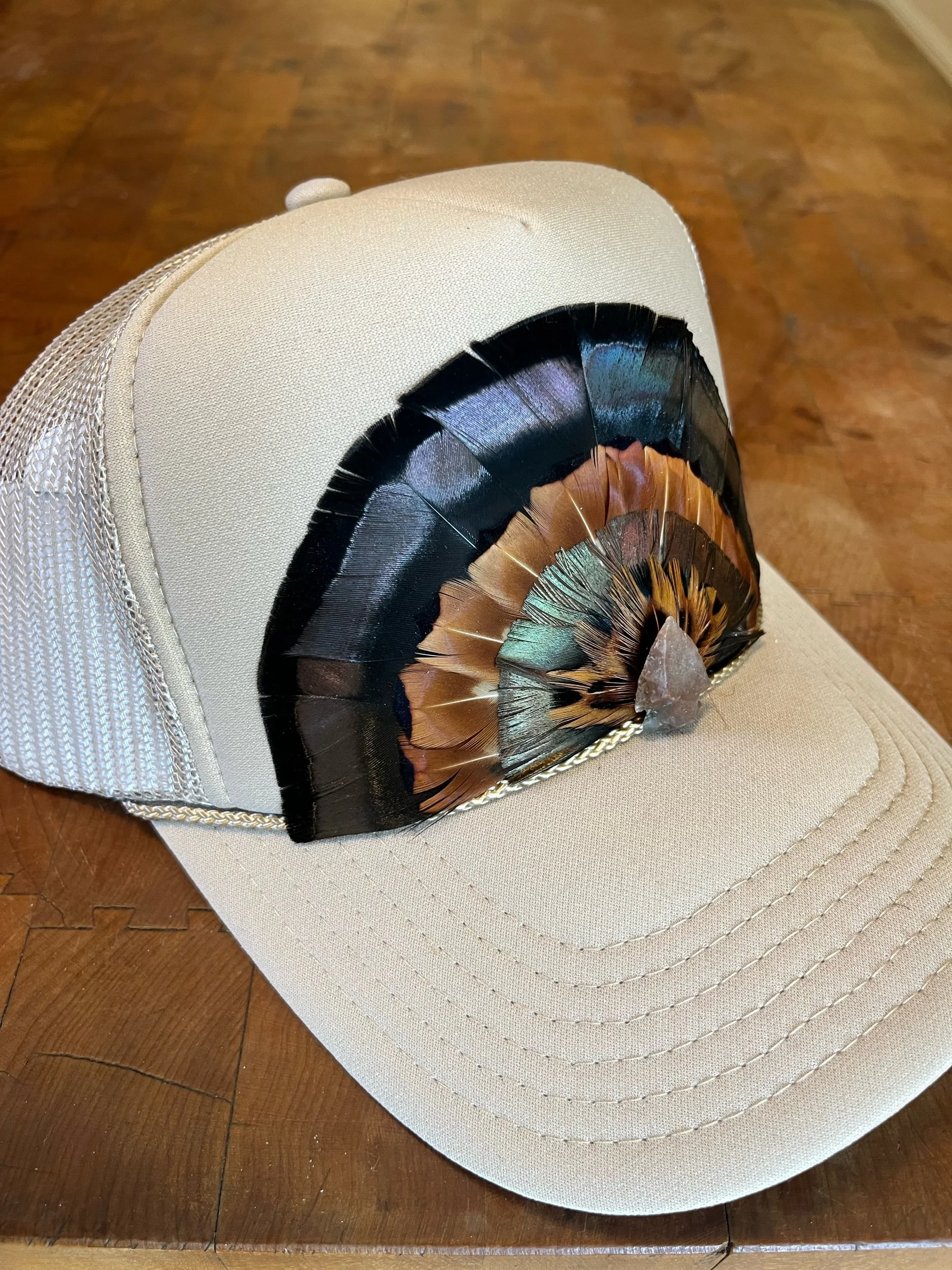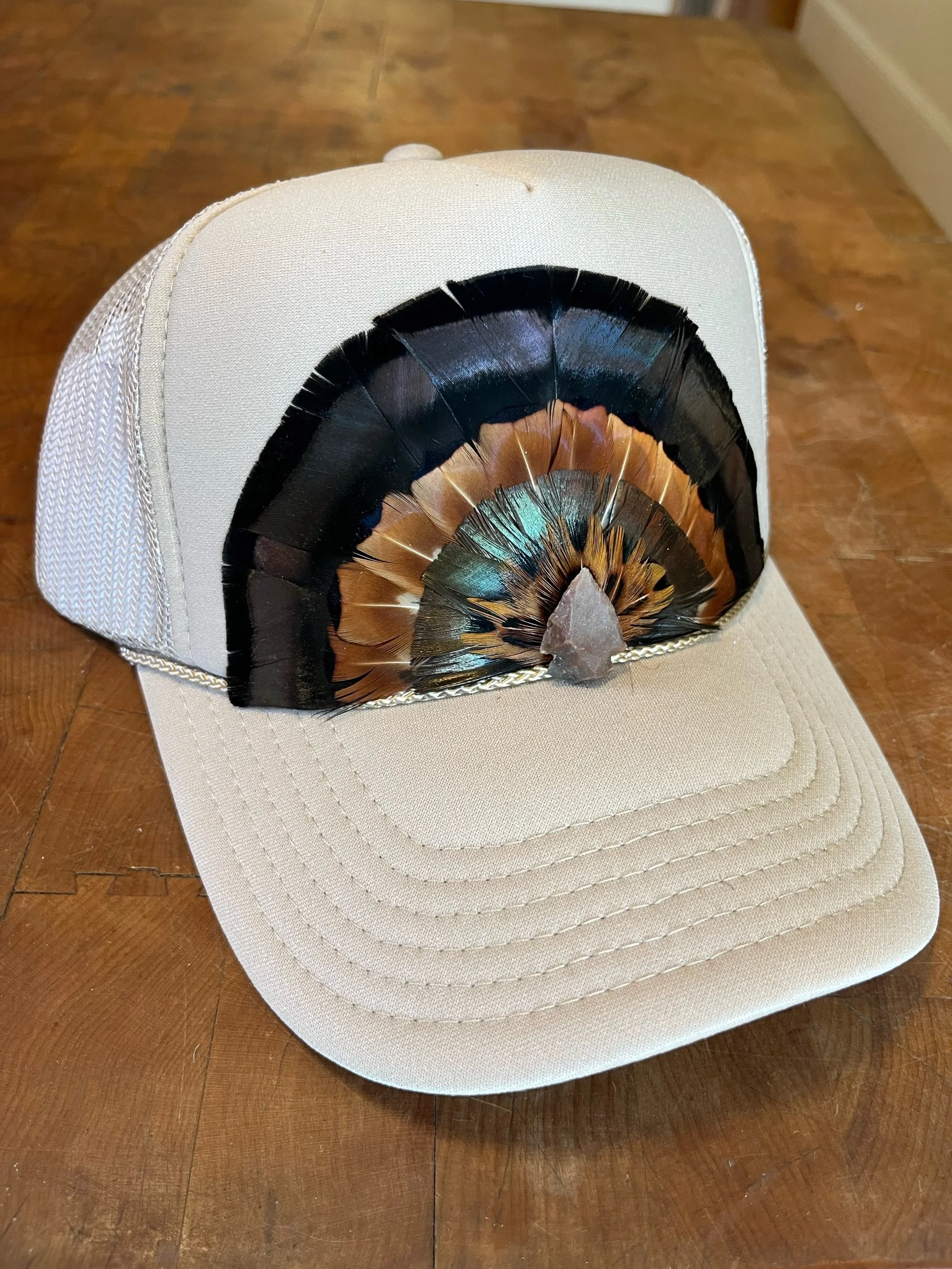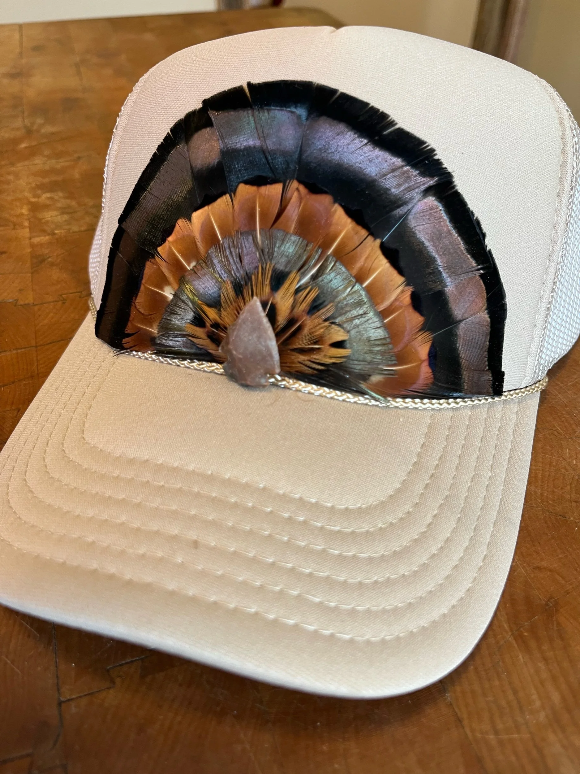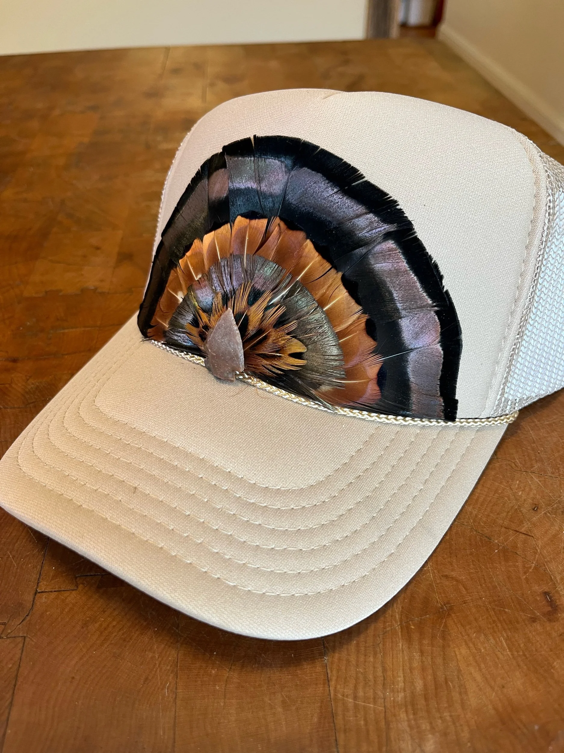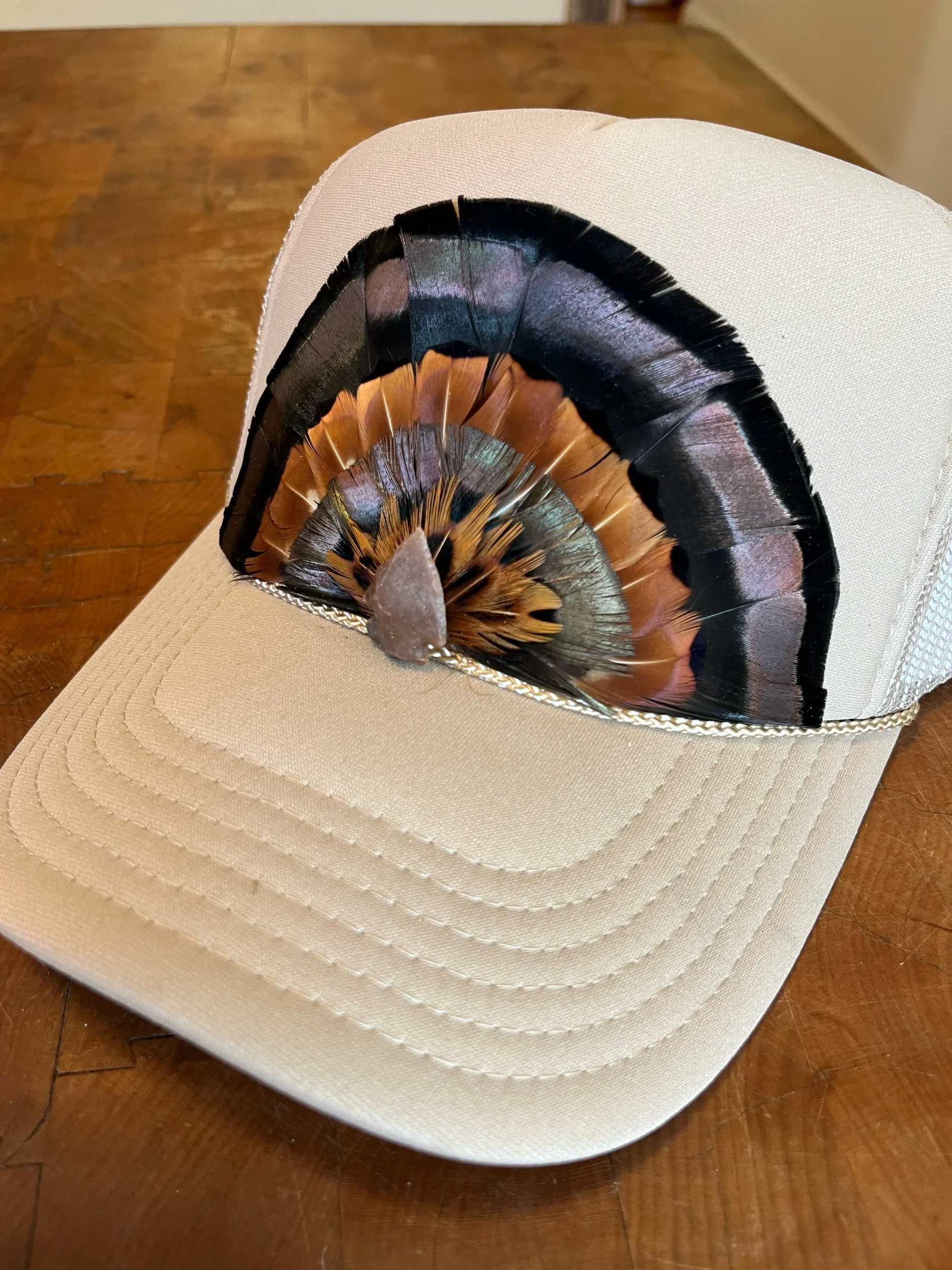 All tan Otto mid crown foam feather trucker hat! Featuring Virginia Turkey and Ringneck Pheasant layered feathers. Adorned with an arrowhead!