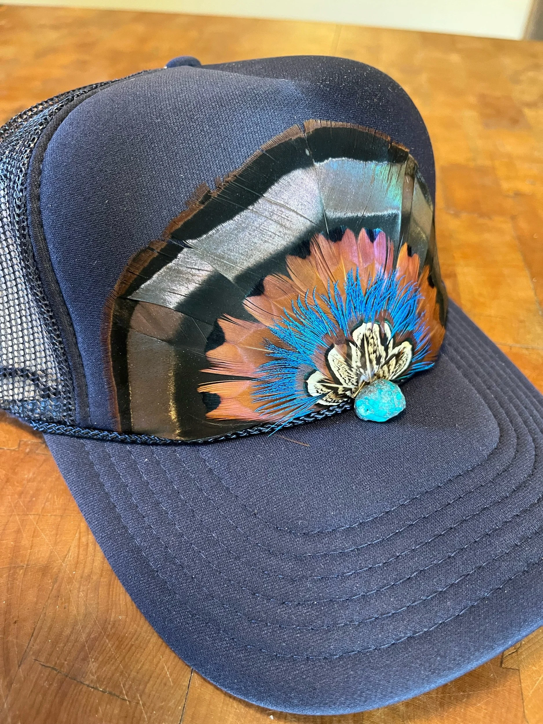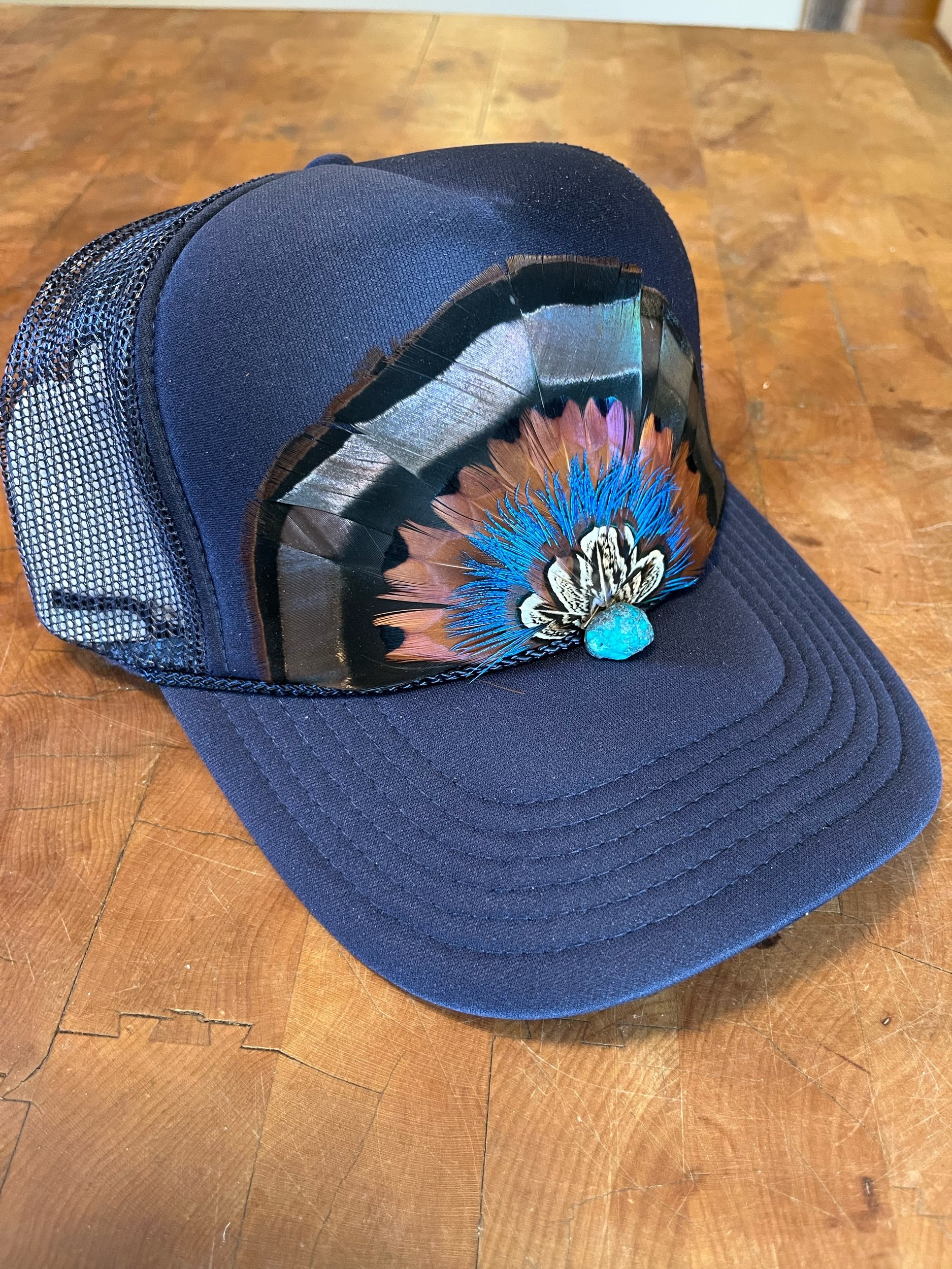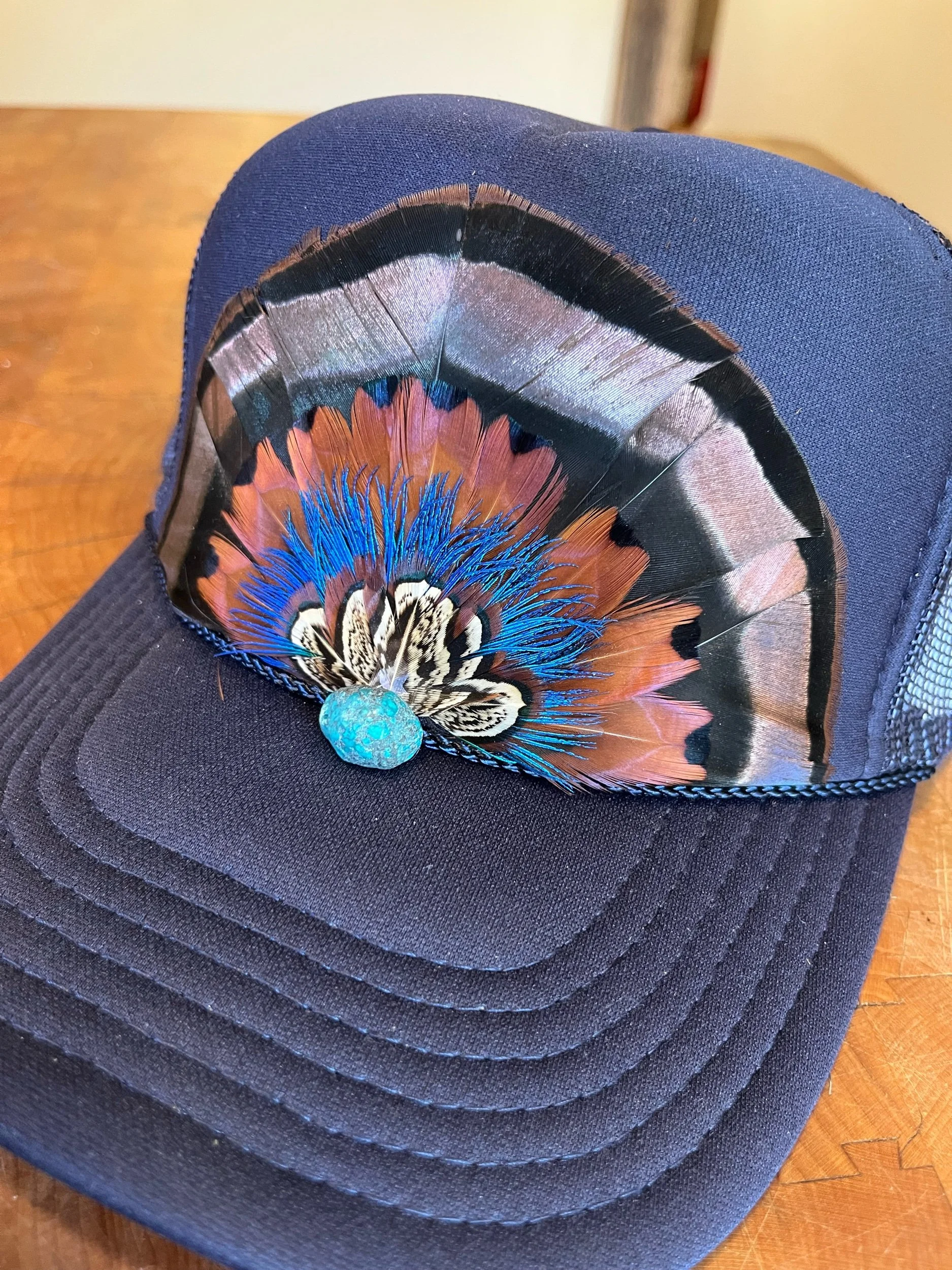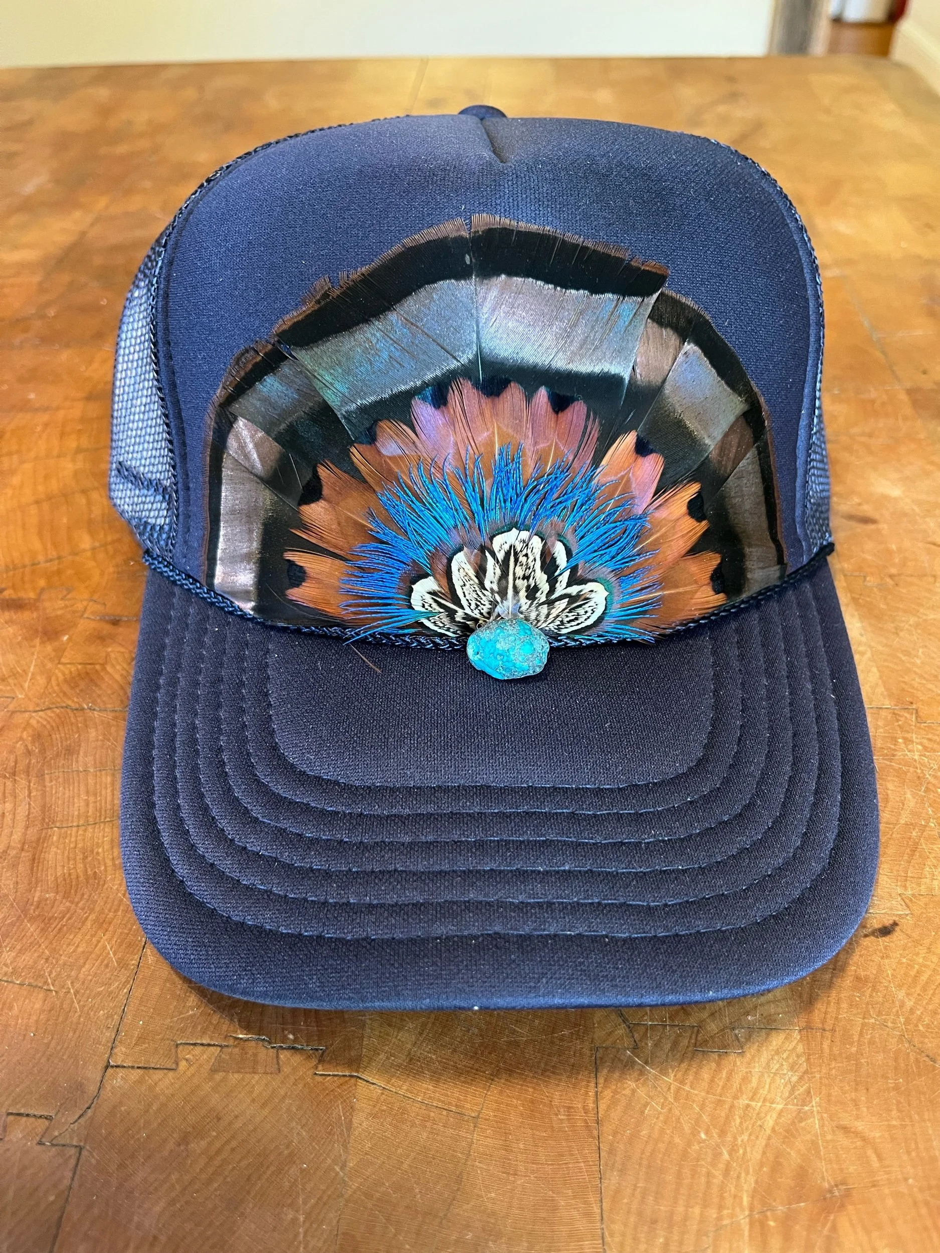 Navy blue Otto mid crown feather trucker hat with Virginia Turkey, Ringneck Pheasant and Peacock breast feathers. Adorned with a turquoise stone.