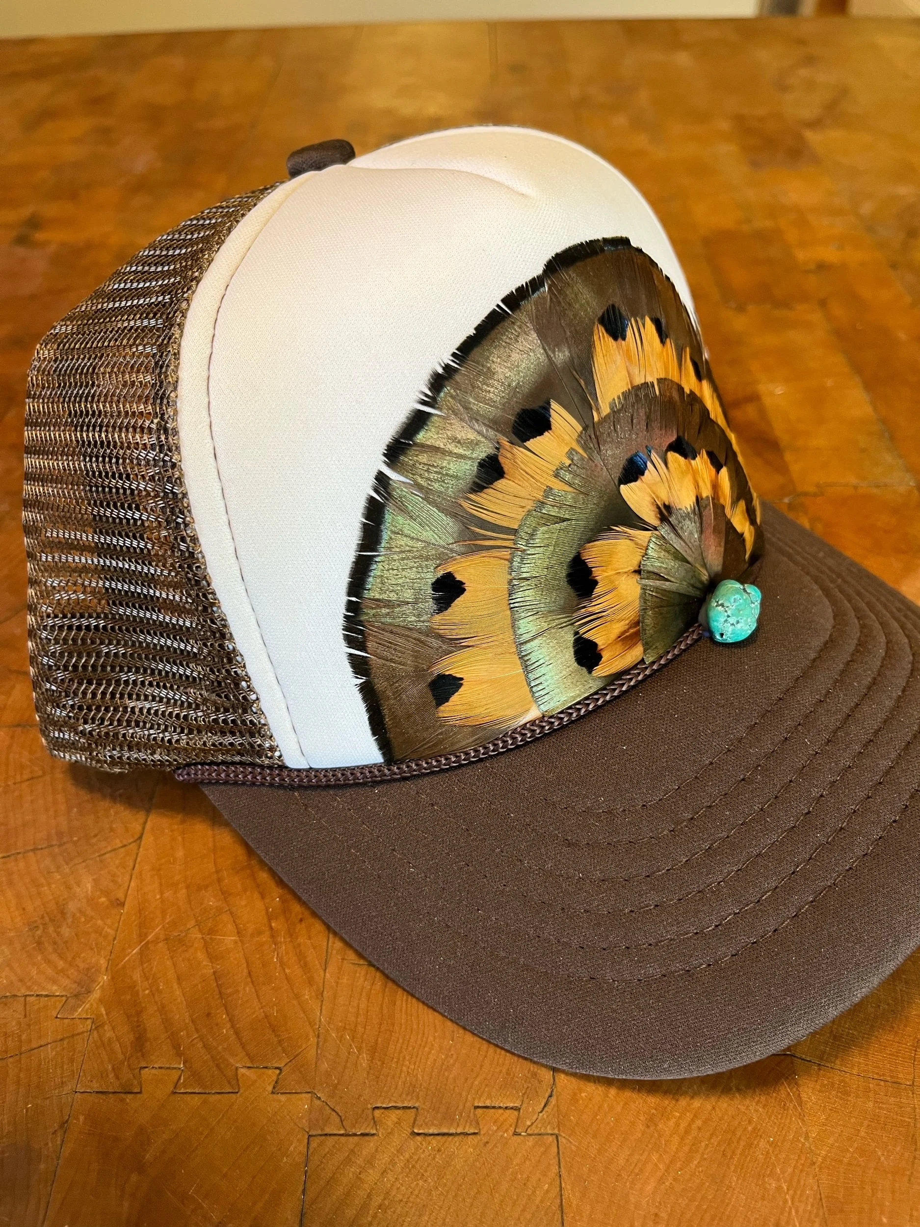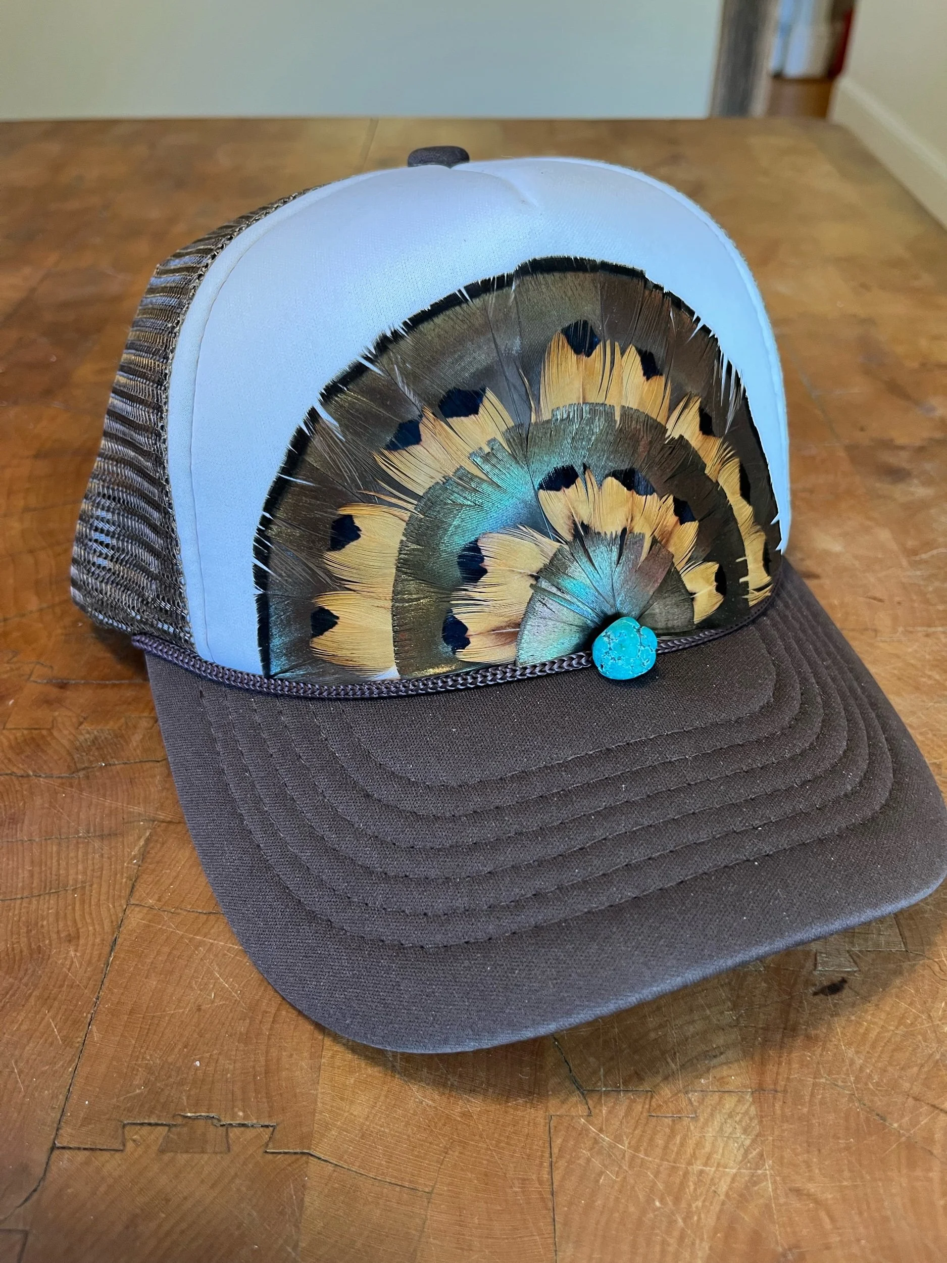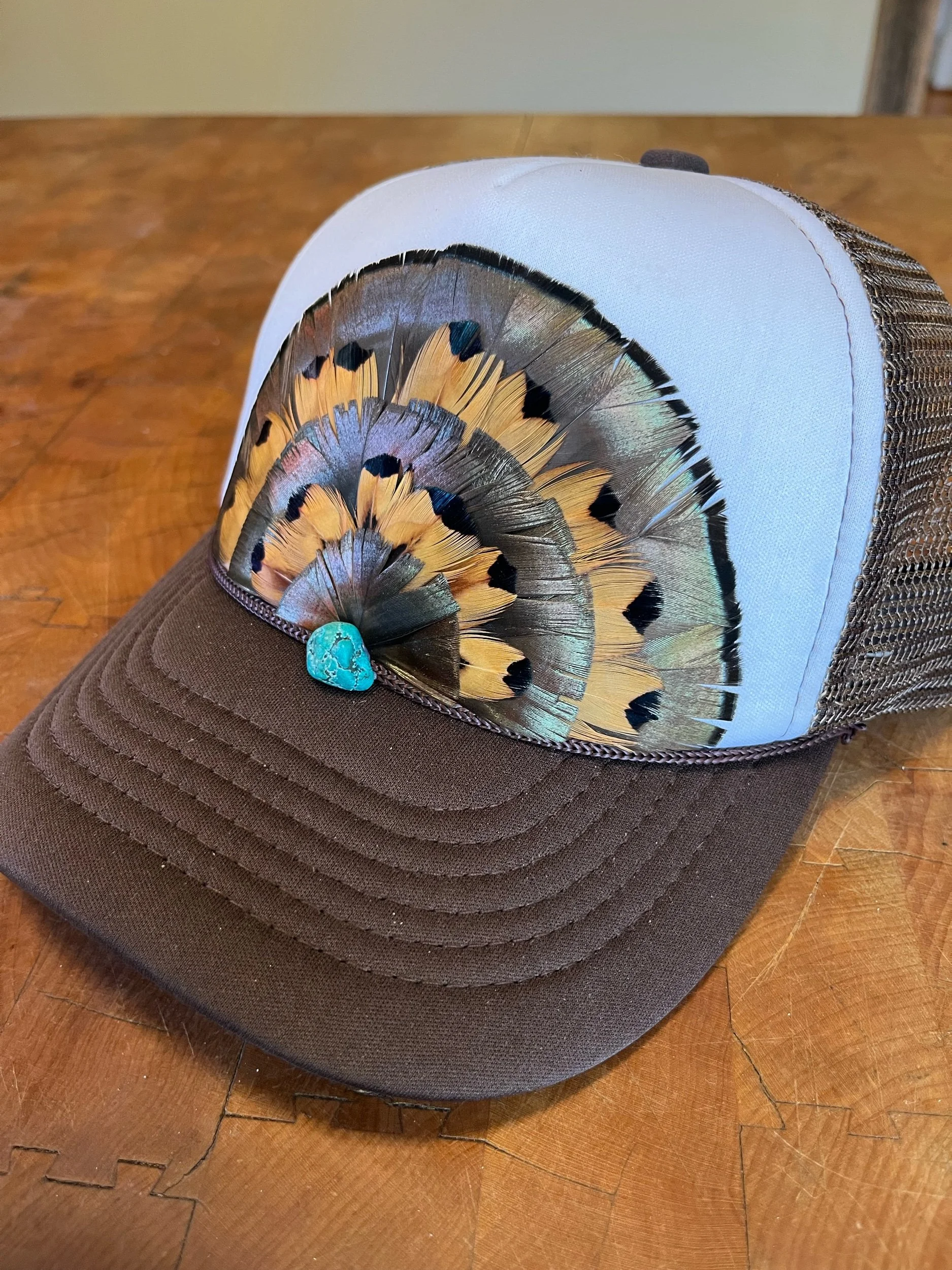Brown and white Otto mid crown feather trucker hat with layers of Virginia Turkey and Ringneck Pheasant feathers. Adorned with a turquoise stone.