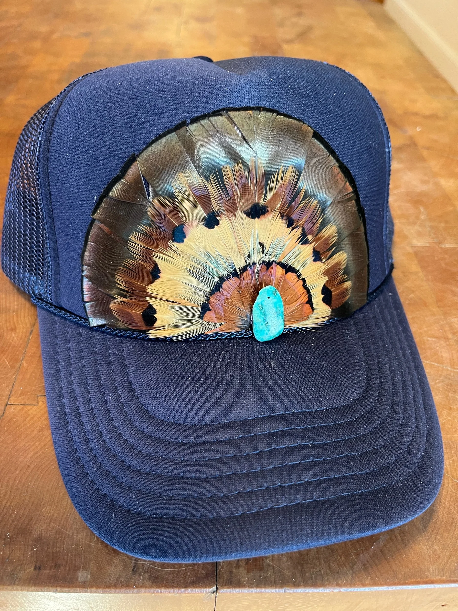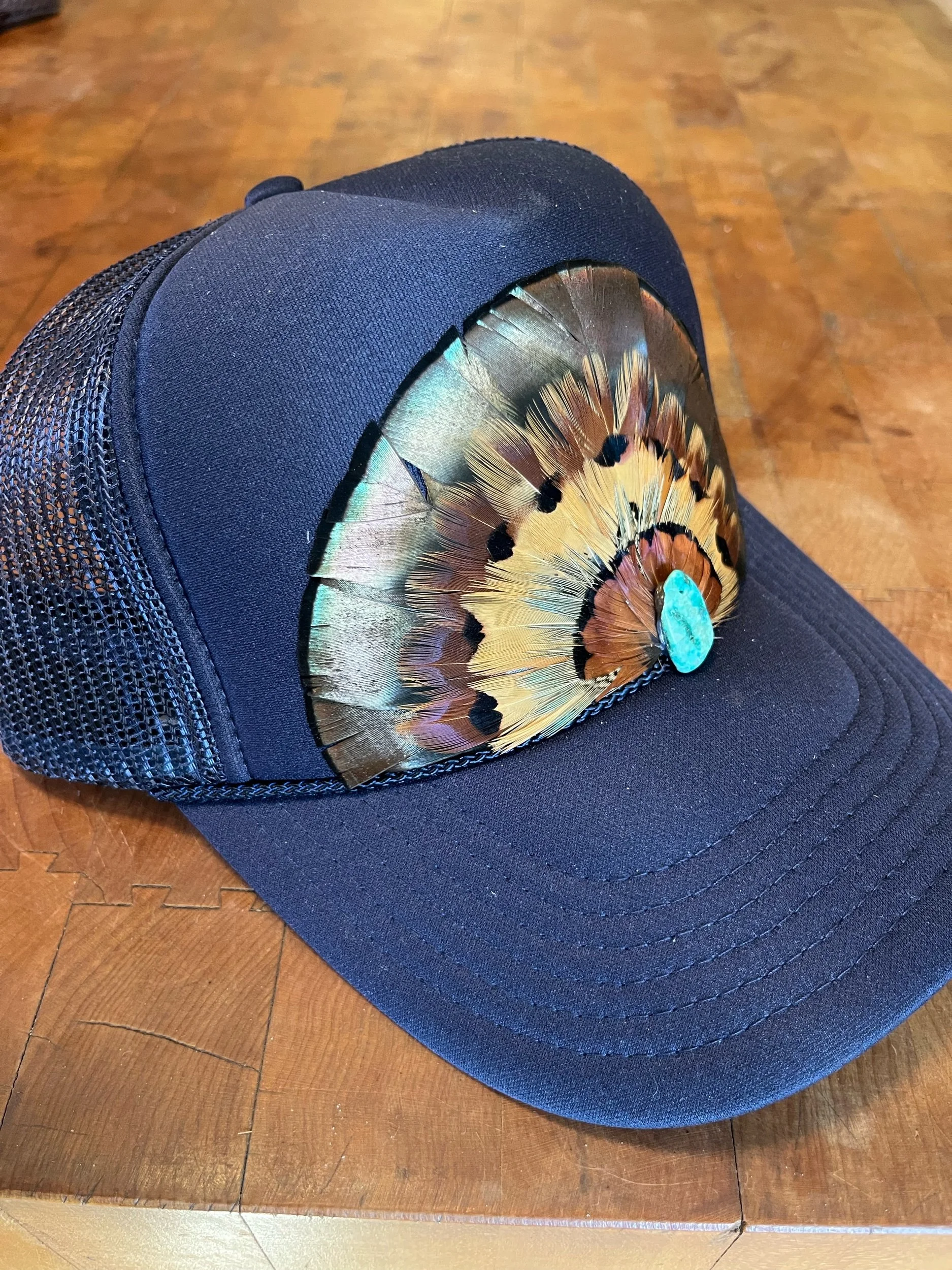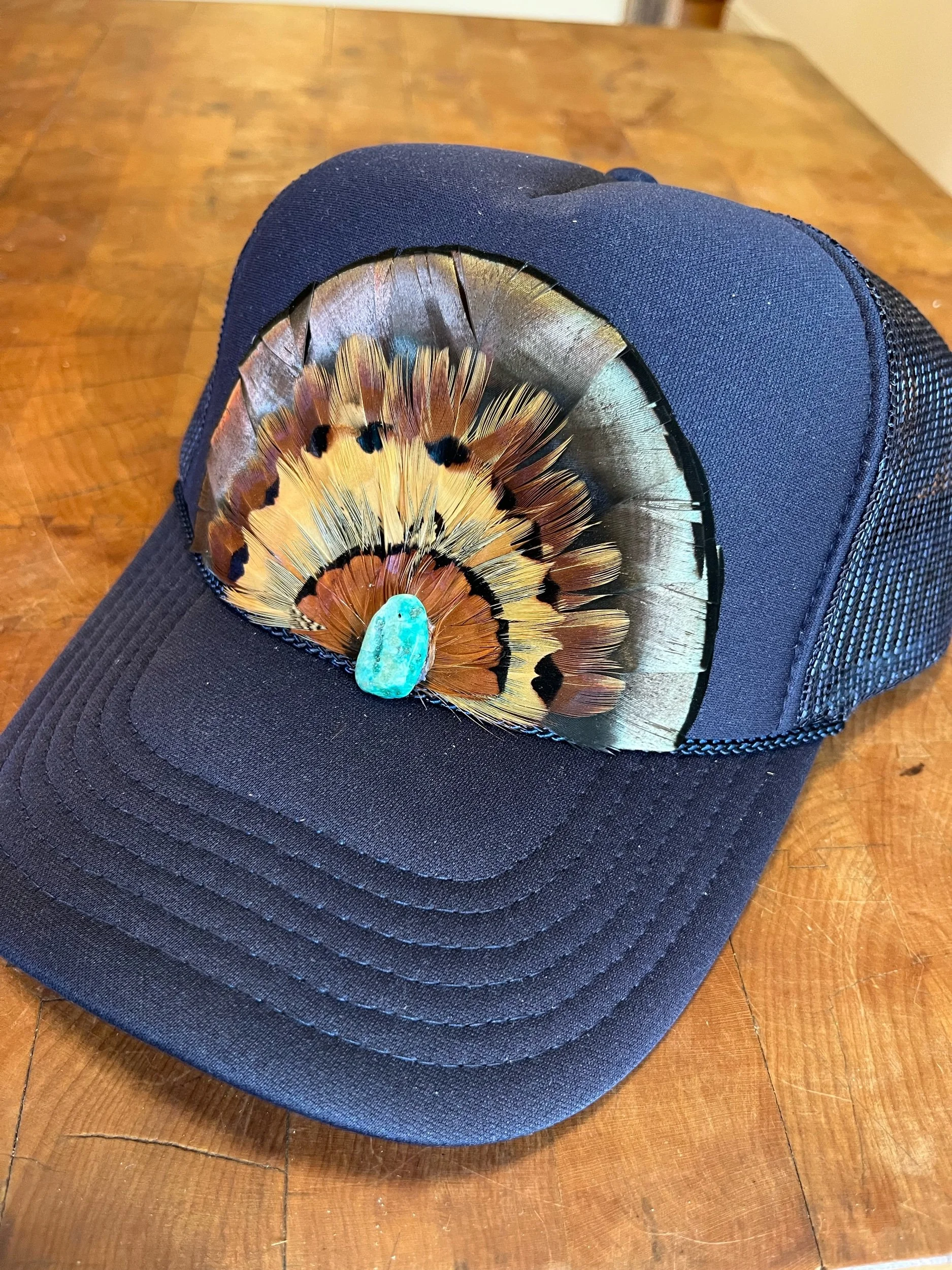 Navy Otto mid crown foam feather trucker hat with Virginia Turkey and four layers of Ringneck Pheasant feathers. Finished with a turquoise stone.