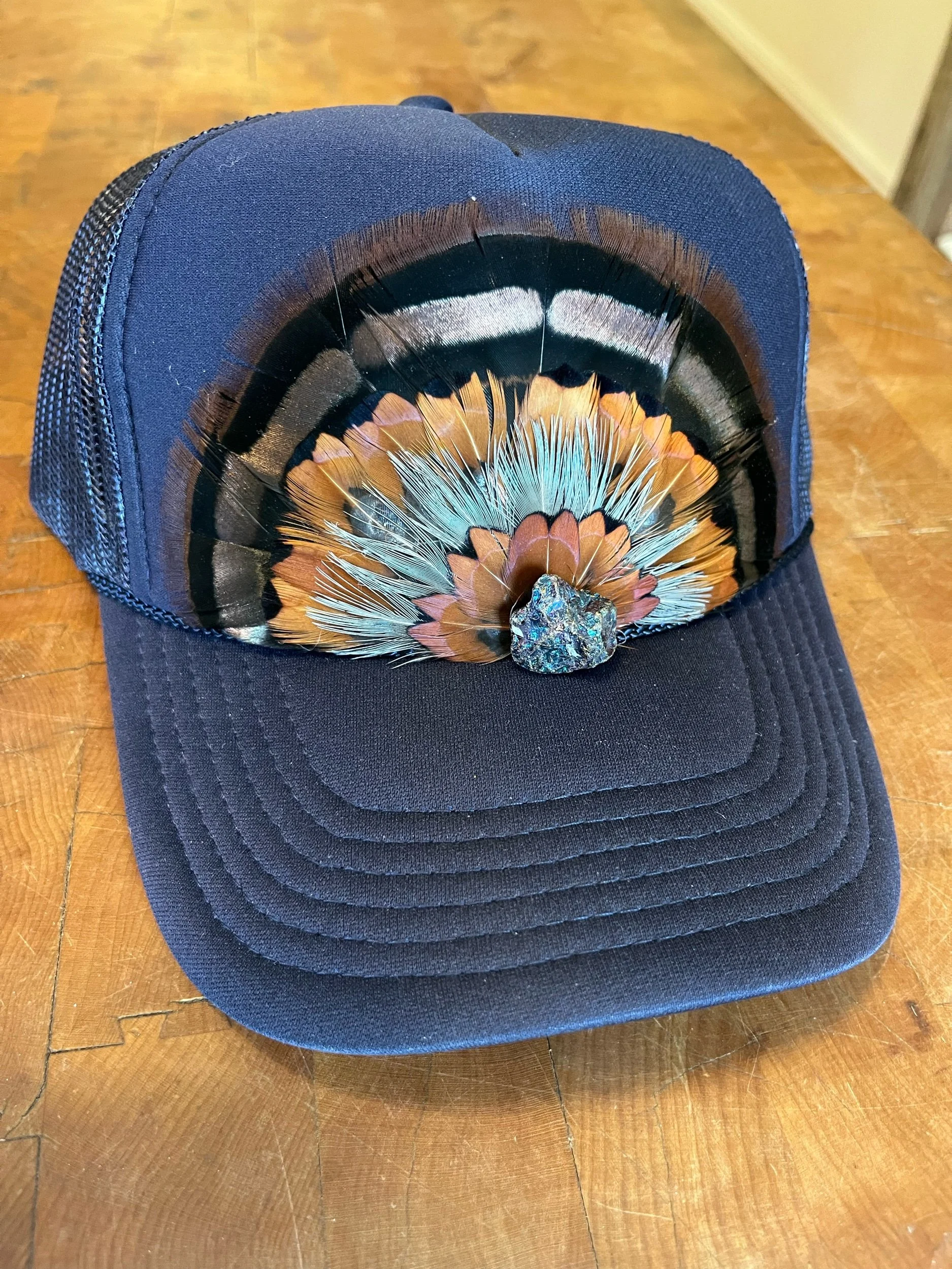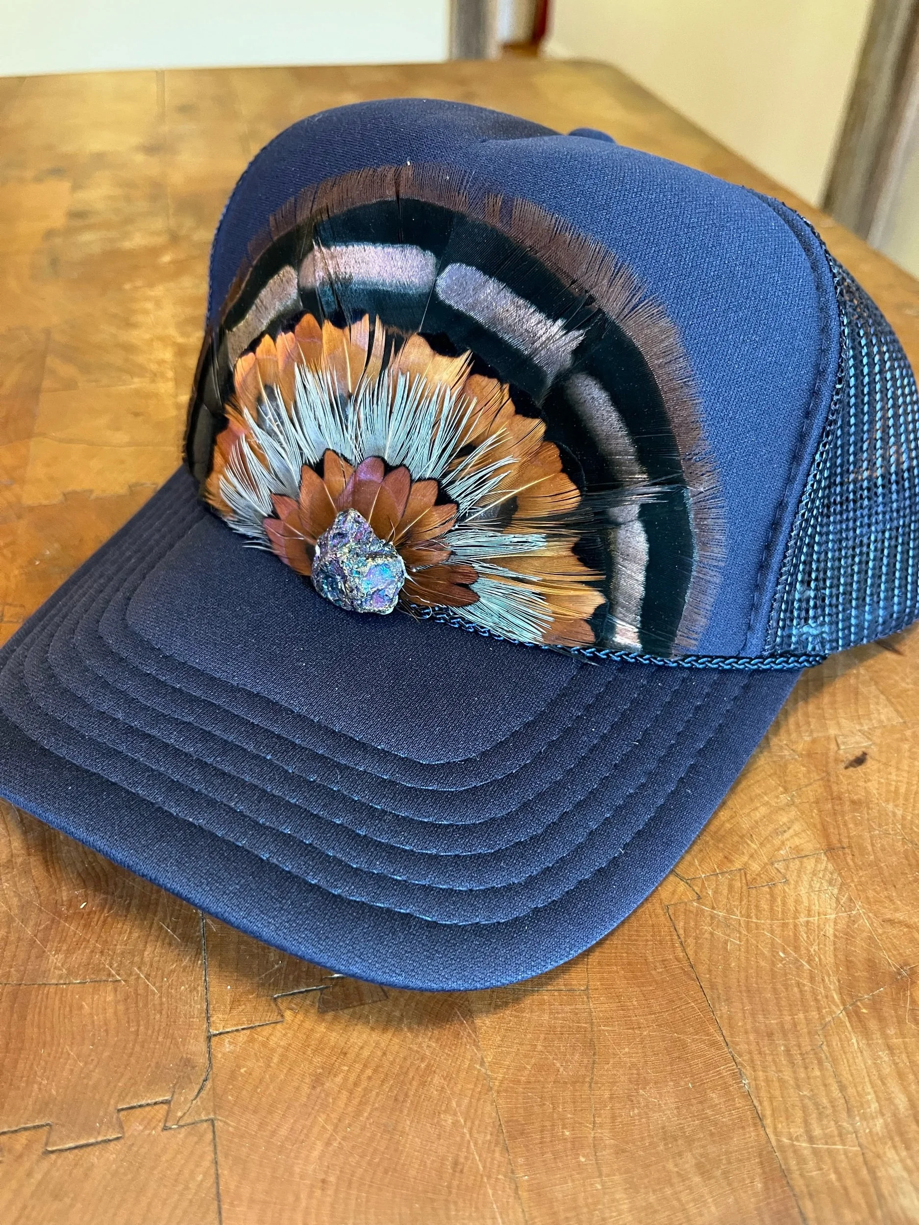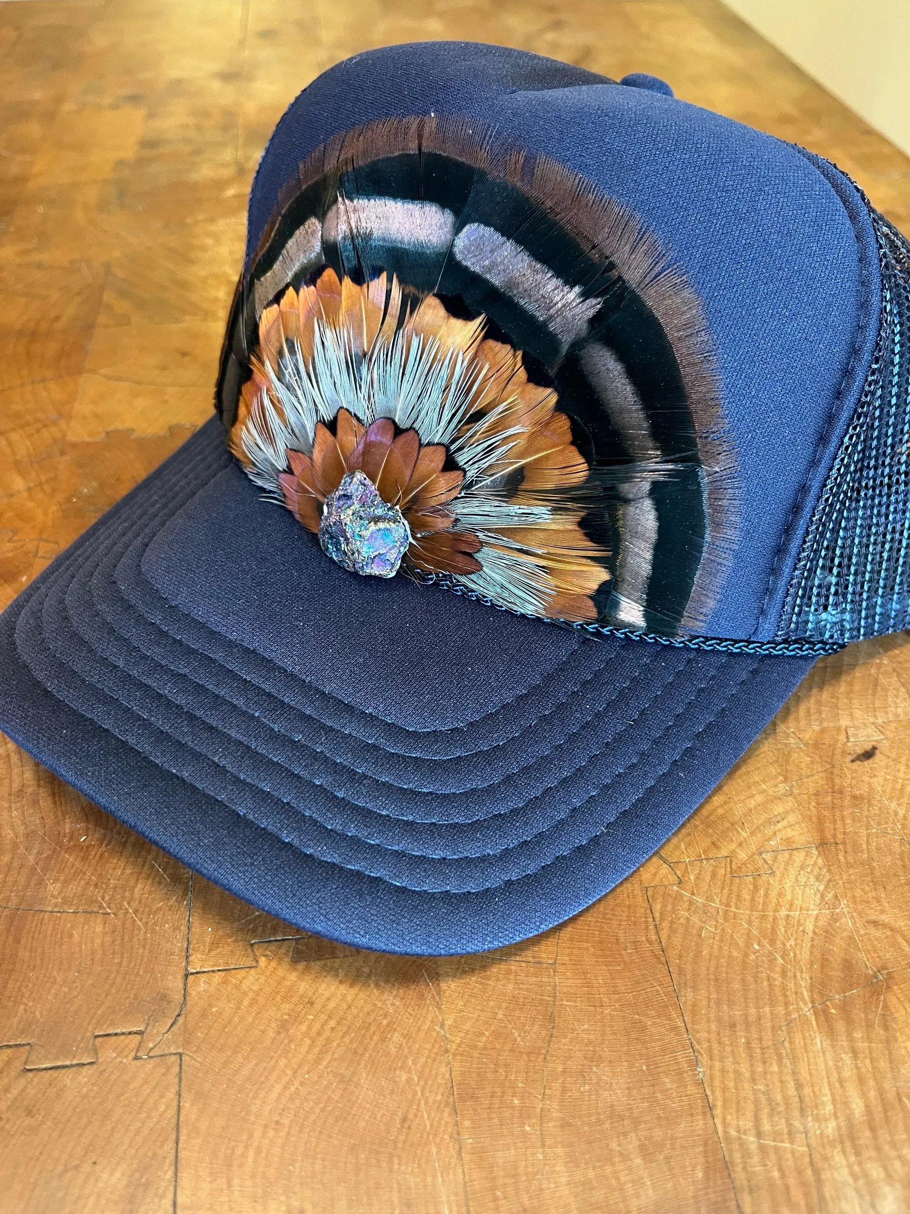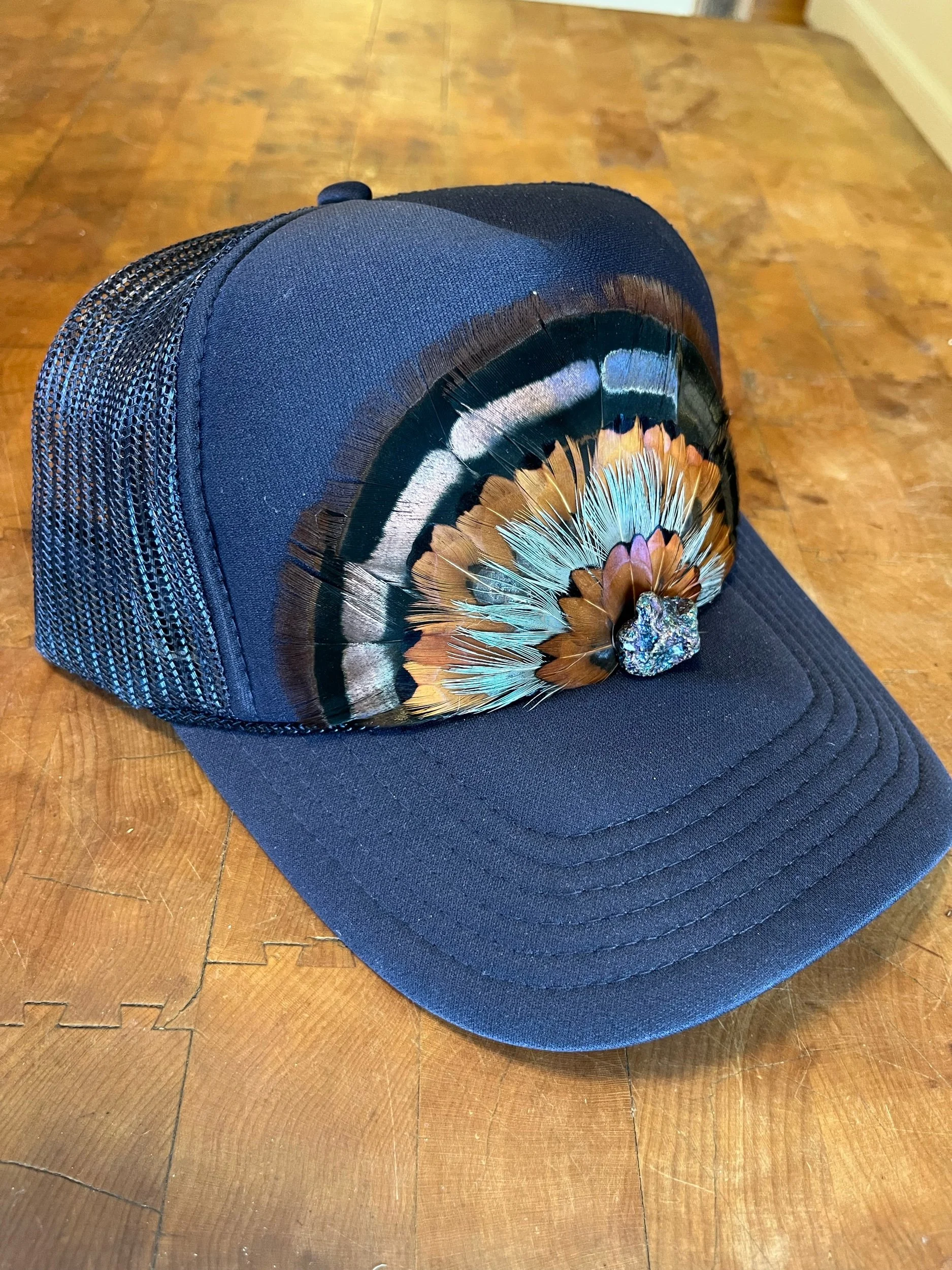 All Navy Otto brand mid crown foam feather trucker hat made with Virginia Turkey and Ringneck Pheasant feathers. Adorned with Titanium kyanite.