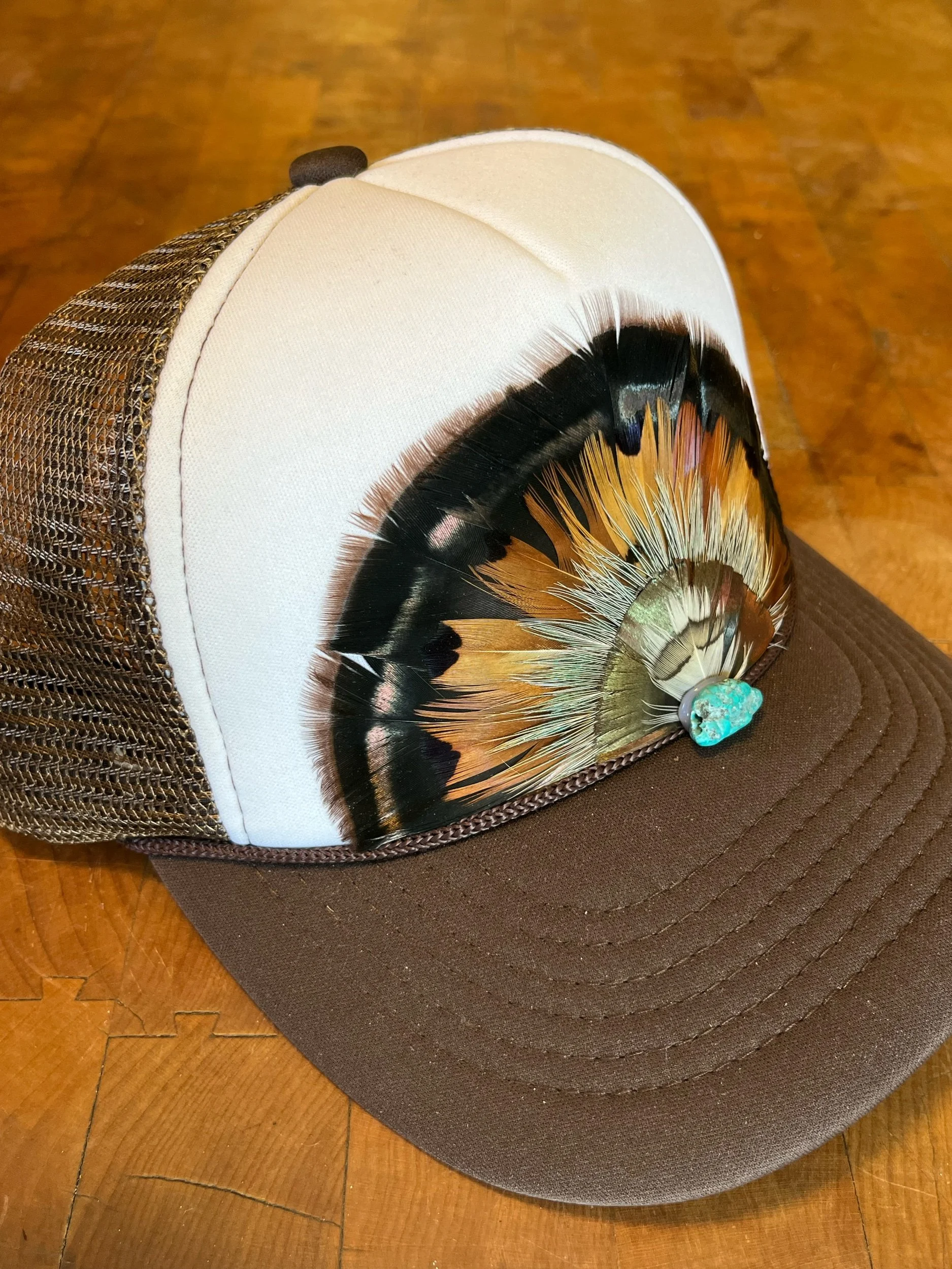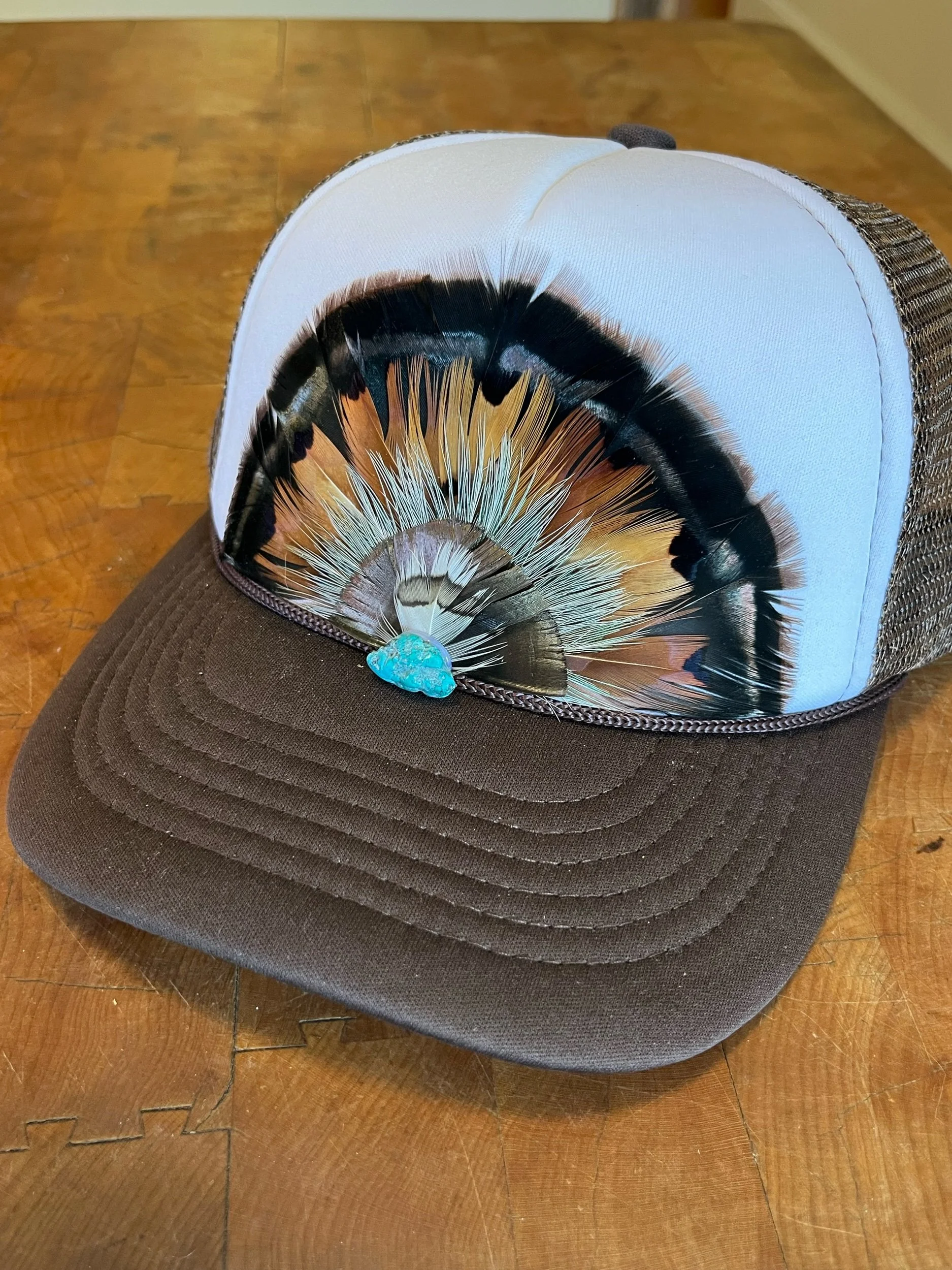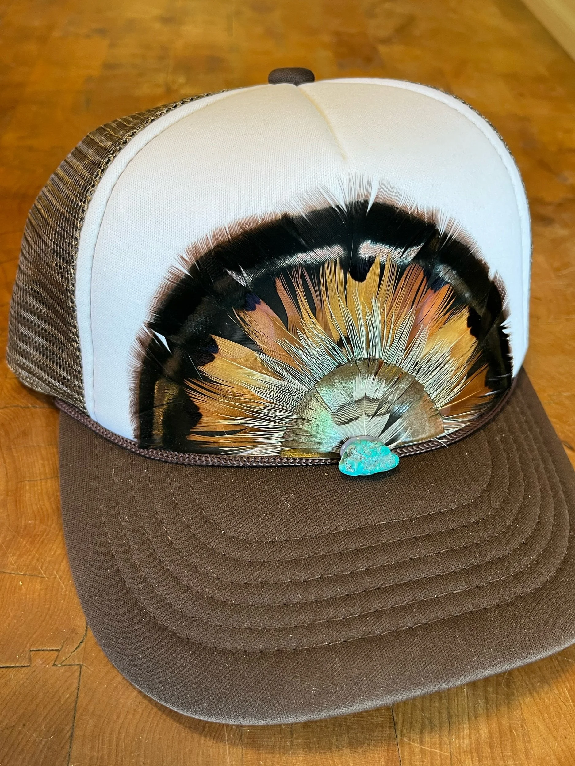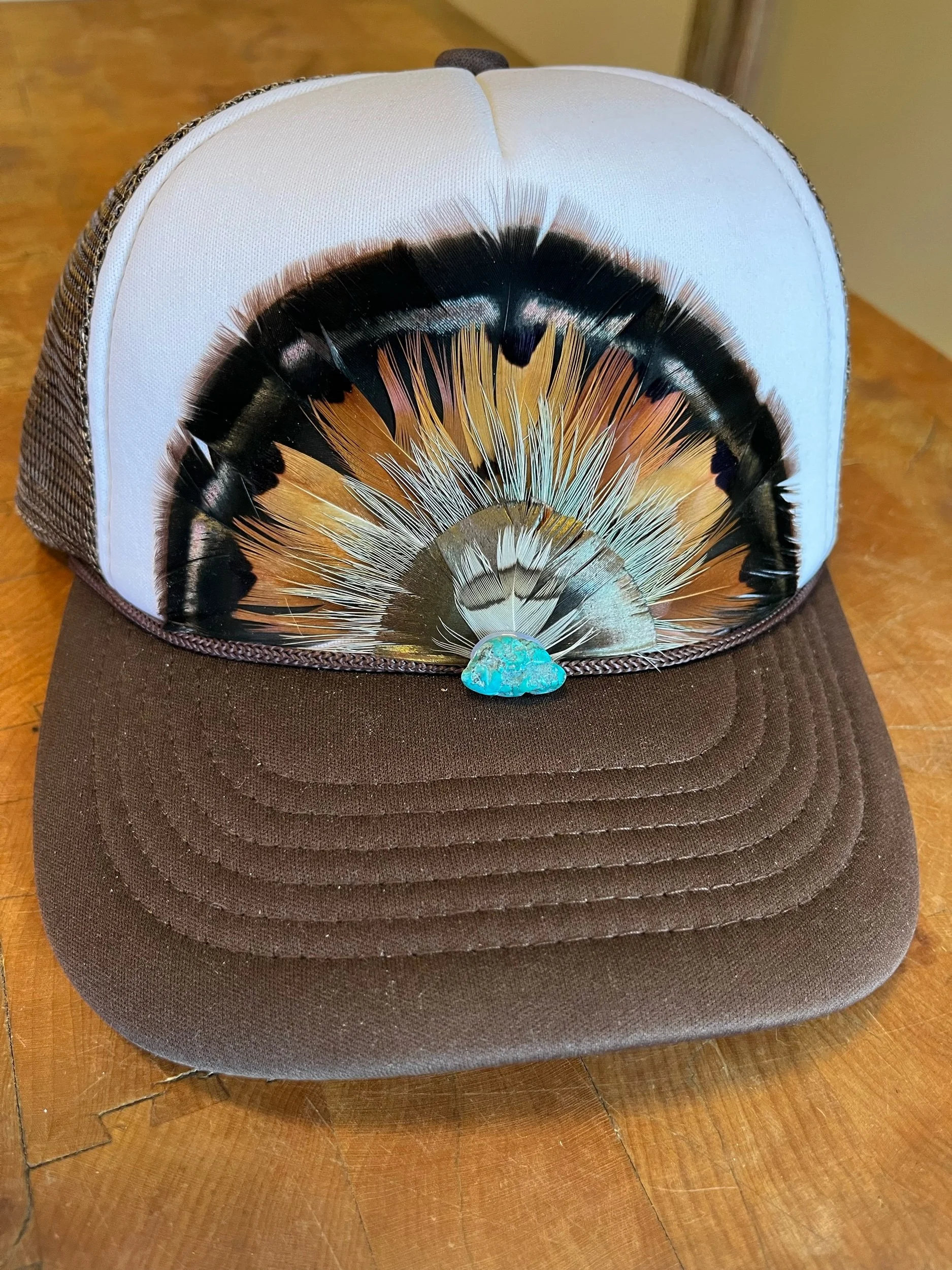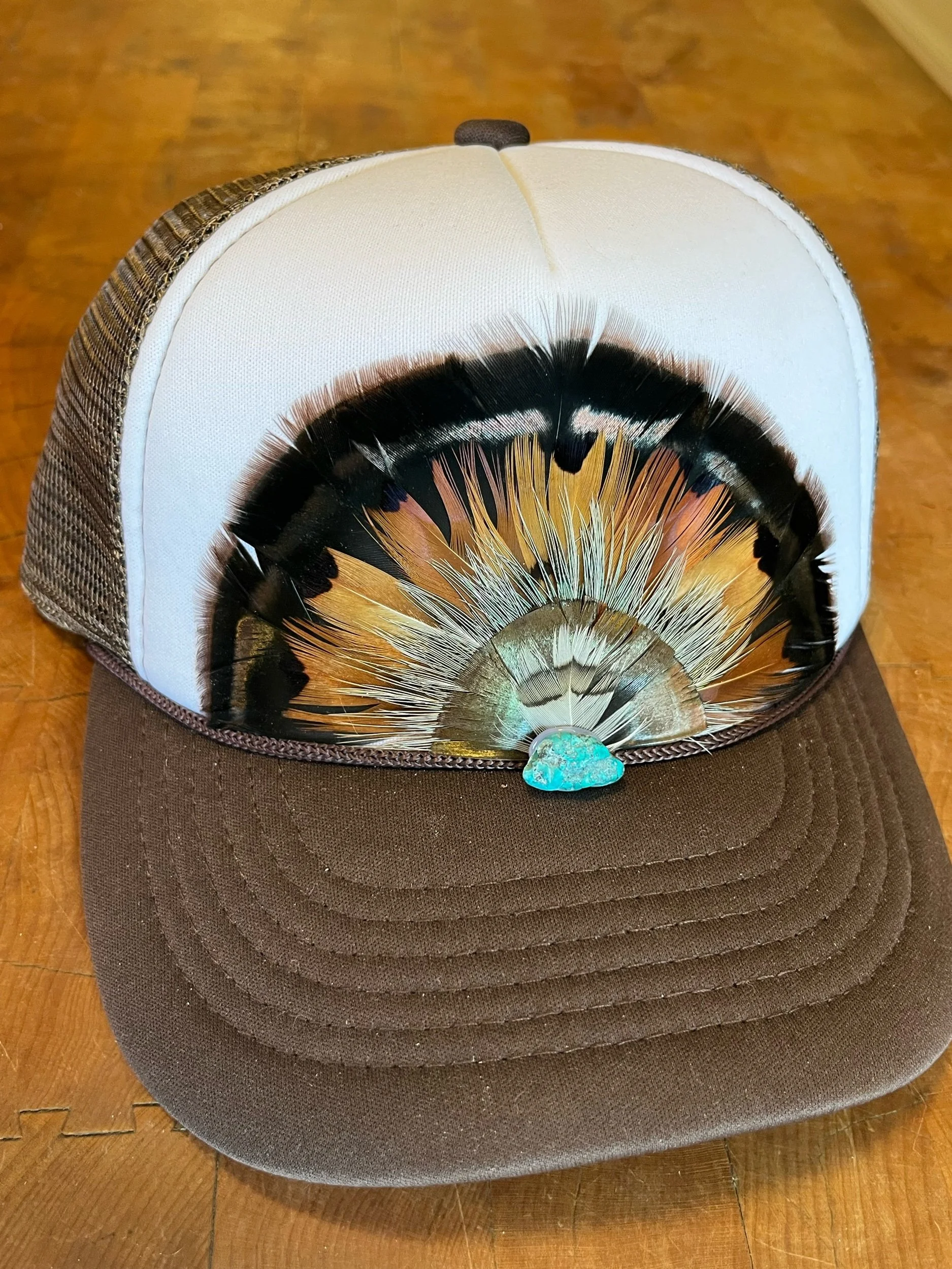 White and Brown mid crown foam feather trucker hat with Virginia Turkey, Ringneck Pheasant and Woodcock feathers. Finished with a turquoise stone.