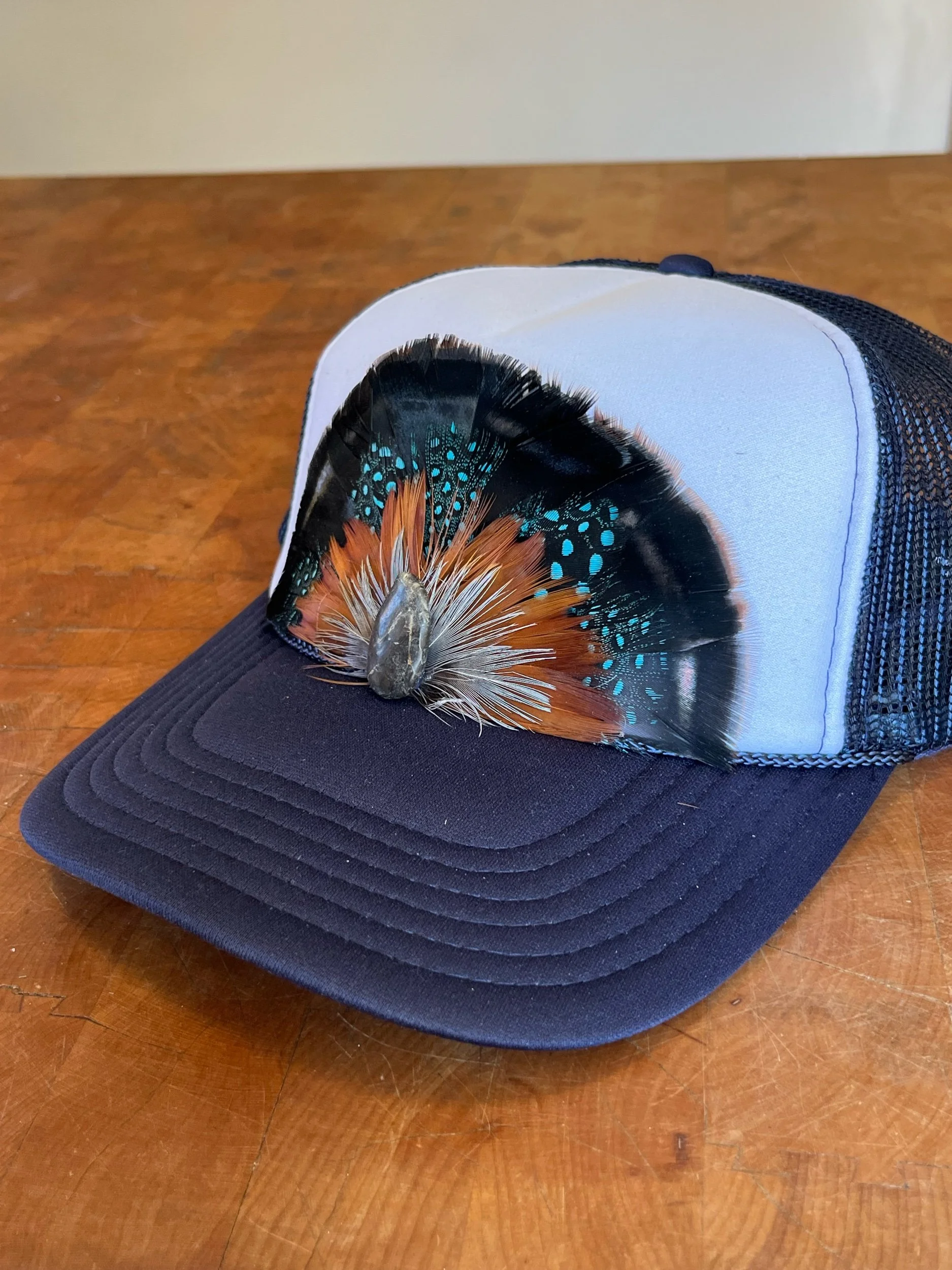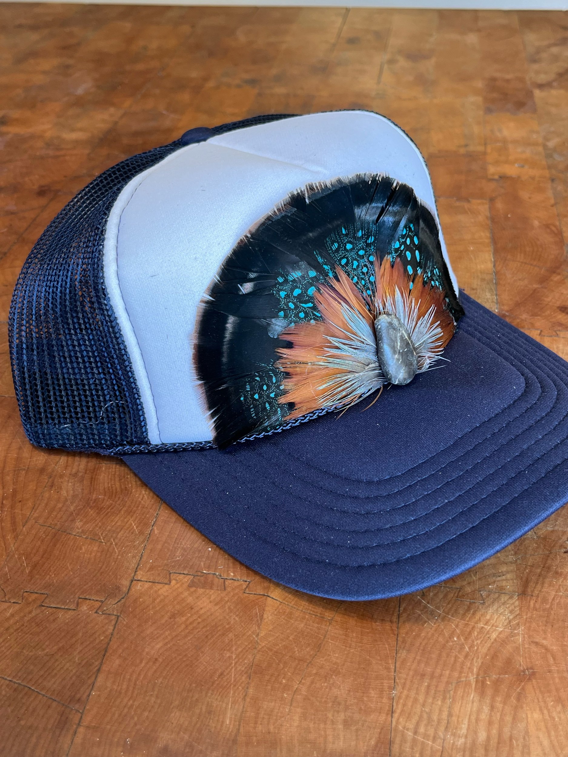 Otto Mid Crown foam feather trucker hat with Virginia Turkey, dyed blue Guinea and Ringneck Pheasant feathers. Finished with a polished river stone!